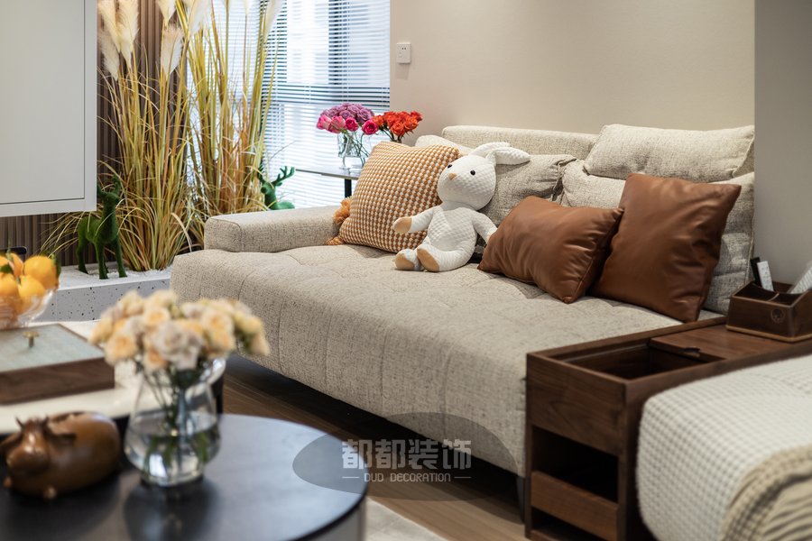 对于无法敲掉的承重墙,贺设计师用沙发与小边几的组合,巧妙构筑出一个弧形的半包围式沙发,与整个客厅充斥着的弧形元素呼应起来。棉麻质感的沙发,经典千鸟格图案,被可爱的动物玩偶包裹,躺在上面一定有着软乎乎的触感,幻化出甜蜜的梦,在梦里邂逅如同爱丽丝仙境般的奇妙幻想。