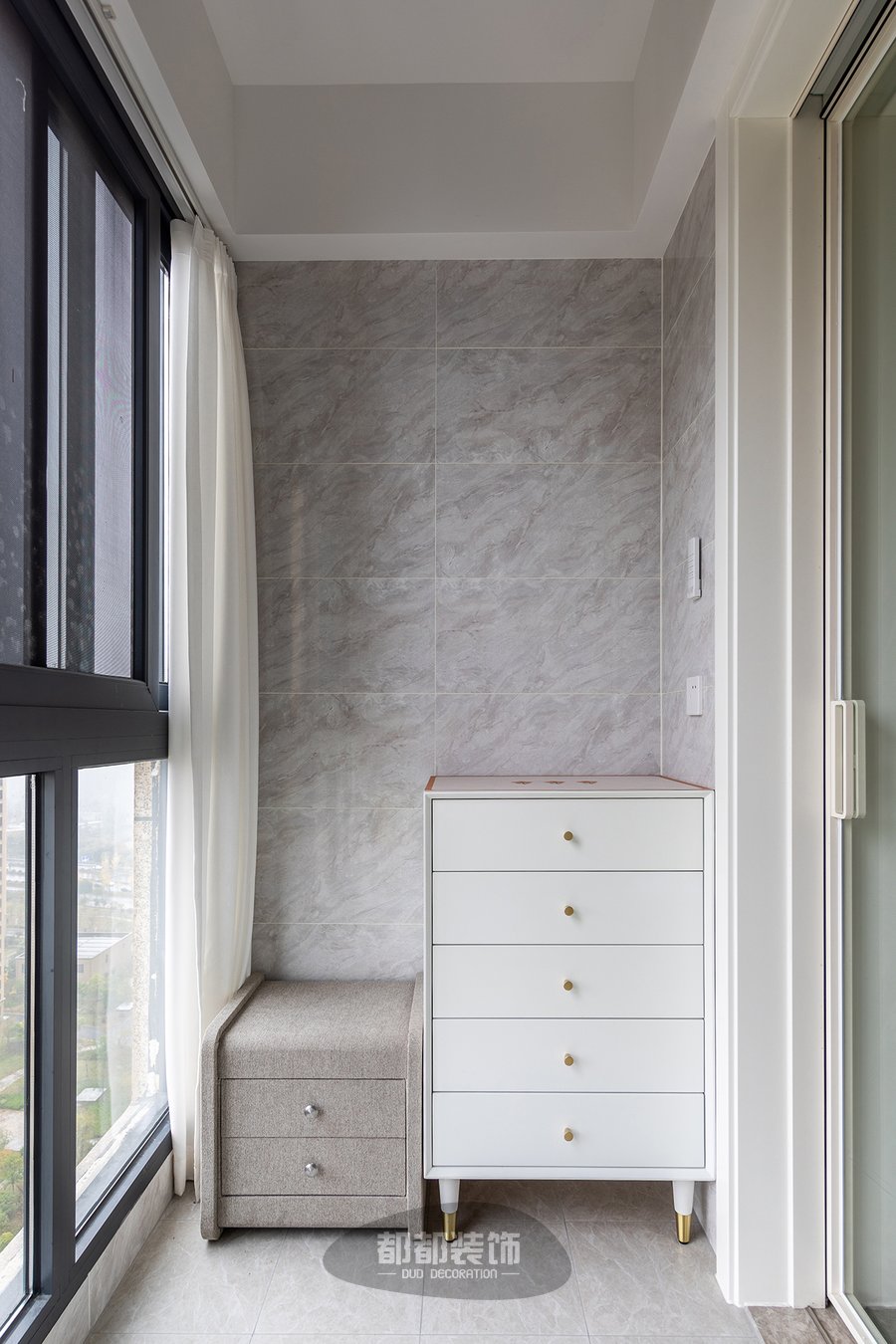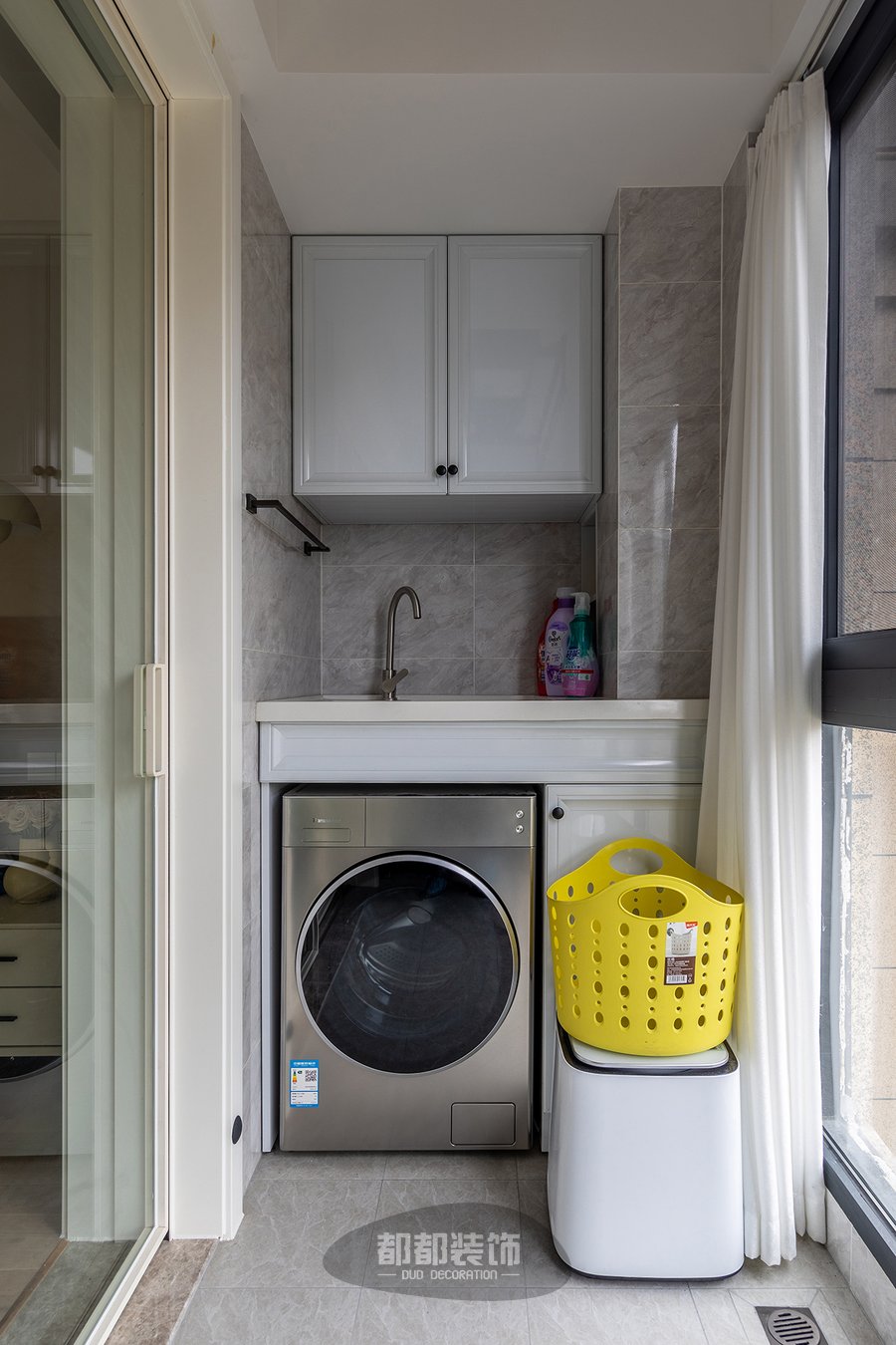 小阳台是非常实用的洗衣间+杂物间组合,嵌入式洗衣机充分利用空间,做吊柜和侧边柜能够收纳洗衣液、晾衣机等小杂物。阳台另一侧单独放置斗柜,增加收纳能力,家里不常用的杂物工具等都可以放在这里。