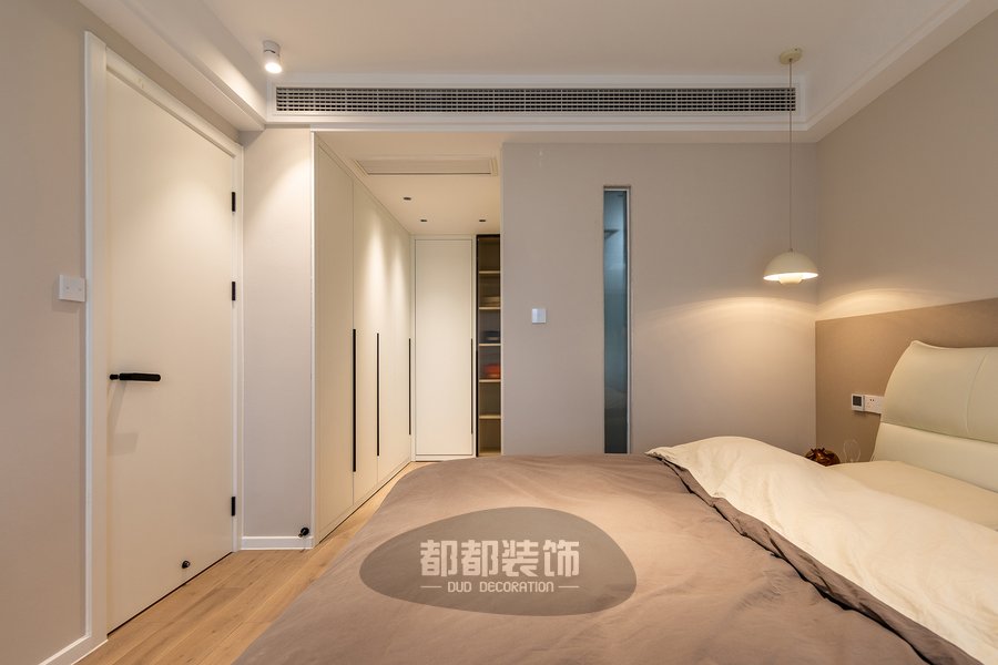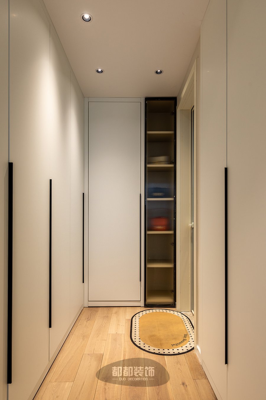 主卧空间相对来说还是非常充裕的,所以设计师一开始就提出缩减主卧卫生间面积,加个衣帽间进去。极简风的衣柜仅用黑色线条窄边把手作为装饰,清爽干净,侧边用黑色碳素条+玻璃打造包包展示台,防潮防灰。