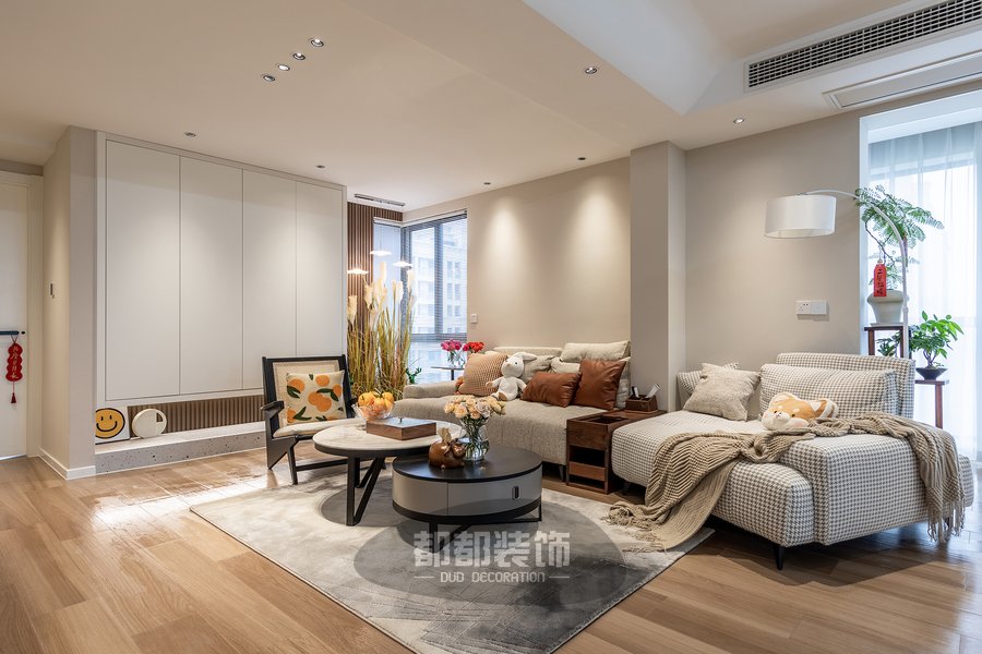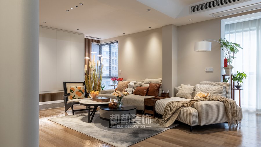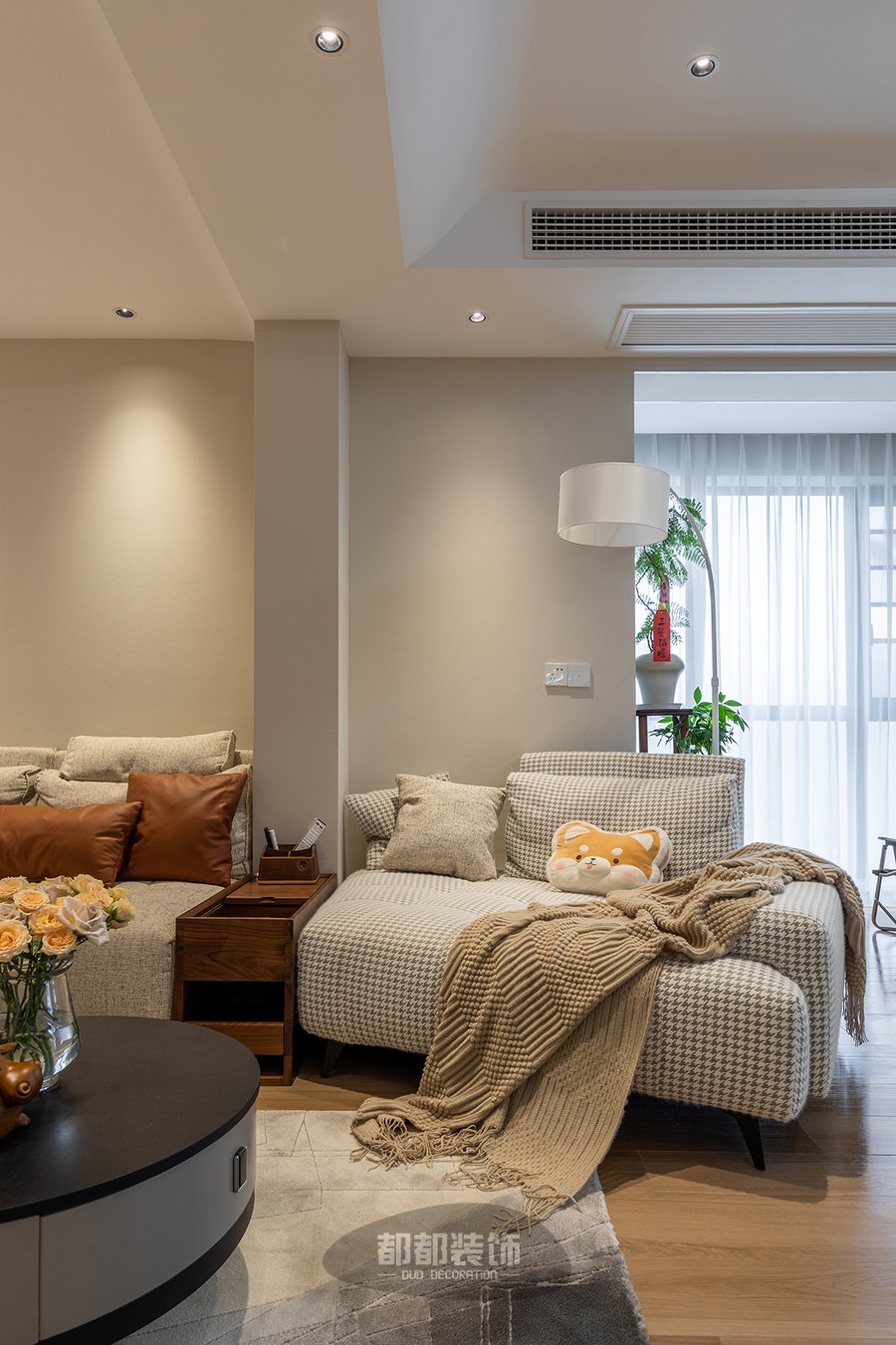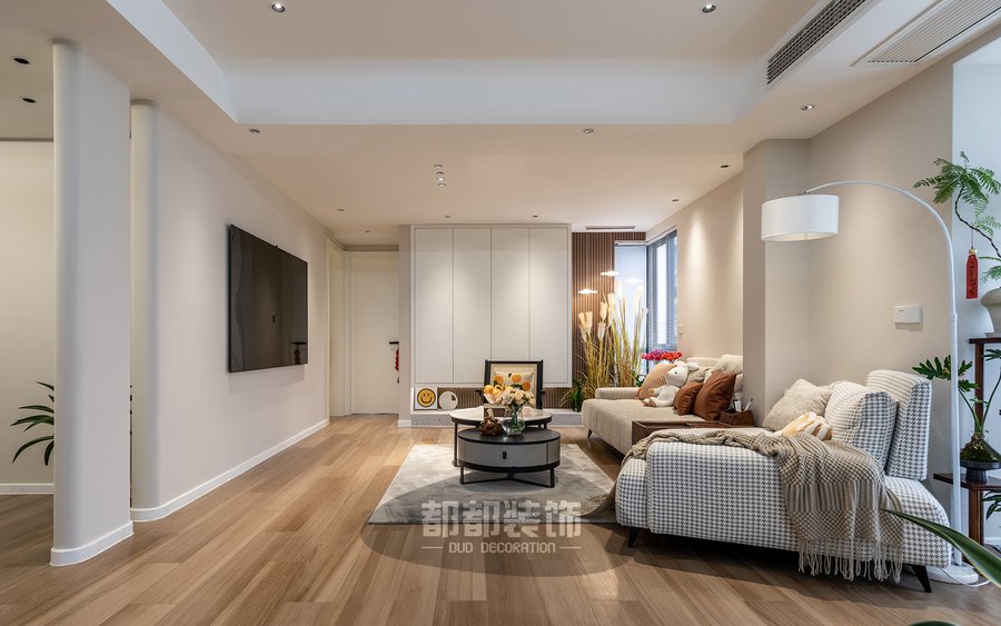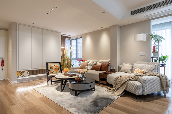 苏女士家的客厅充满着大片的暖色调,工字拼贴木地板与大面积的奶杏色墙壁组成最佳CP,构成整个客厅自然质朴的风格基调。无主灯设计干练简洁,射灯映照出来的暖色灯光则为整个客厅增添了几分温馨舒适。