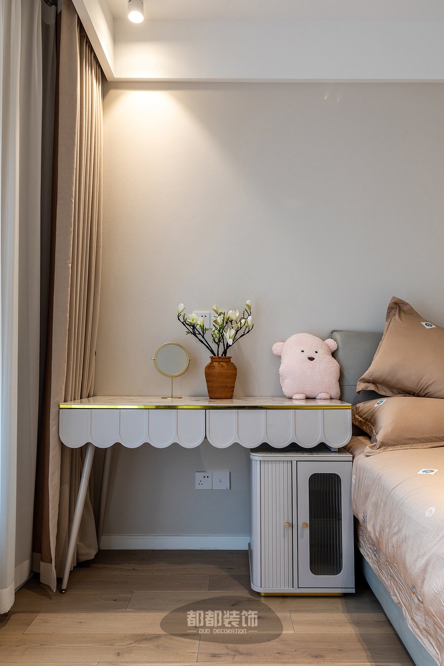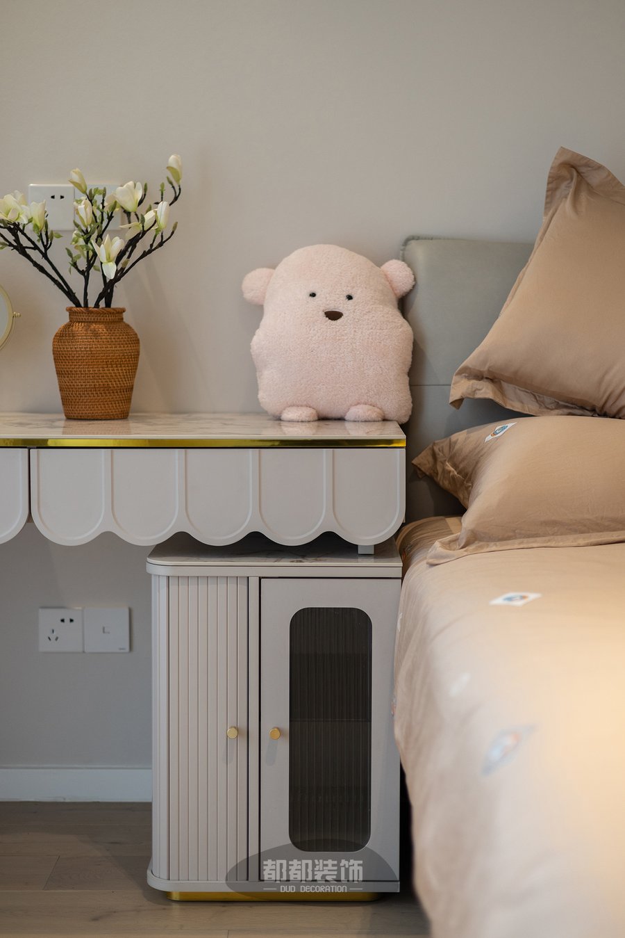 毛茸茸的粉色小熊抱枕乖巧地坐在桌面,白色金边包边桌子轻奢感十足,拱形抽屉和罗马柱纹床头柜则为空间注入满满的法式复古风,藤编花篮里斜插几支玉兰,仿佛一幅误入21世纪的中古油画。