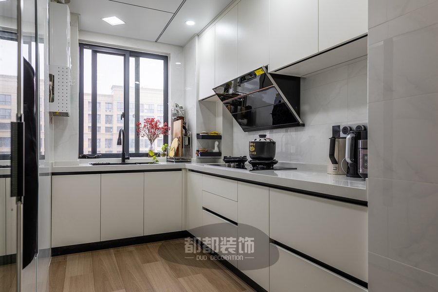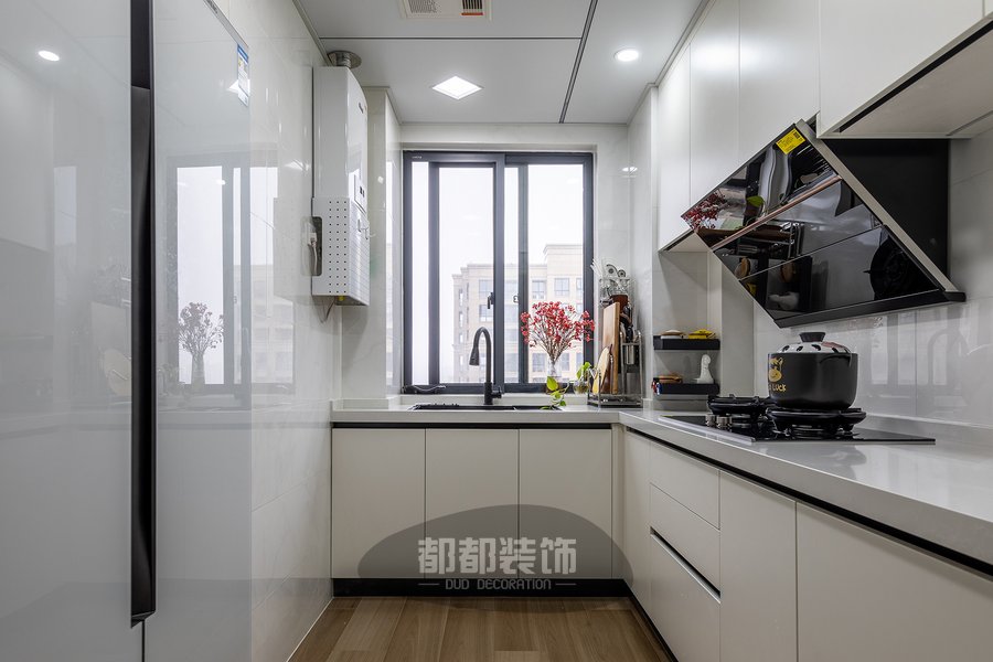 厨房与餐厅之间使用双扇吊滑门隔断,适用于中式烹饪。厨房整体是实用性很强的L型布局,空间利用率与操作便捷性全部拉满,奶白色橱柜+原木色地板与整个家的格调保持一致,看上去简约大气,窗台上简单的一束鲜花就能给予烹饪者一个抬头的好心情。