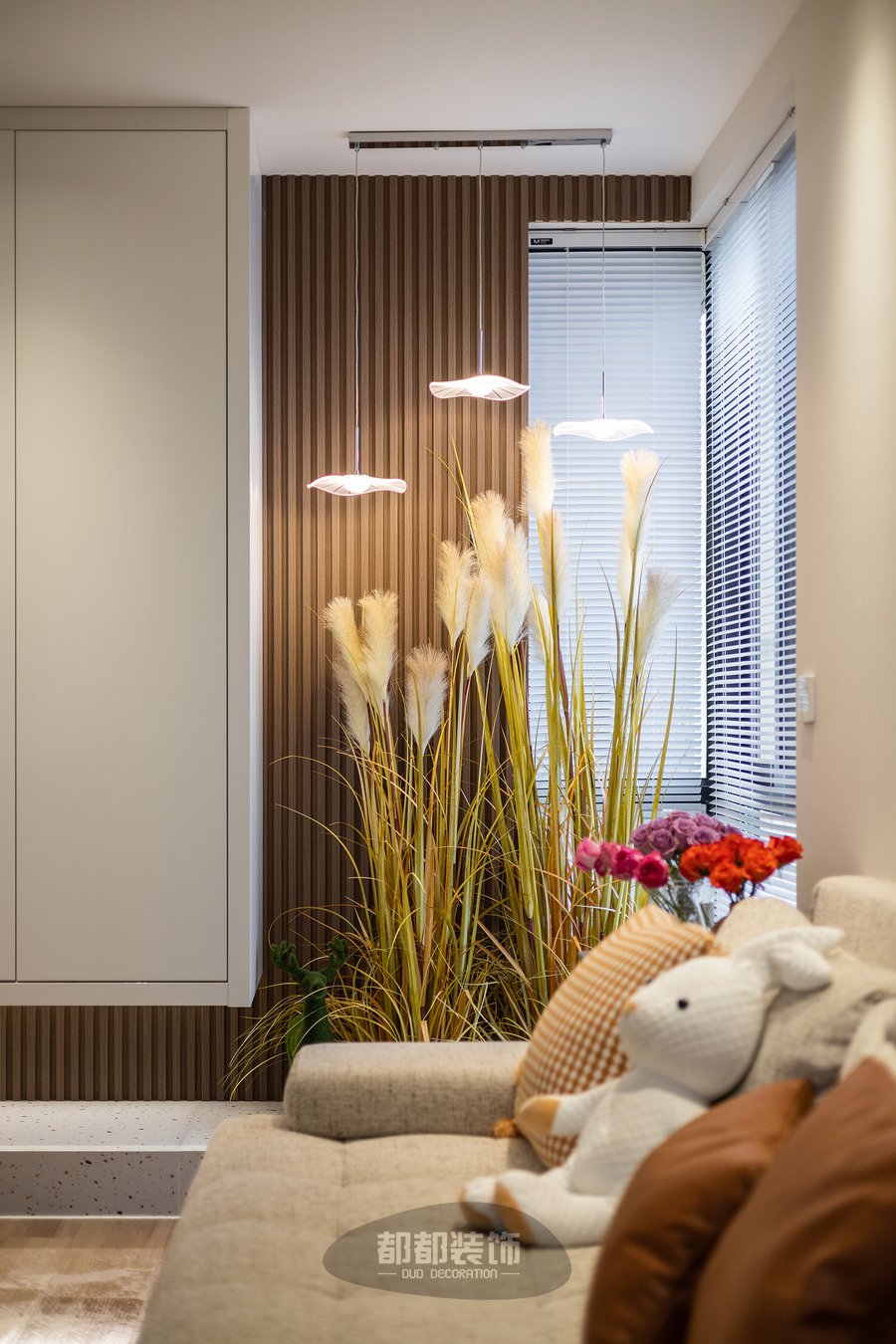 生活中最平淡的幸福,来自于仪式感满满的每一餐,休假时的苏女士喜欢自己动手完成每一餐中的一蔬一菜。一家人围坐在餐桌旁,温言细语的叙述白日里发生的琐碎小事,木质餐椅搭配棉麻软垫,是藏在细节里对生活的热爱,吊灯灯罩由暖黄色木片拼接而成,映出温润的暖黄色光线,温馨感十足。这一刻,幸福唾手可得。