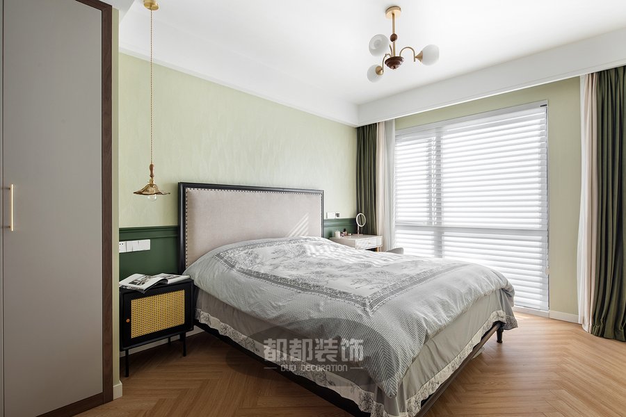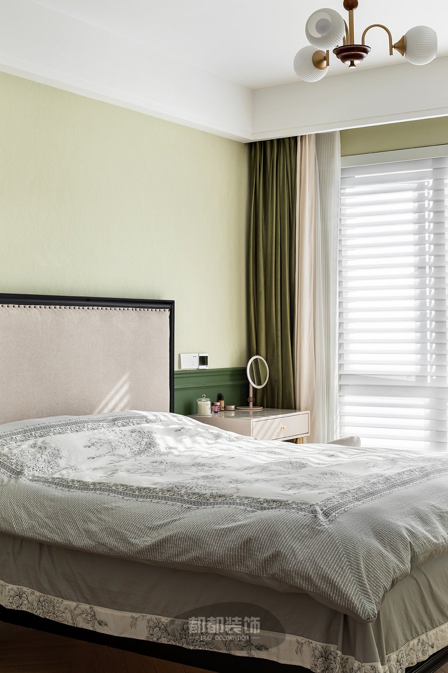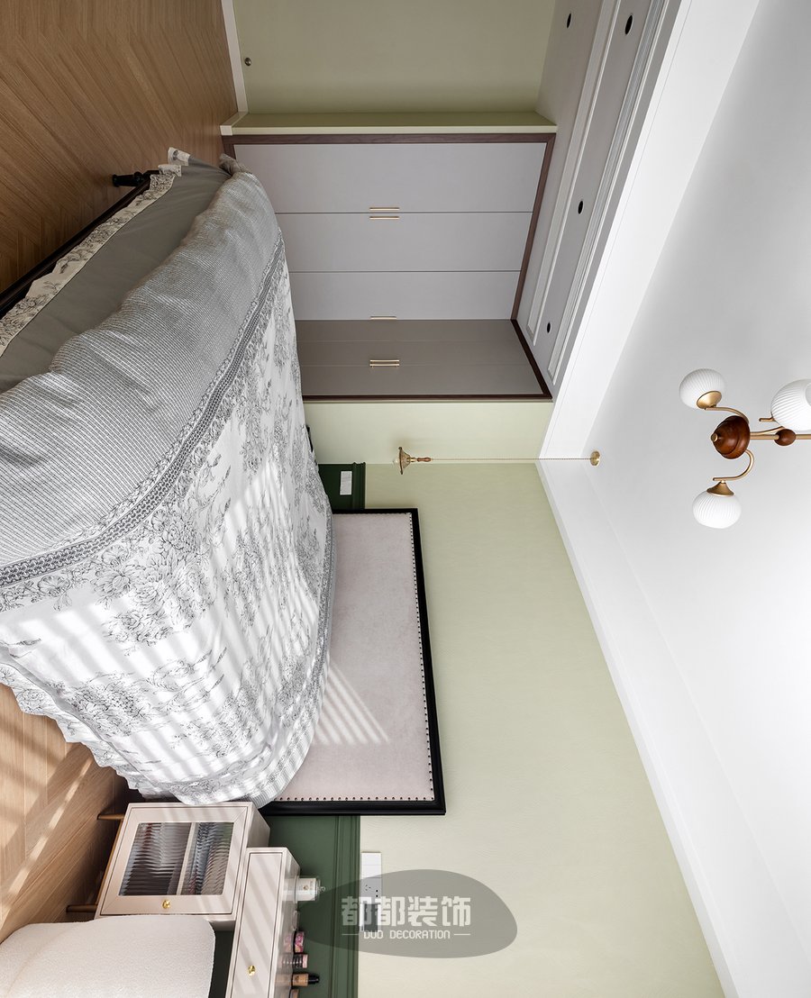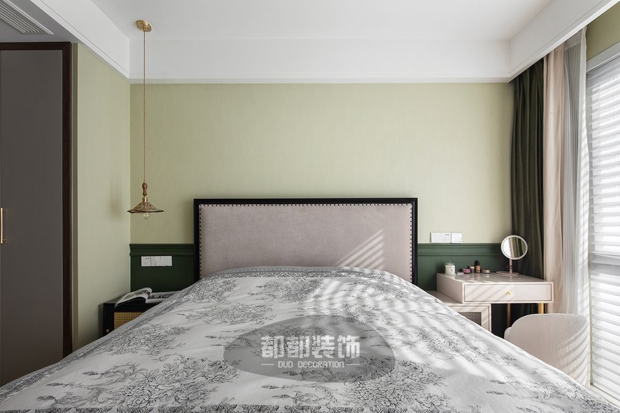根据夫妻俩的要求,卧室用了比较清新、舒缓的色调,为睡眠提供优质环境。复古绿+浅豆绿拼色墙壁,琉璃床头灯雅致温馨,躺在柔软的大床上,也会梦到开满玫瑰的女巫花园吧。卧室舍弃卫生间,让空间看上去更宽敞,也增加了衣柜容量,女主人再多衣服也装得下啦!