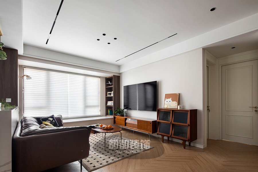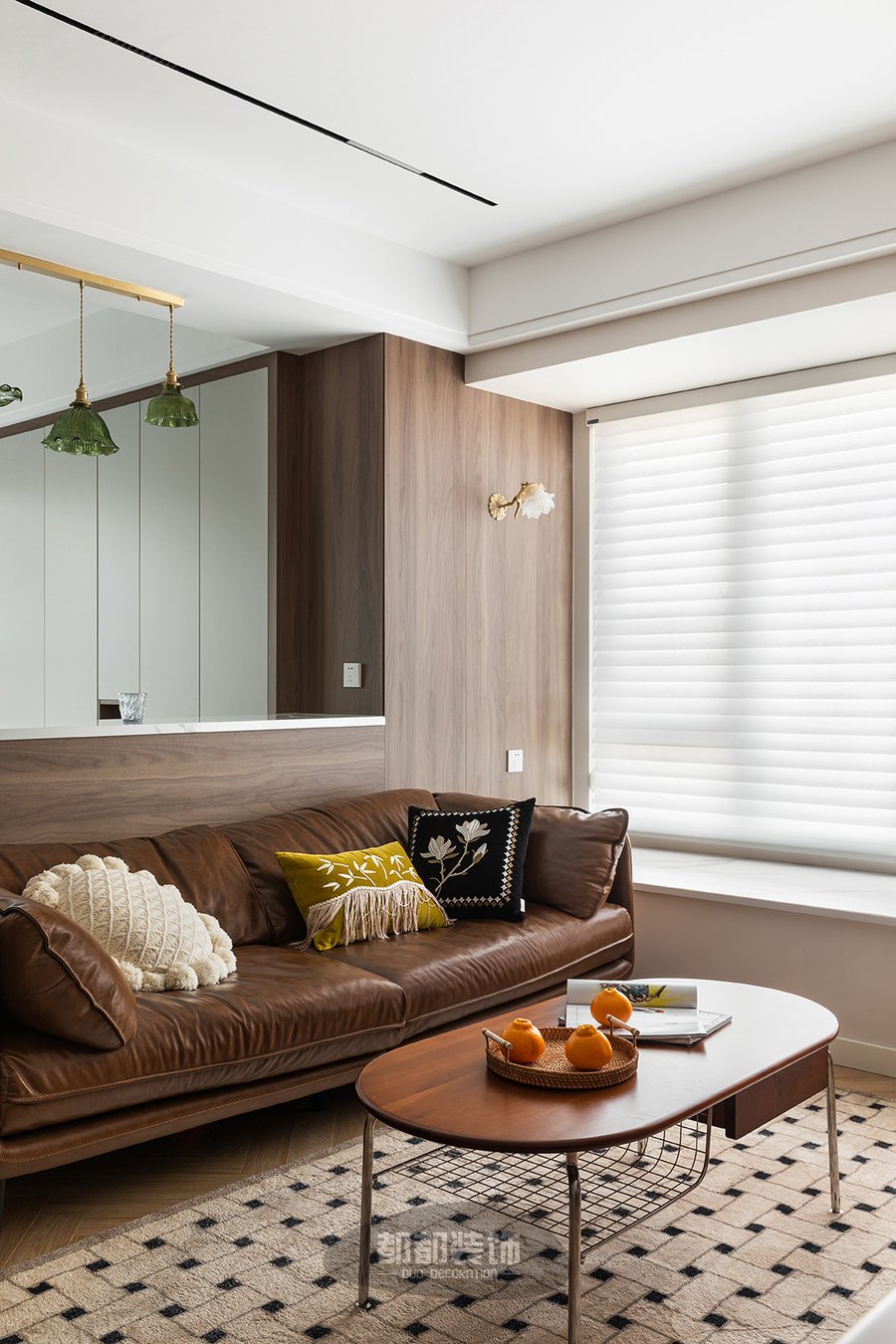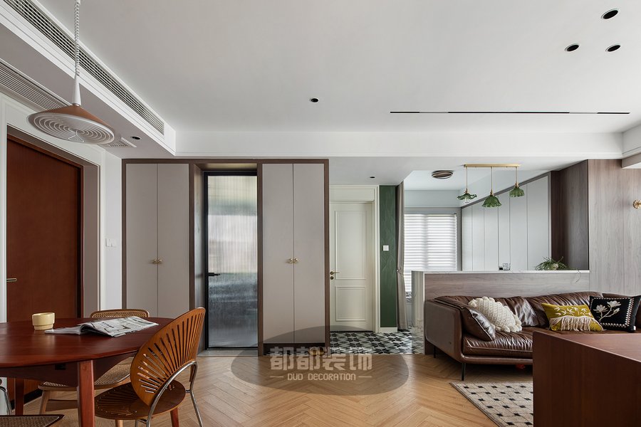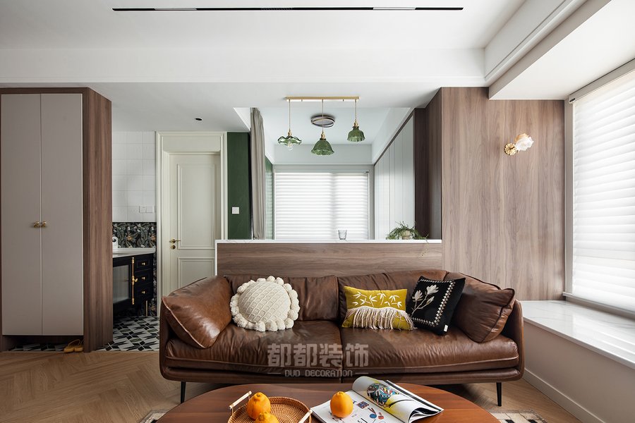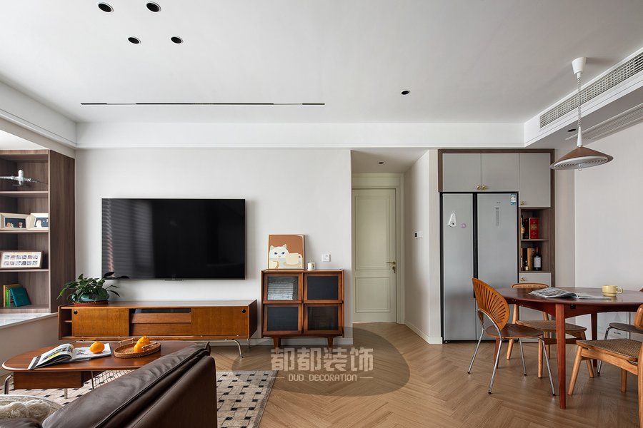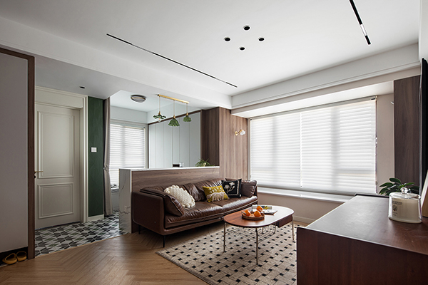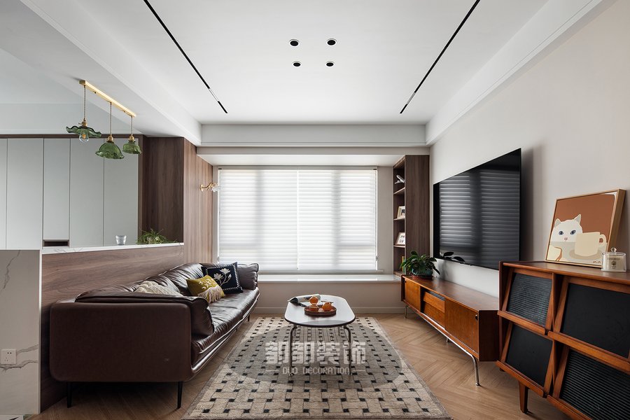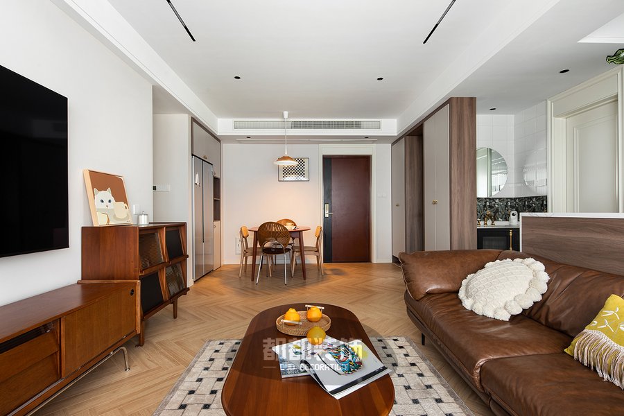 一推开门浓郁的中古风情就扑面而来,长虹玻璃矮脚柜、北美黑胡桃木电视柜、巧克力色皮质沙发、金属细腿小茶几、短毛地毯,这几个元素组合在一起,浓浓的胶片感满溢出来,仿佛能瞬间穿越美式复古电影;铃兰花灯具则为空间注入一丝甜美。
