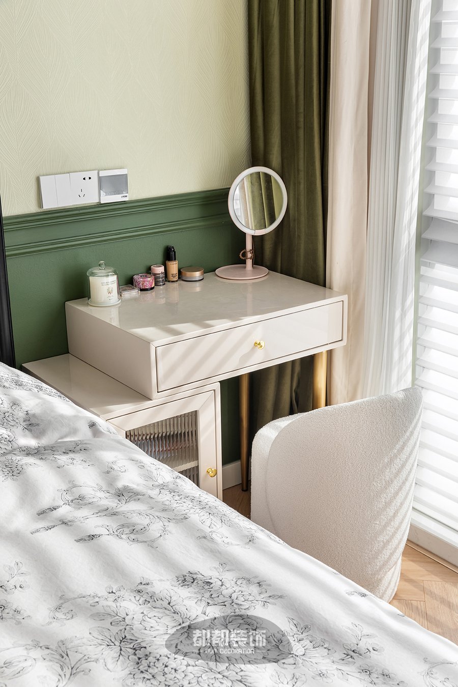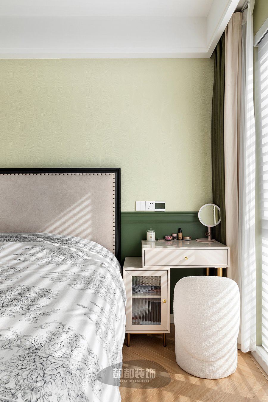 主卧窗帘也采用了拼色设计,梦幻帘是为阳光蒙上柔和滤镜,洒满一室的朦胧温柔。一侧床头柜改成梳妆台,白色组合柜+软包座椅精致感满满,金属元素的点缀更显大气,早上起床在这里美美撸个妆,开启元气满满的一天吧!