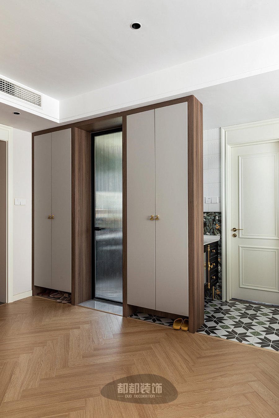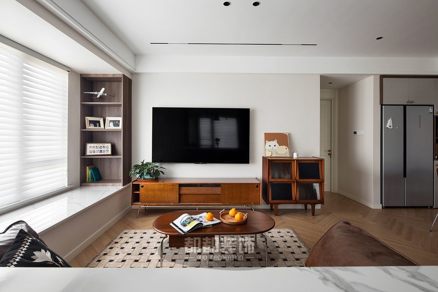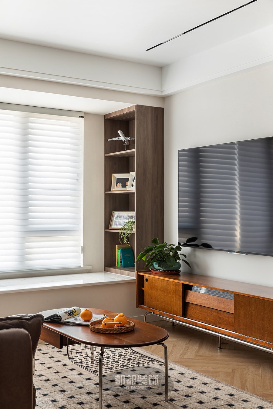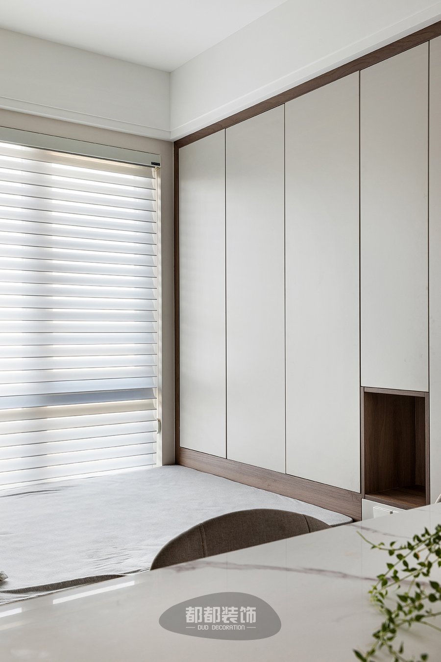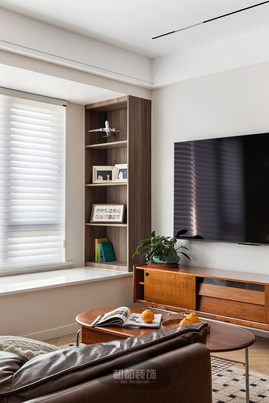设计师为天生精致浪漫的女主人保留了飘窗的设计,靠墙角增加一排顶天立地的开放式收纳柜,放上摆件和相框,闲暇时候夫妻两一起坐在这里,沐浴着温柔的阳光,一起重温照片里的美好瞬间,这就是平淡日子里的闪光点。