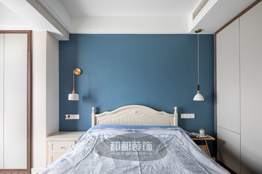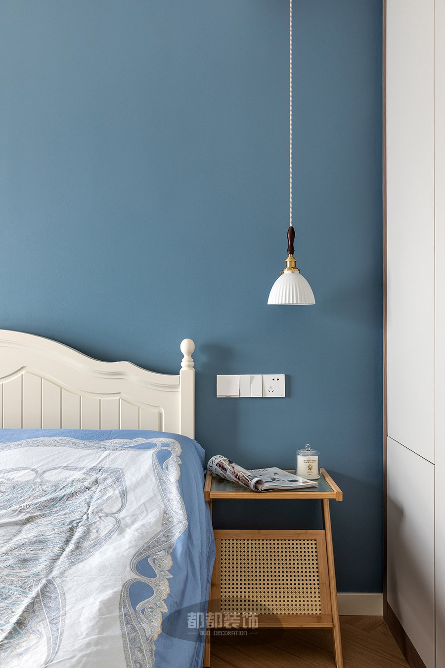 次卧是清爽的海蓝色与简约白配色,仿佛置身活力满满的海盐柠檬汽水中,不对称的两盏床头仿佛行驶在海面上的两艘白船。简单的楠竹床头边几简约轻巧,却又复古感满满,一盏香薰,一本书,就能收获一个惬意的睡前放松spa。