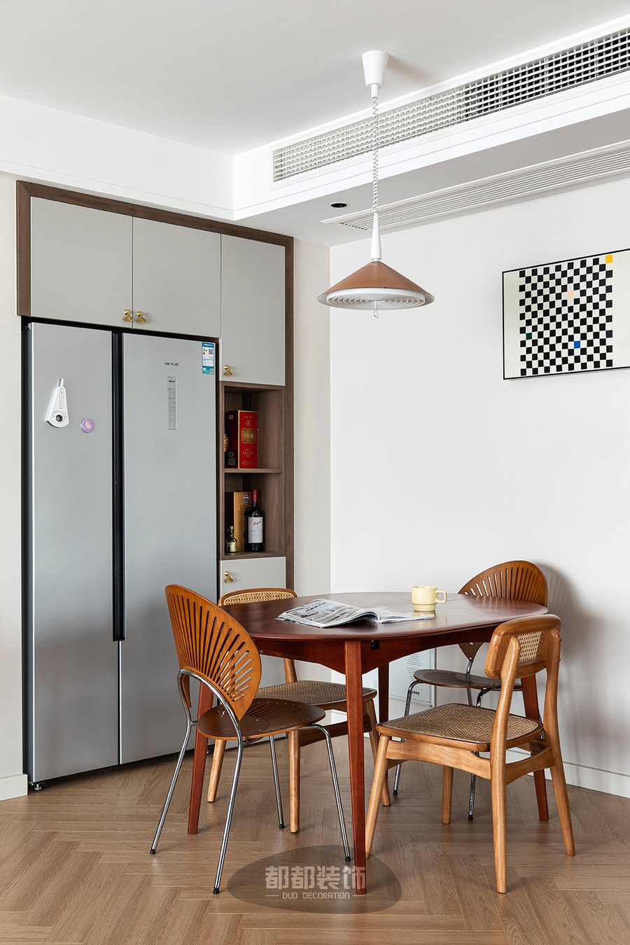 经典客餐厅一体,拥有流畅的动线和开阔的视野,居住舒适度非常高,尤为适合小户型。棕红色木质椭圆形餐桌椅延续客厅风格,藤编餐椅和贝壳餐椅特有的纹理感为空间注入活力。餐边柜处嵌入冰箱,用餐时想开瓶冰啤或红酒,随手即可拿取。