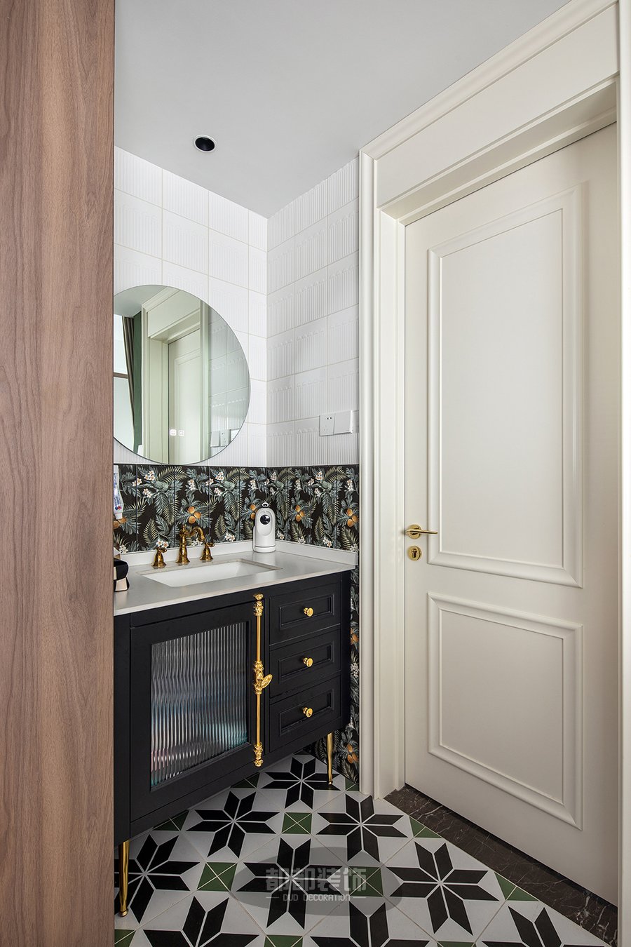 原来的浴室面积太小,再塞进一个洗手台的话更显局促,设计师干脆将洗手台外移,做成真正的干湿分离,增强功能性。小面积铺贴复古小花砖,分割空间的同时与整屋风格保持一致;墙面使用黑纹花砖与白色浮雕砖拼接铺贴,大胆撞色个性十足;金属黄铜龙头质感十足,整个空间虽小但满满的都是精致复古感。