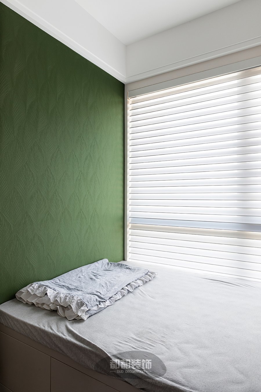 简易的榻榻米不仅能作为平日看书工作时的休息室,也可以作为简单的客卧,供到访家里的客人休息。绿色树叶暗纹墙纸十分精致,与铃兰花吊灯点面呼应,花叶相依,缱绻十足。