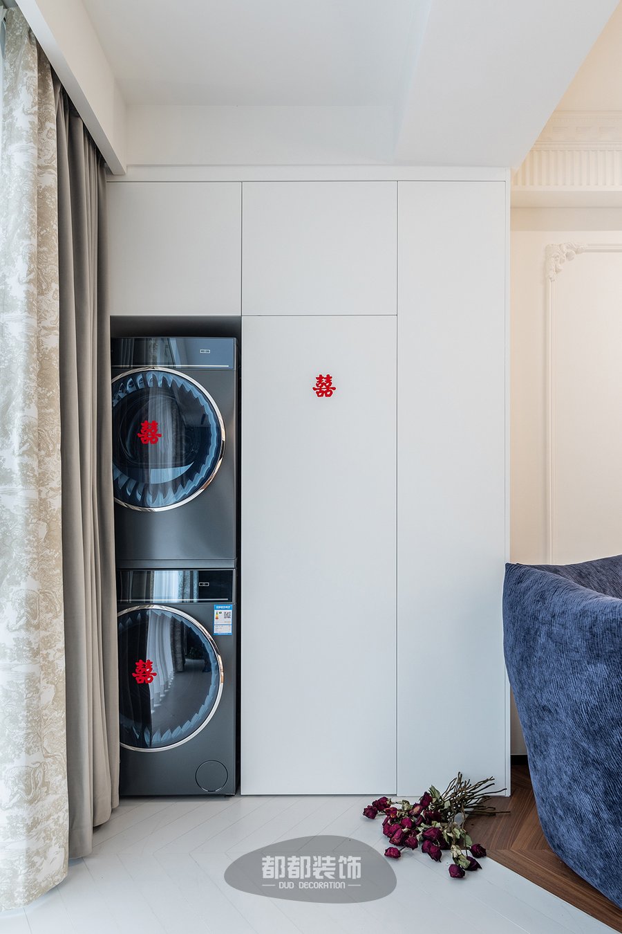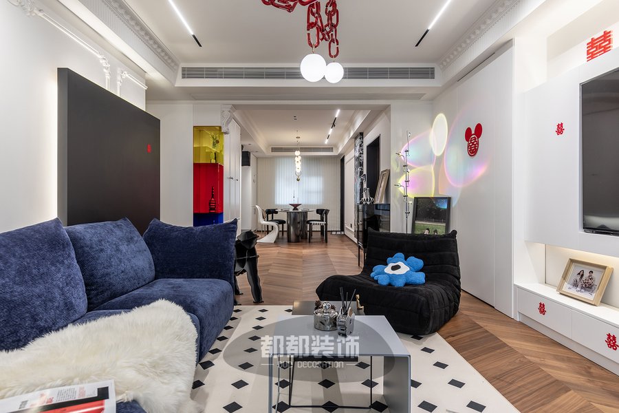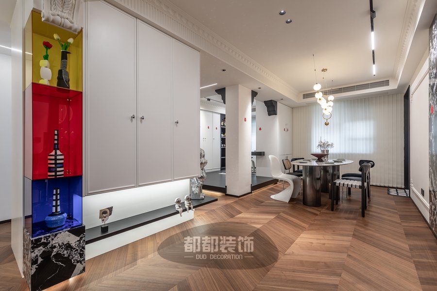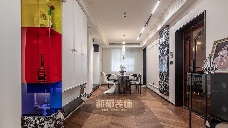 玄关采用纯净白皙的木柜、黄红蓝三色的亚克力开放格当做空间的起点,充分彰显出简约又不失个性的待客风度,左侧悬空拿破仑岩板+跳色亚克力+立体石膏雕花,多种元素碰撞出浪漫复古的韵味,右侧银色闪片网红熊时尚感满满!