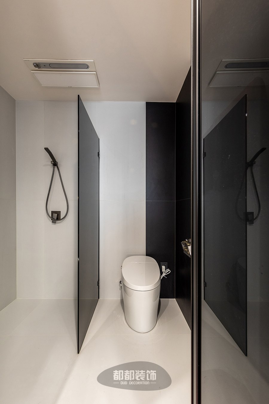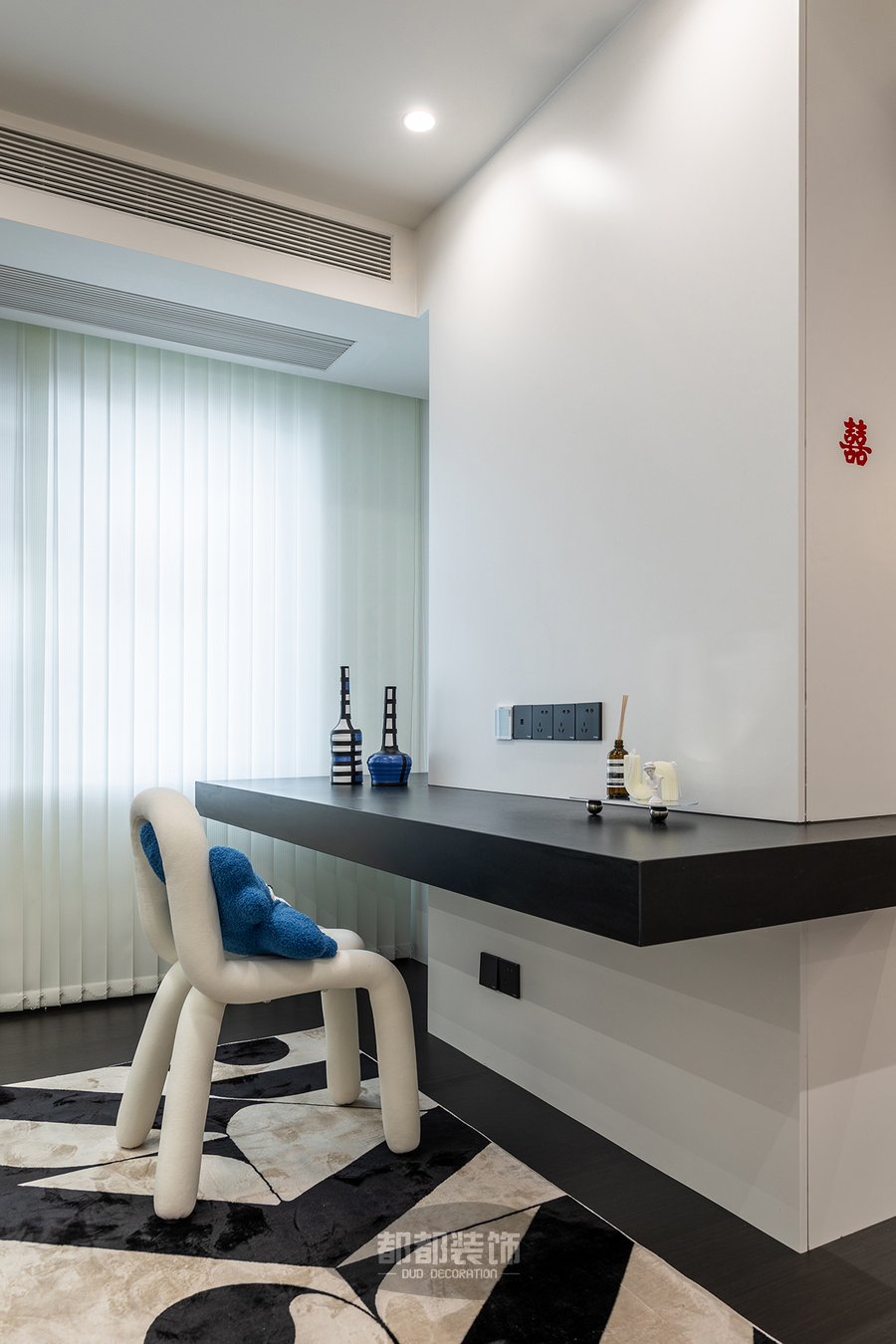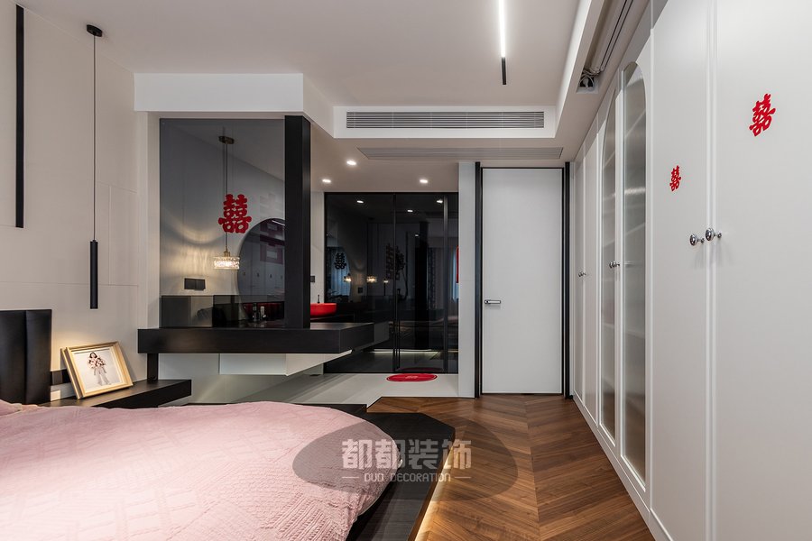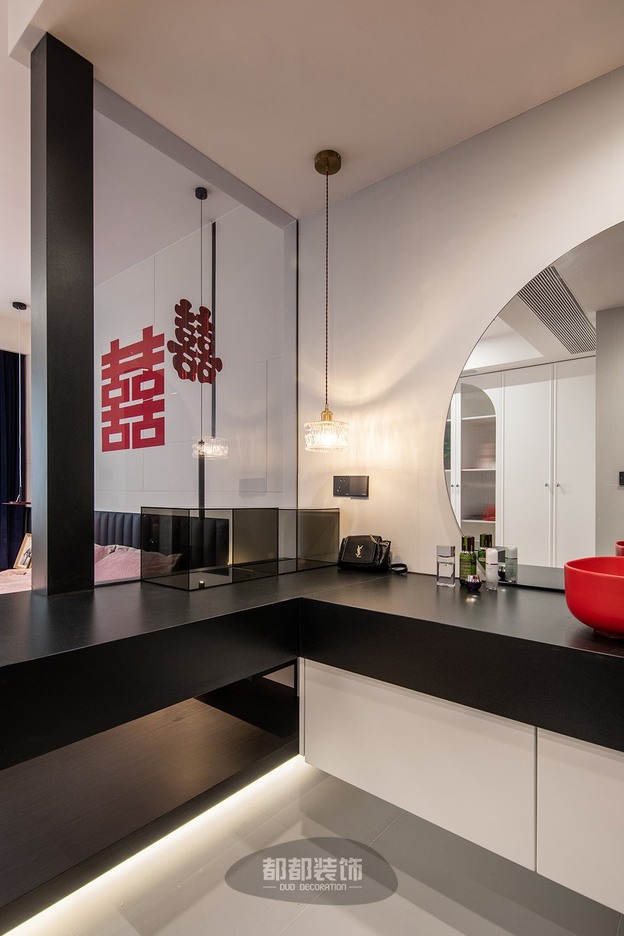 吊顶向下延伸出竖梁给梳妆台做支撑,让悬挂式梳妆台更加牢固,台面不落地的悬空式设计,看起来非常小巧精致又不占用空间,营造出轻盈与视觉延伸的穿透效果,黑色台面搭配灰黑色屏风隔断,整体颜色保持一致,打造出一种空间的立体感。