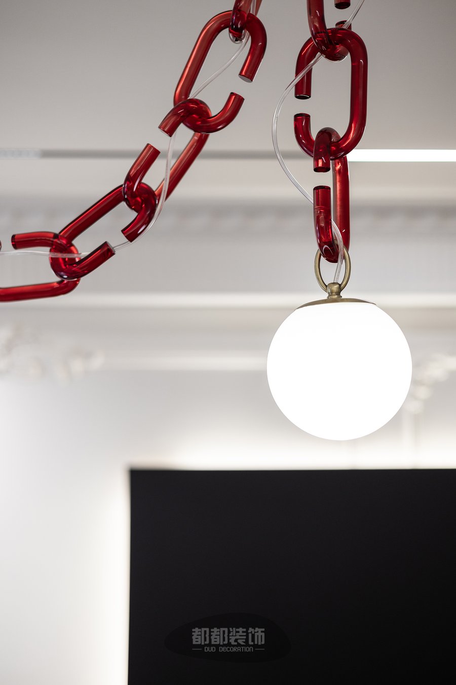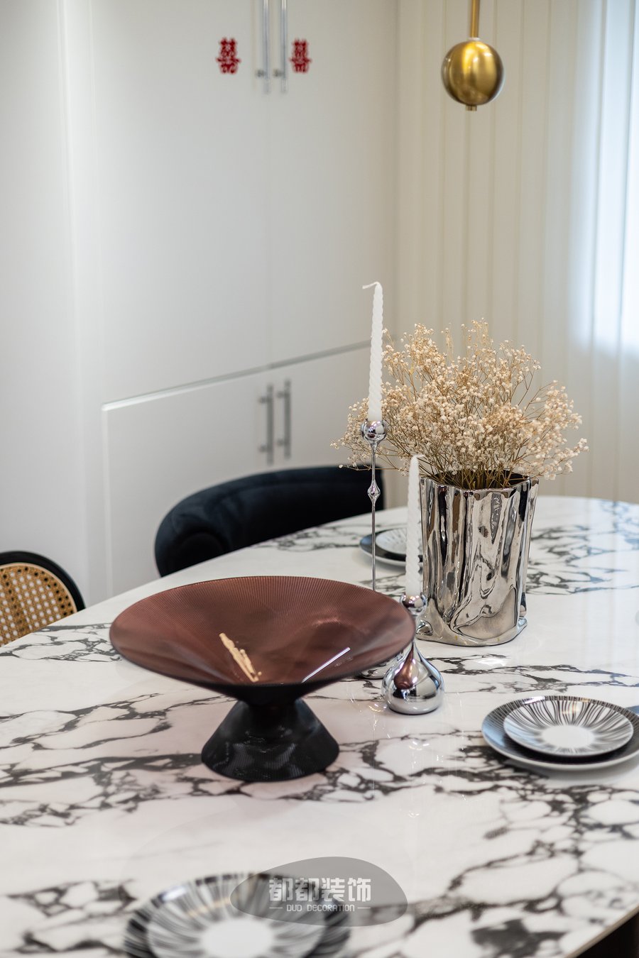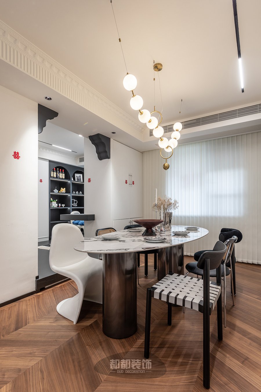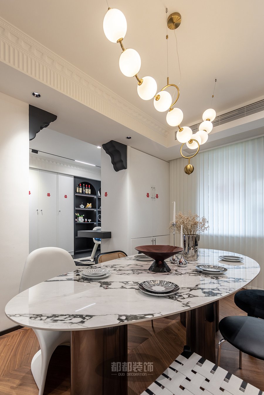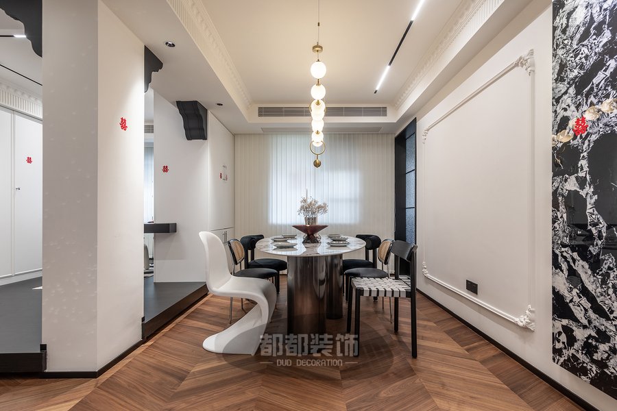 餐厅背景墙依旧采用了法式线条和岩板等材料打造,以此彰显法式复古和现代简约的风格,一整串球形吊灯给家居打造出一种安全温暖感。