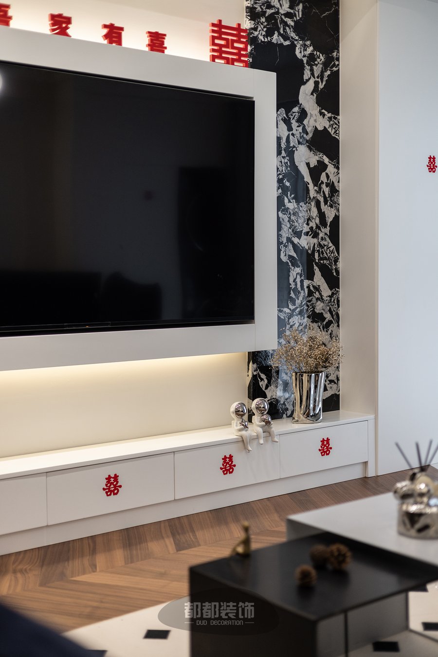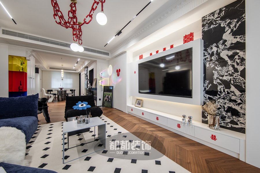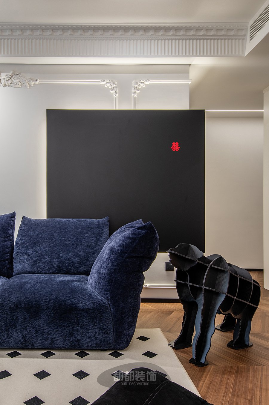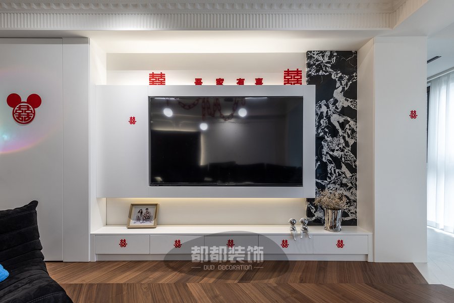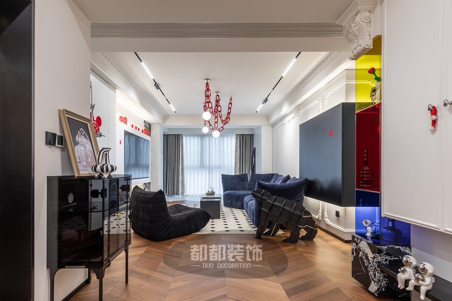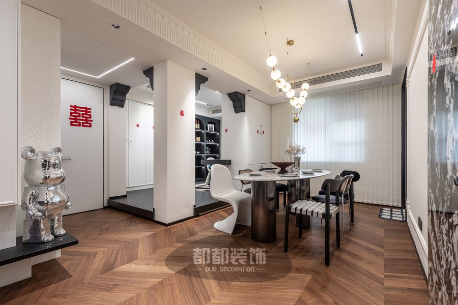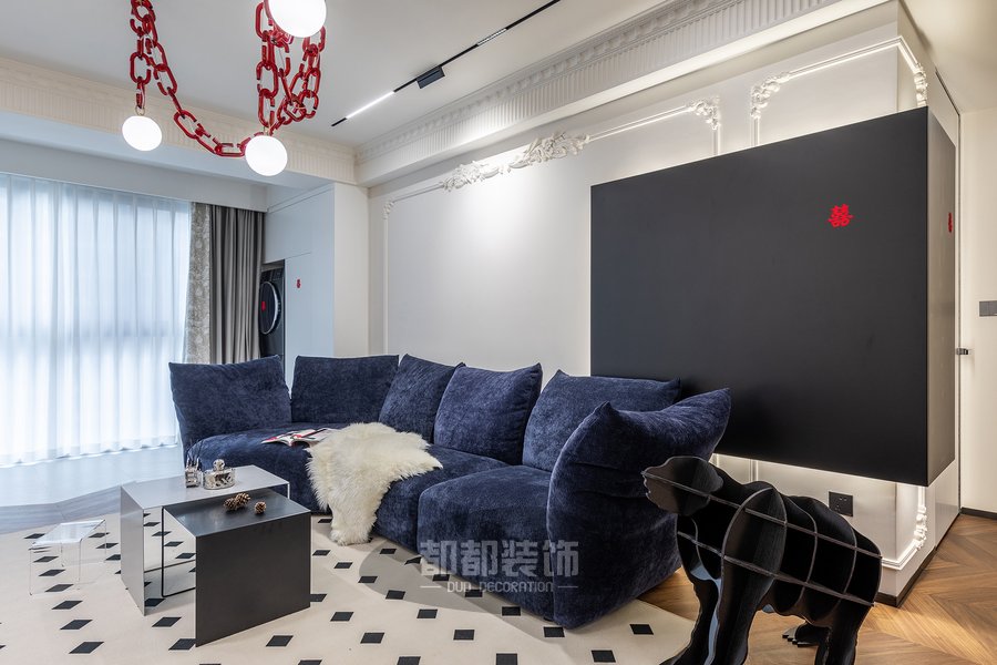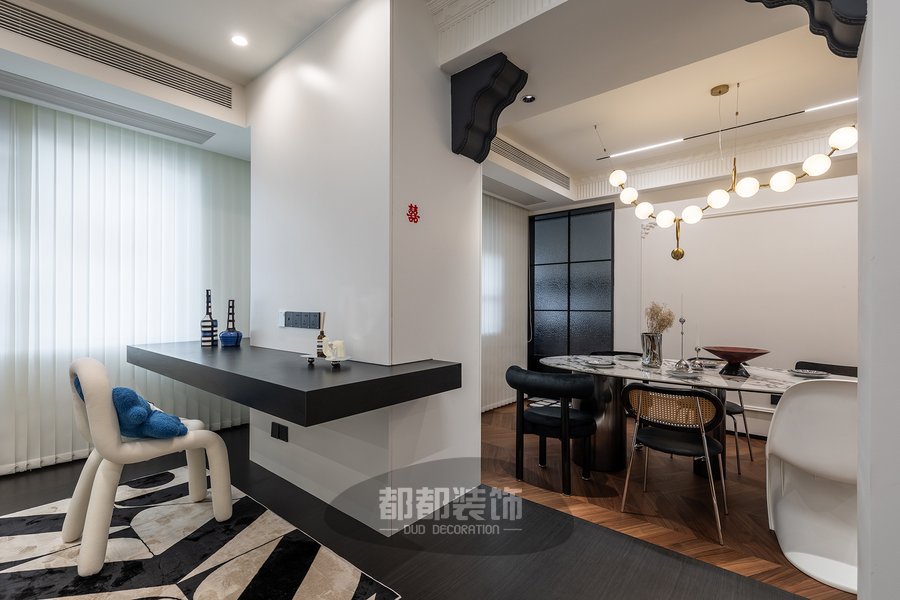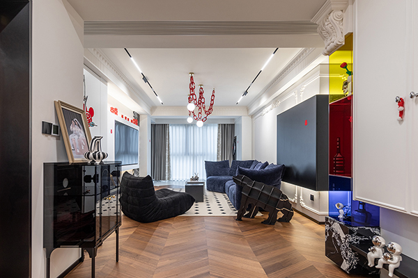 客厅将深木色和高级的黑白灰交织,巧妙的把每一处空间调动起来,形成活跃的家居氛围,素雅的法式雕花随着背景墙的动线延伸,交织出简而不减的灵动空间。