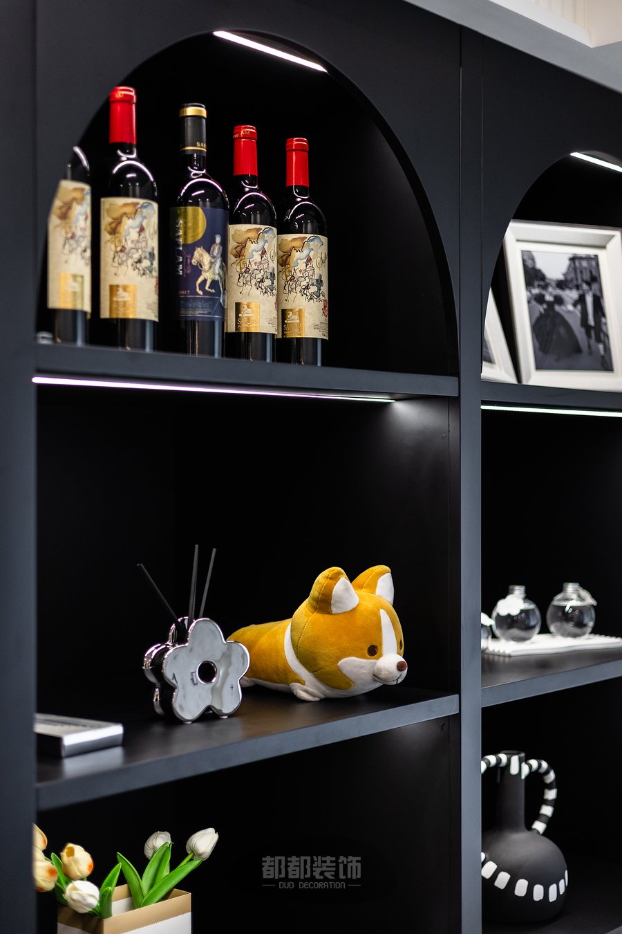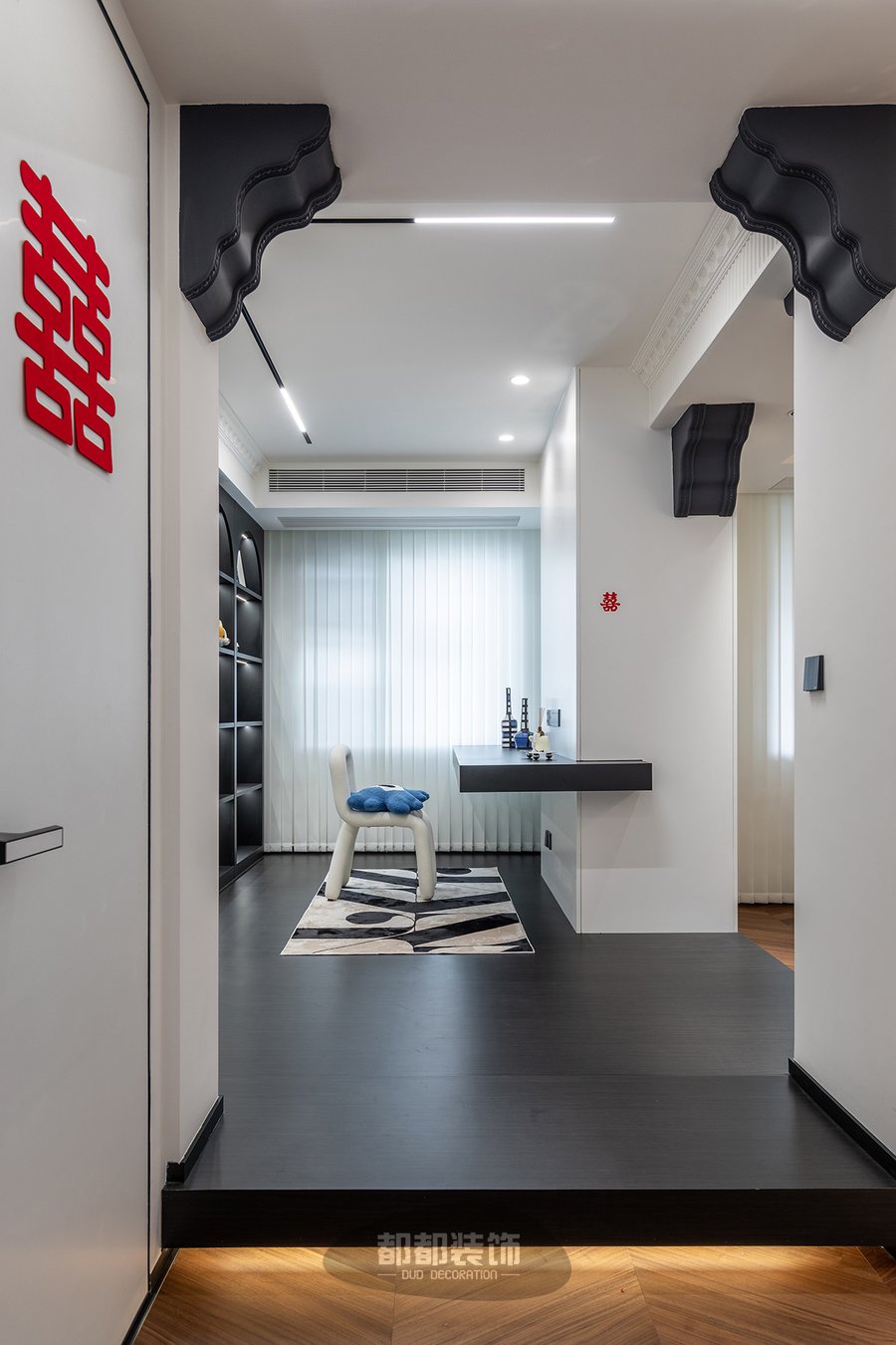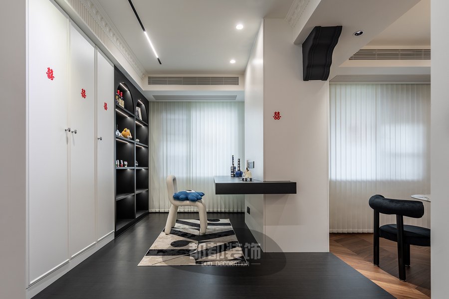 书房设置在餐厅后面,开放式的布局让家开阔明亮,黑色的增高地台无形的划分了功能区域,再配以白色木饰面+灯带装饰,视觉更加丰富。