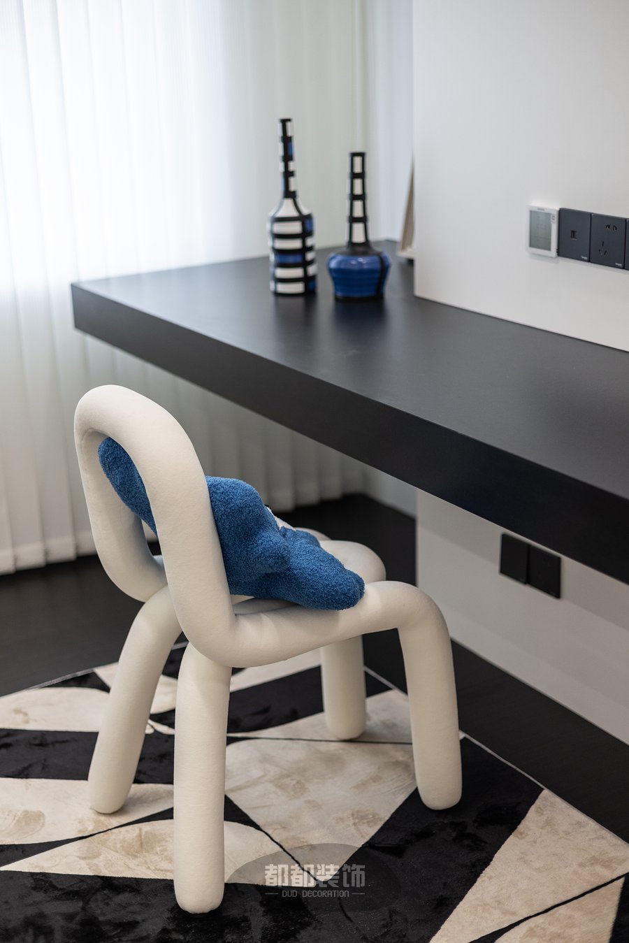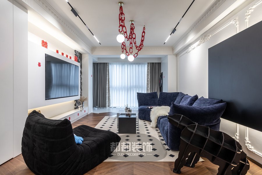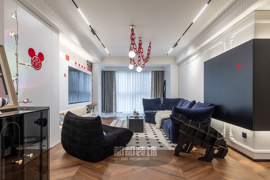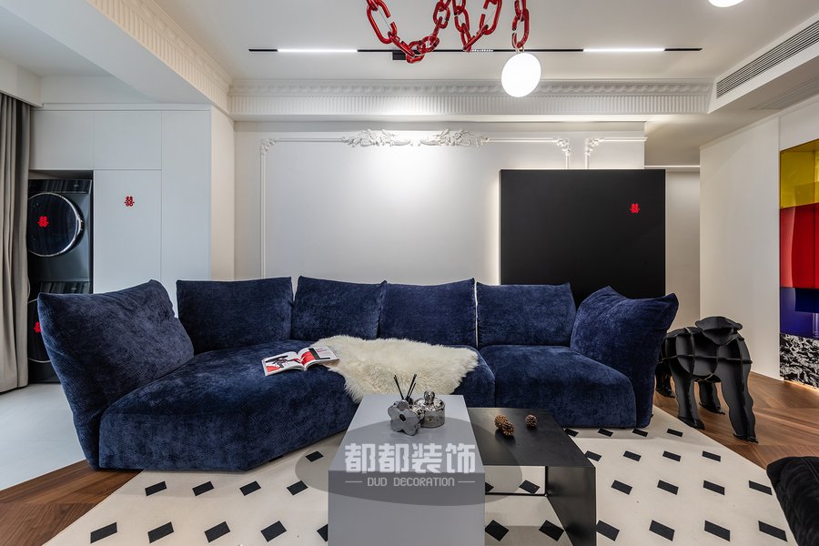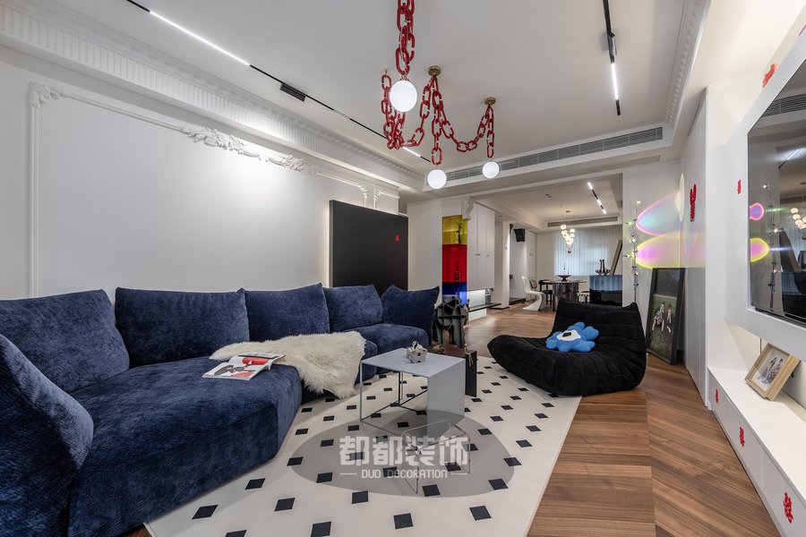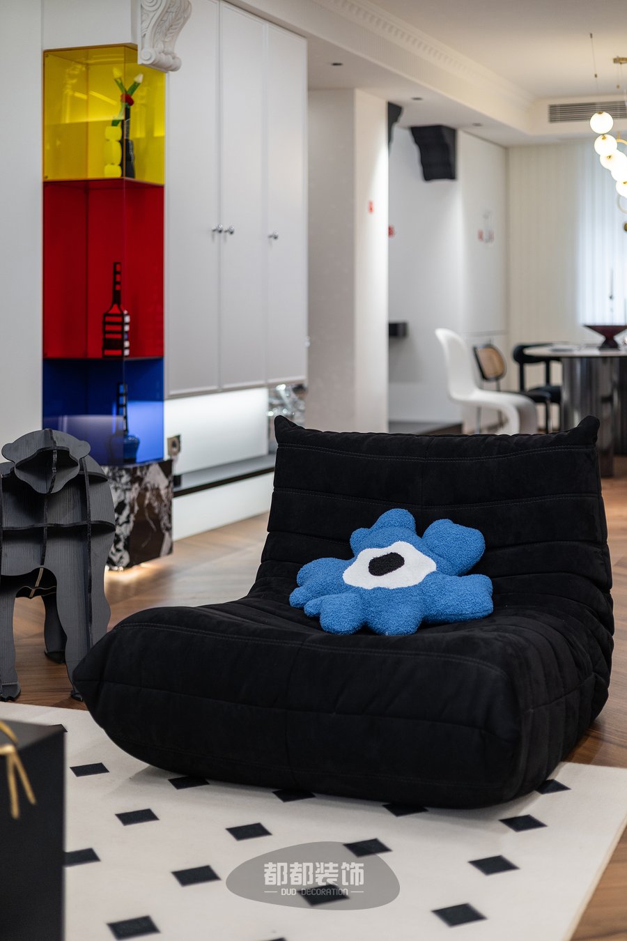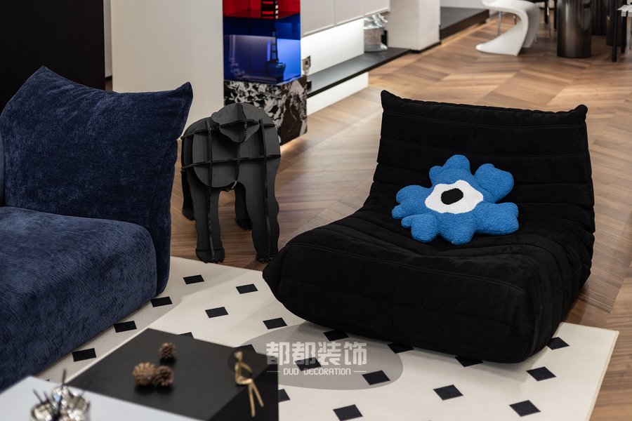 客厅还融入了其他的法式元素,淡雅的空间配色与时尚的黑白菱格地毯+弧形懒人沙发等软装,打造出浪漫优雅的空间格调。
