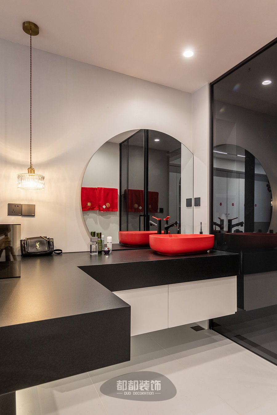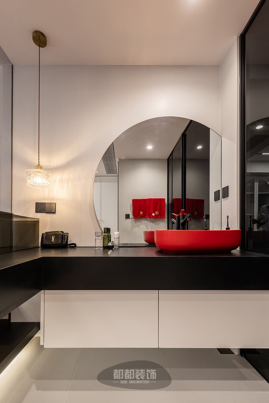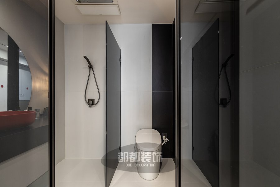 卫浴空间小巧且精致,洗手盆选用了活跃的红色,以点睛之笔给黑白的空间增加了一份艺术美感,被切割的圆形化妆镜让整个空间线条更加丰富,利用推拉玻璃门进行干湿分离,灵活打造个性化卫生间,这样简洁的布置也使整个空间很好打理的哦!