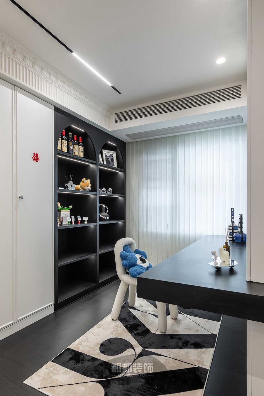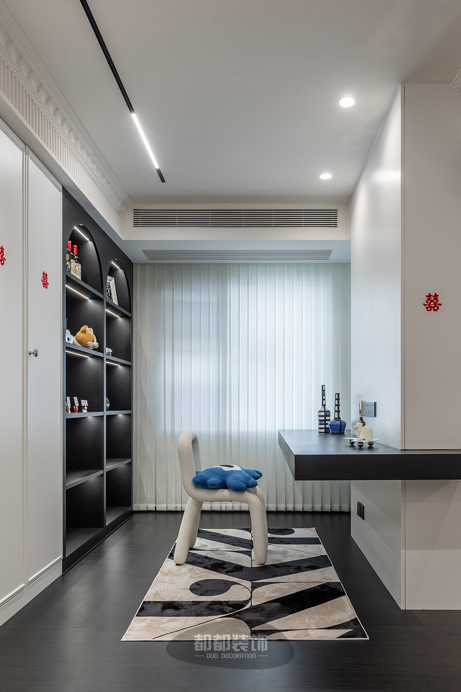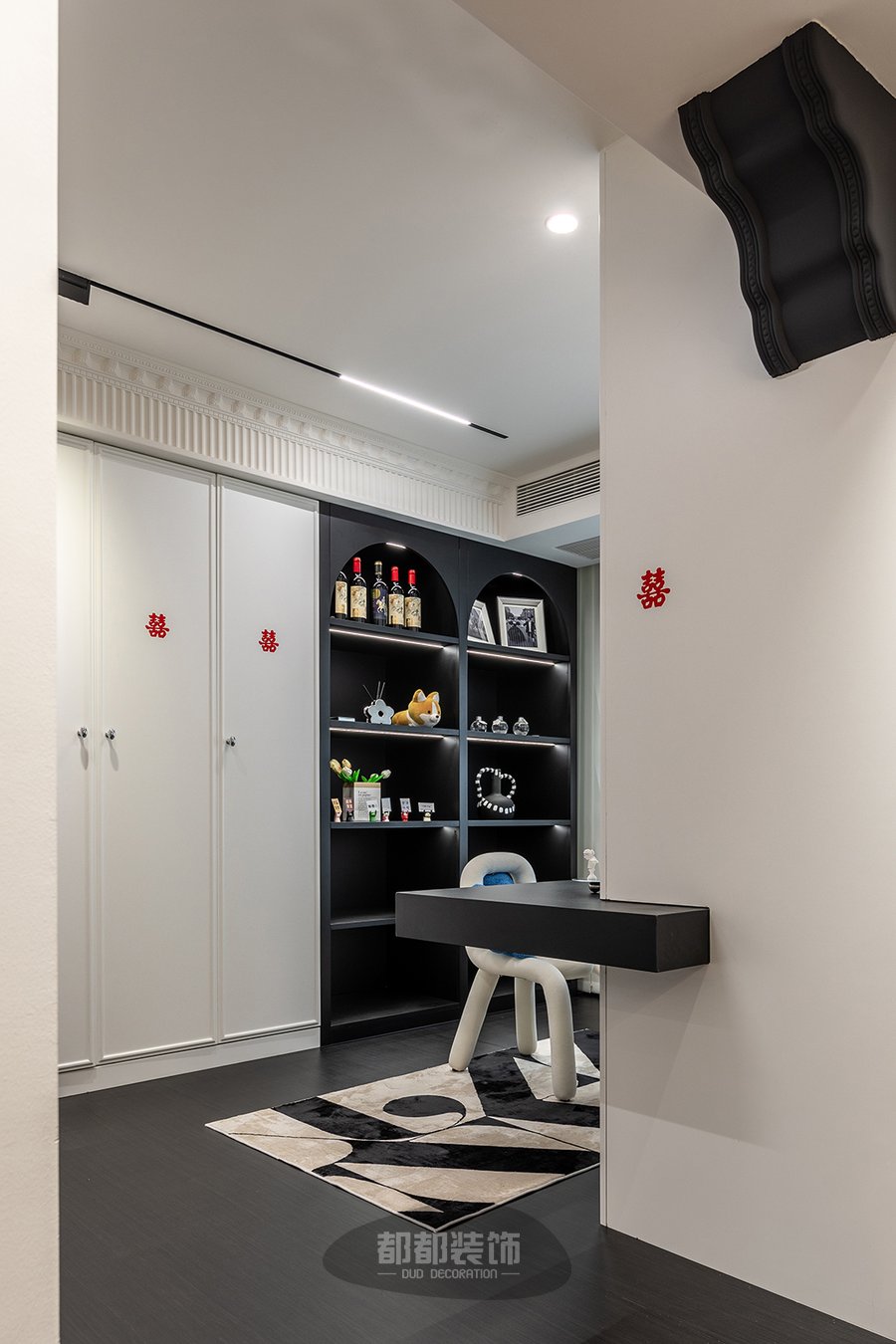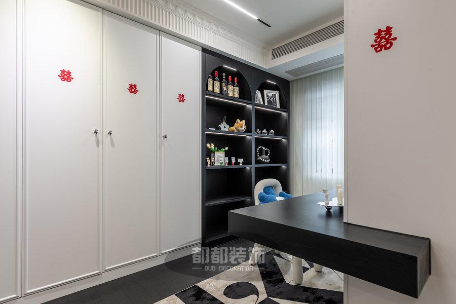 用悬浮书桌代替传统的木质书桌,没有了桌角的阻碍,视觉清爽简约,可倚墙、靠柜体的设计,打破空间固定的格局,进一步提高空间利用率,身后拱形的展示柜搭配小摆件给空间增加了一份艺术美学。