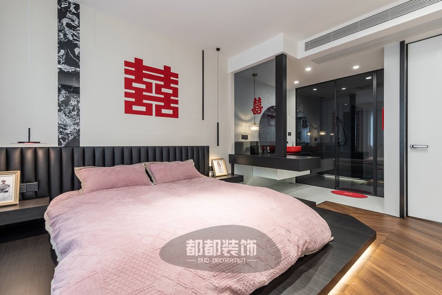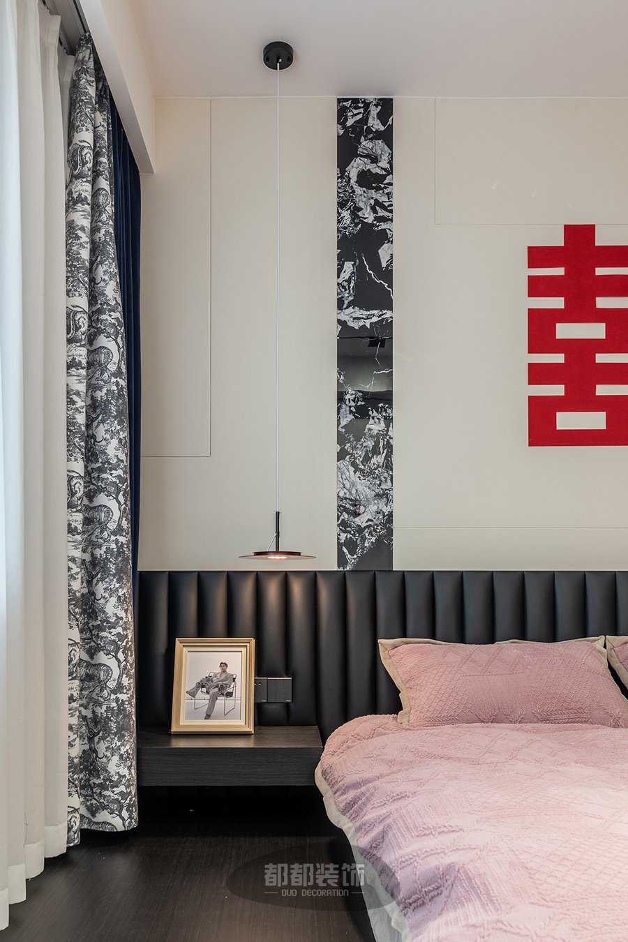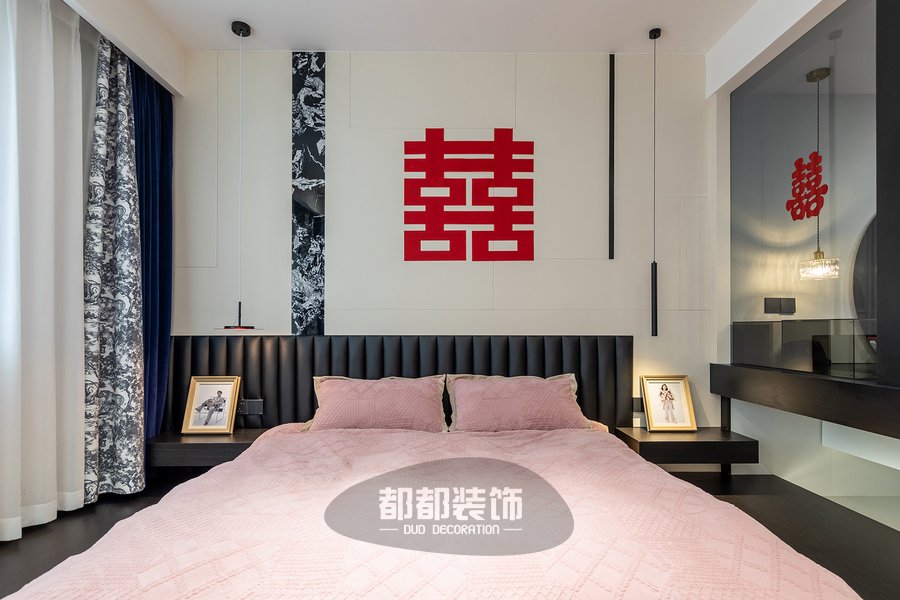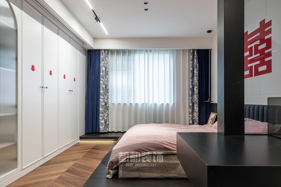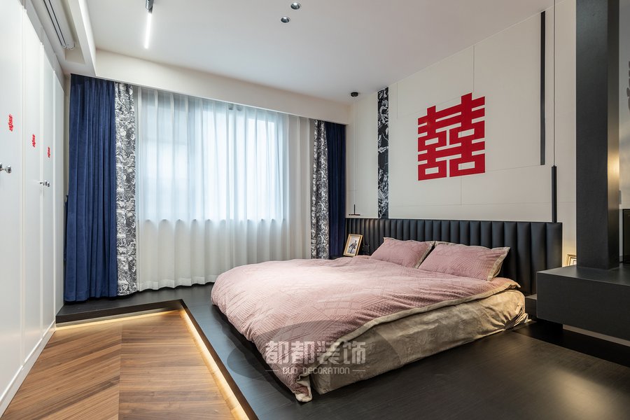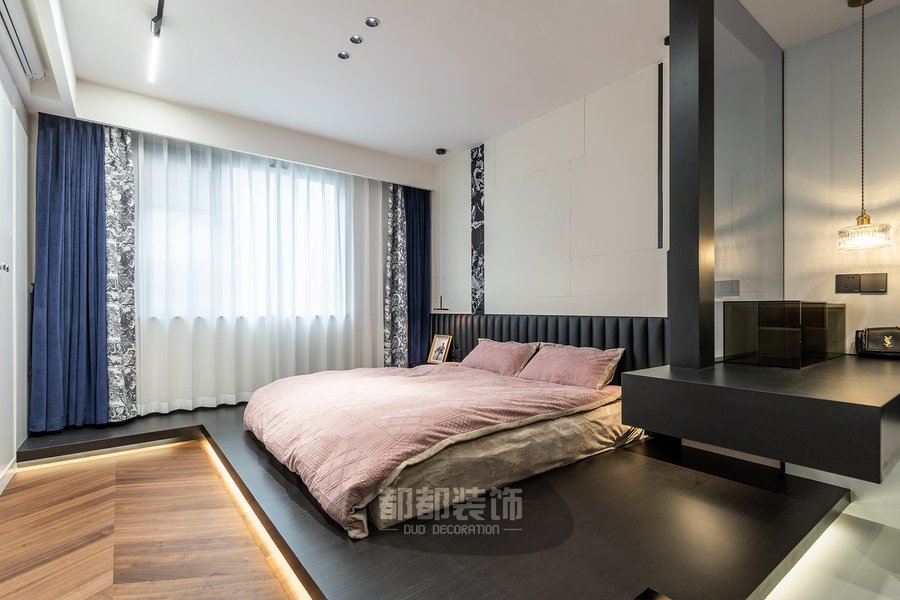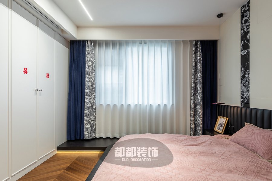 主卧以女主人喜爱的法式简约风为前提,大面积粉色床品的运用,色泽均匀,轻盈通透,自然的气息在空间中流动着,印花窗帘与拿破仑图案神似,点缀些水墨蓝与整屋风格相呼应。