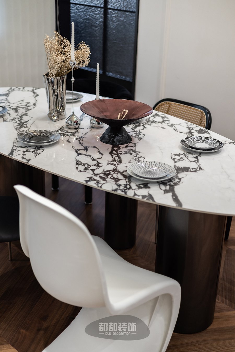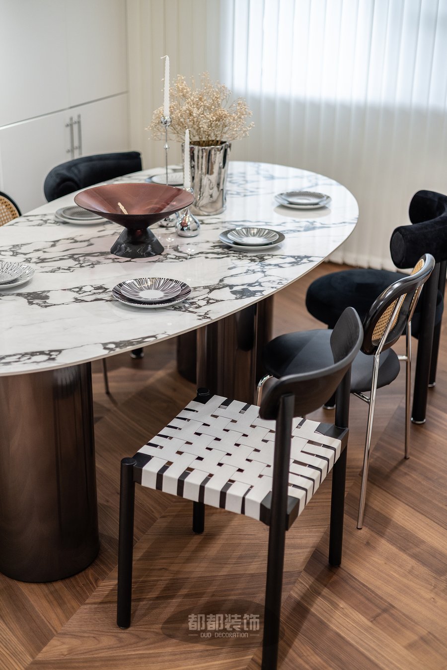 餐厅布局休闲自然不拘束,各种设计感十足的椅子应有尽有,鹅蛋型大理石餐桌与餐椅形成呼应对比,不同材质的厚度、体量、质地在空间中得以体现,层级张力由此而生。