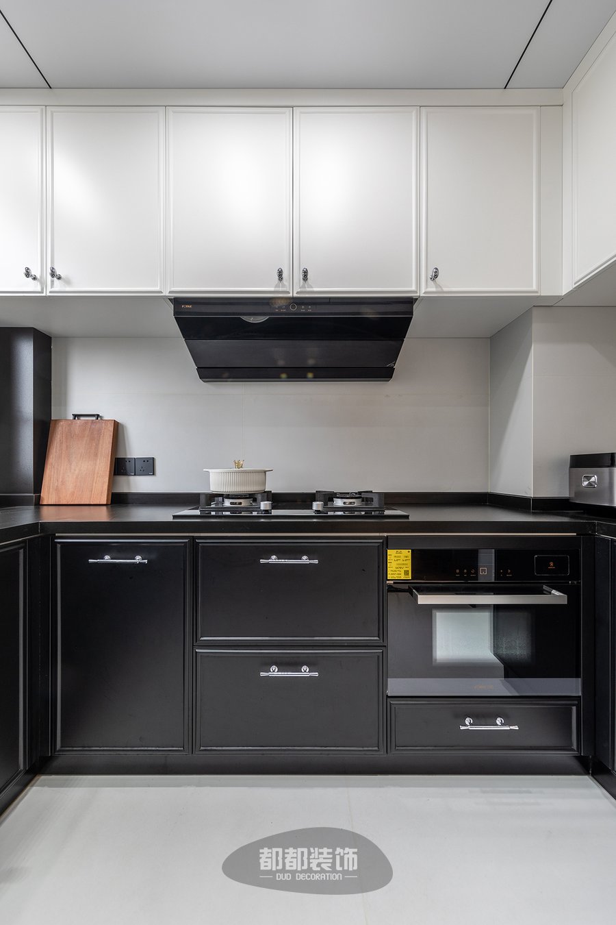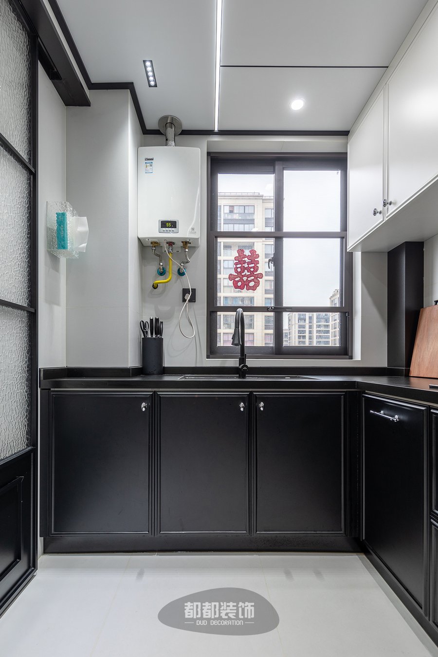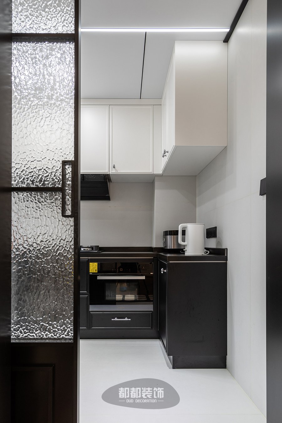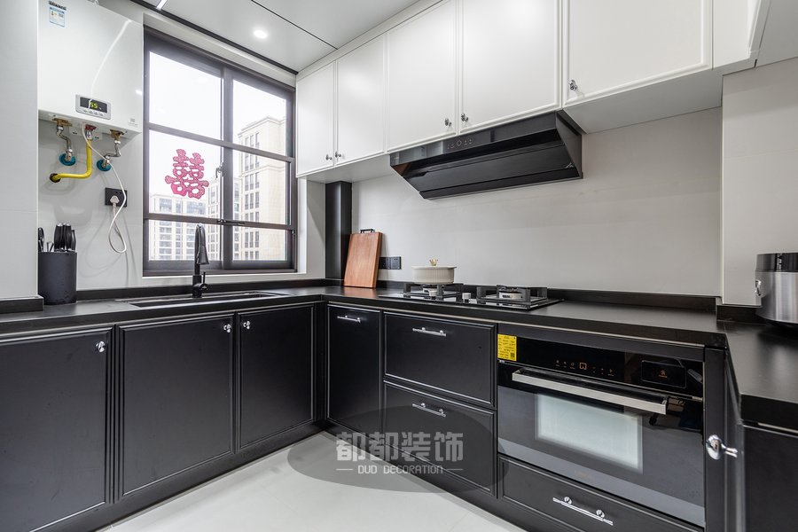 厨房采用大理石墙面加以黑色的台面,设计简明大方,在低调内敛中体现奢华的本质,地柜+吊柜增加收纳功能,黑白配的柜门耐看又耐脏,水波纹的长虹玻璃门烘托出厨房的小清新氛围,还为厨房增添明亮的感觉。