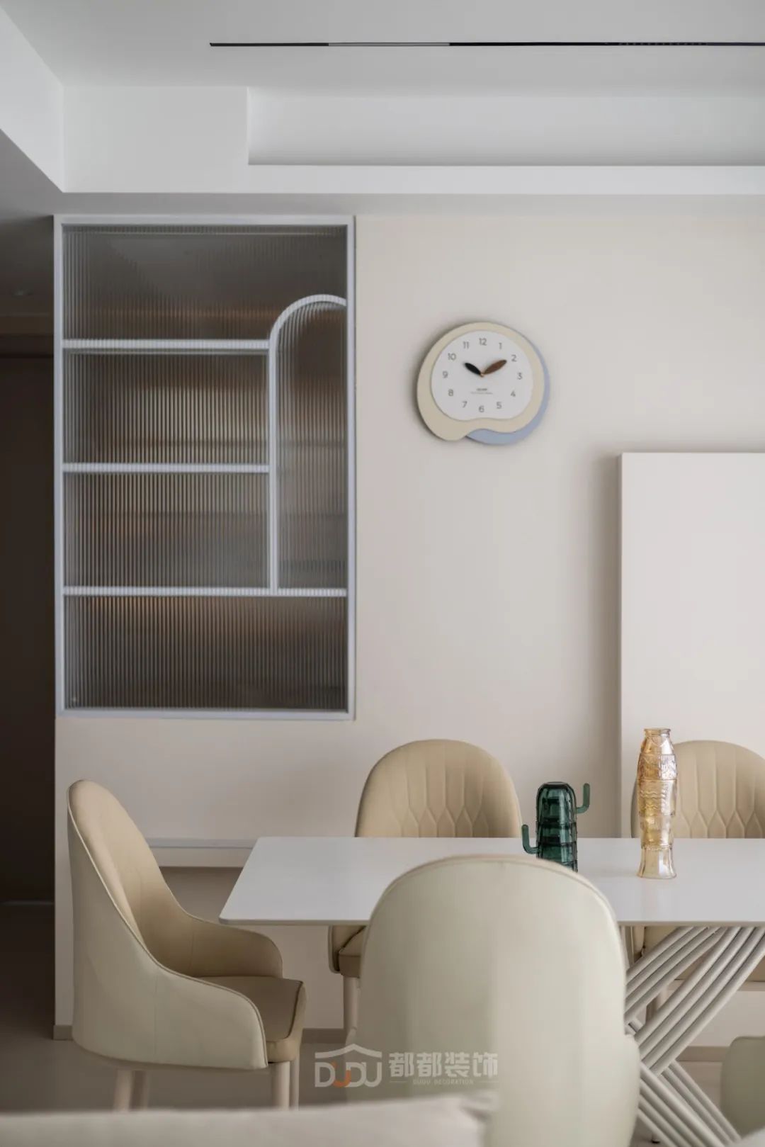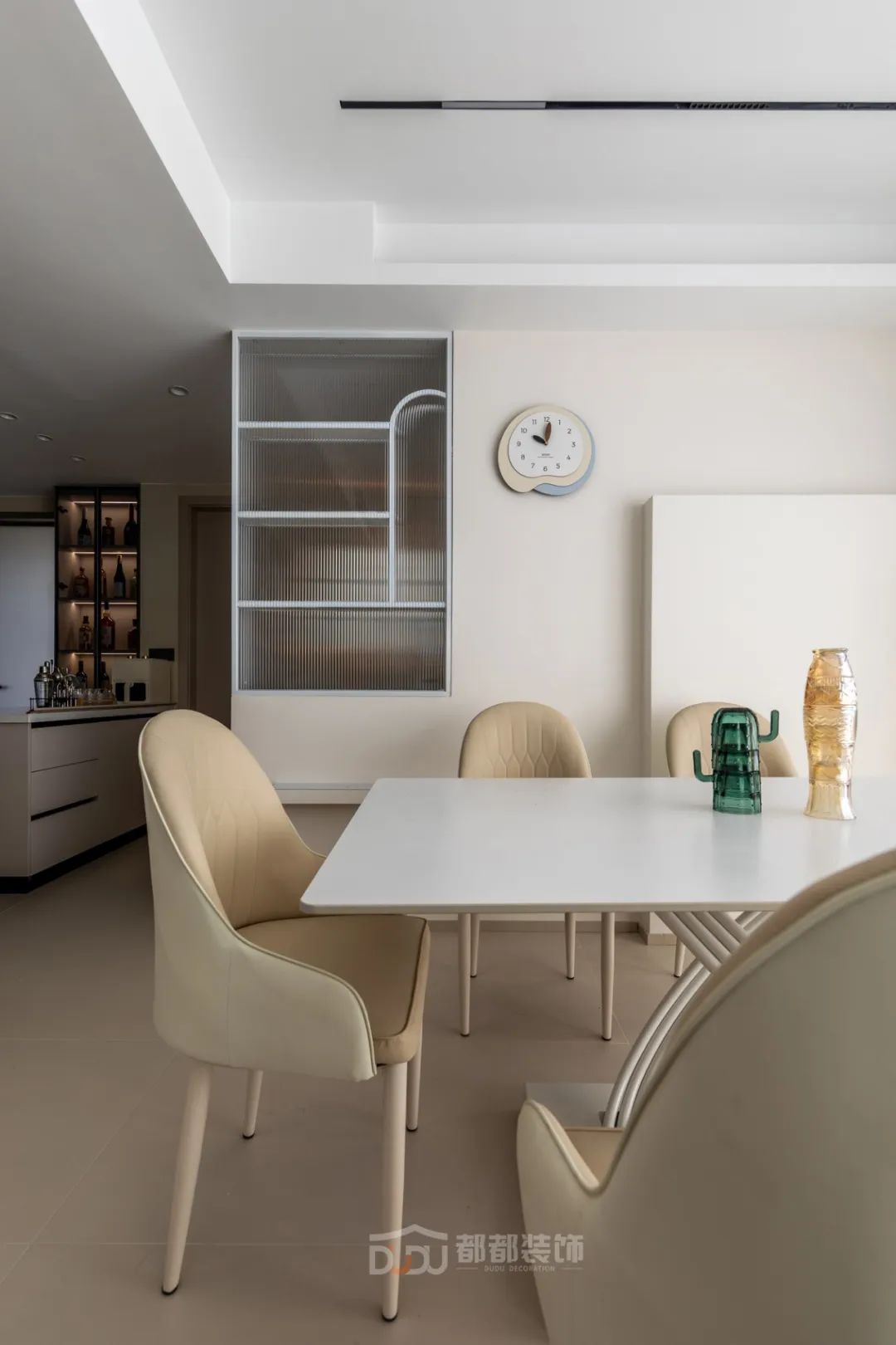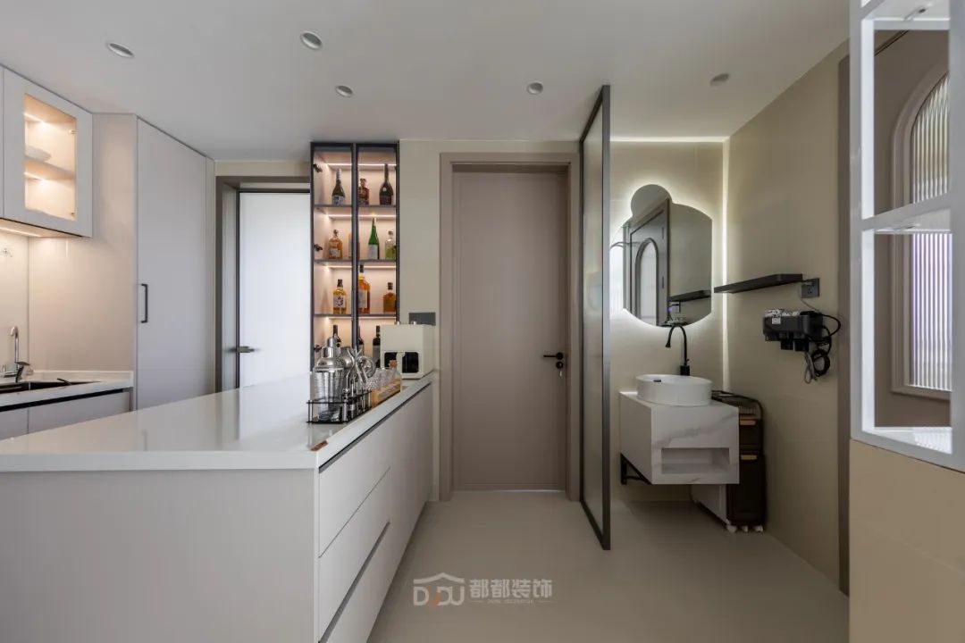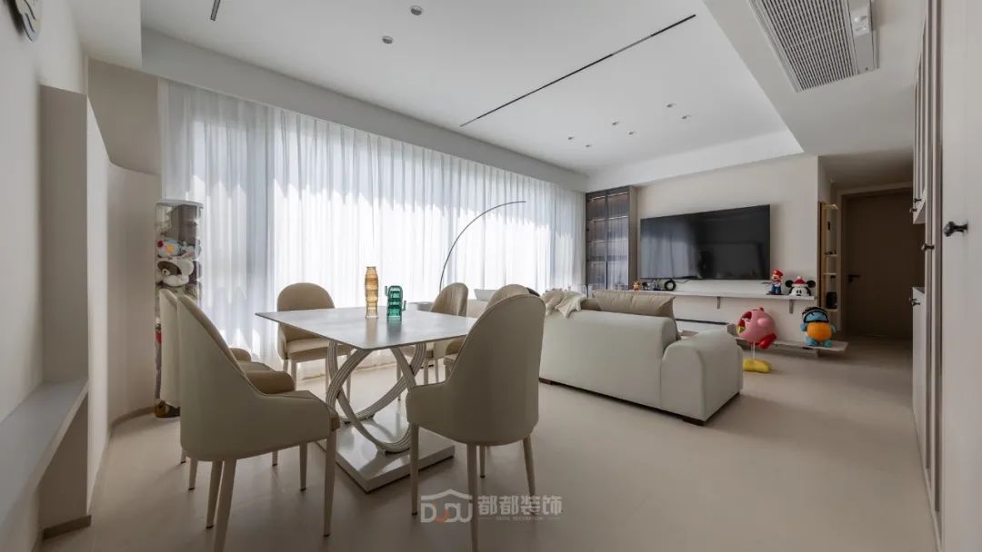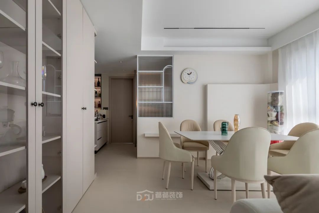 餐厅区域干净利落,墙面运用了一些设计;做线面结合的装饰,用曲线打造空间的延伸感,增加趣味性,让餐厅变得有趣起来。