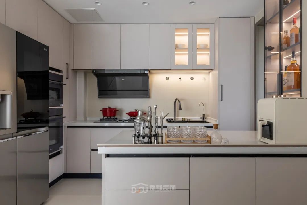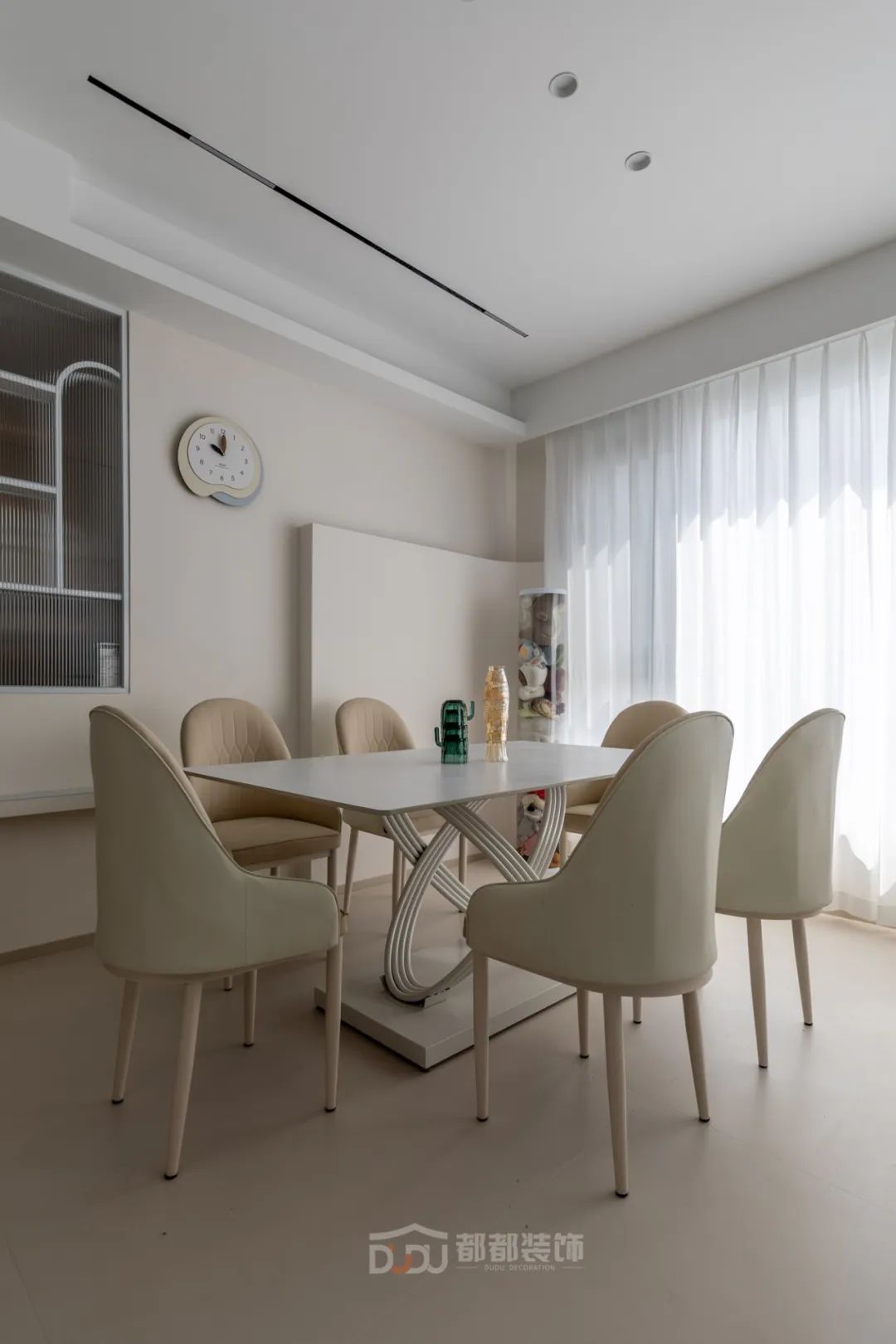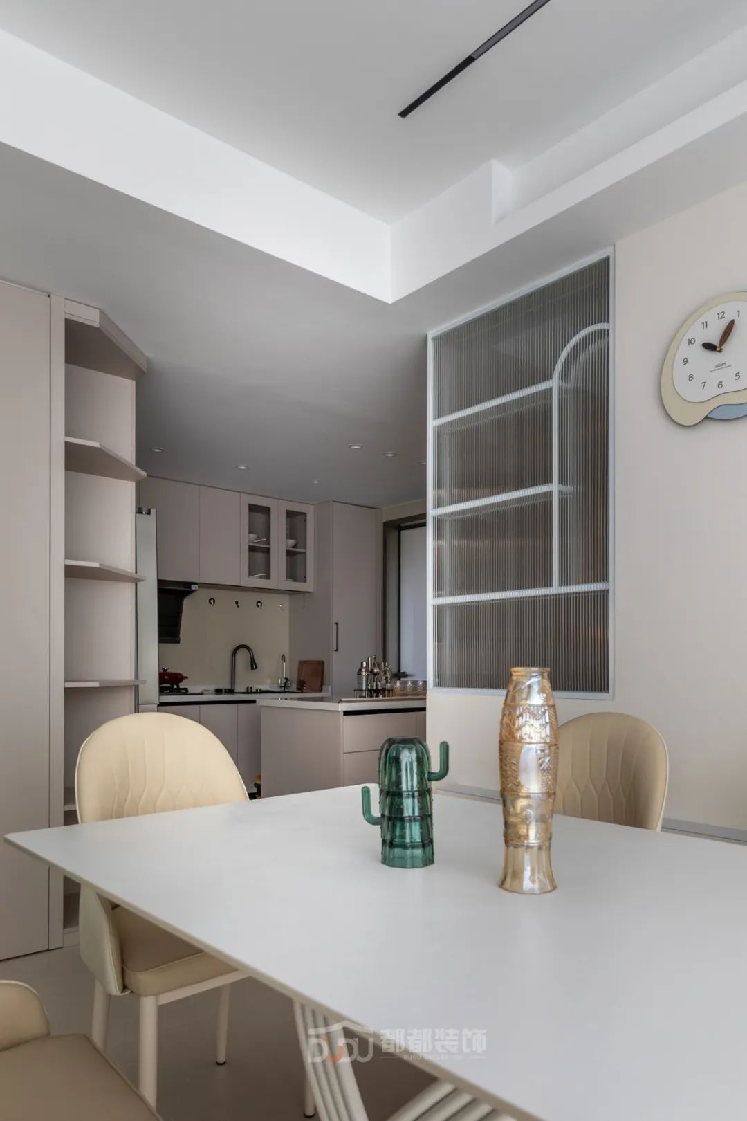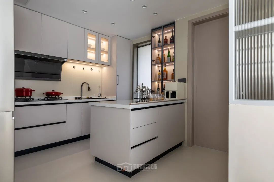 餐厅区域干净利落,墙面运用了一些设计;做线面结合的装饰,用曲线打造空间的延伸感,增加趣味性,让餐厅变得有趣起来。