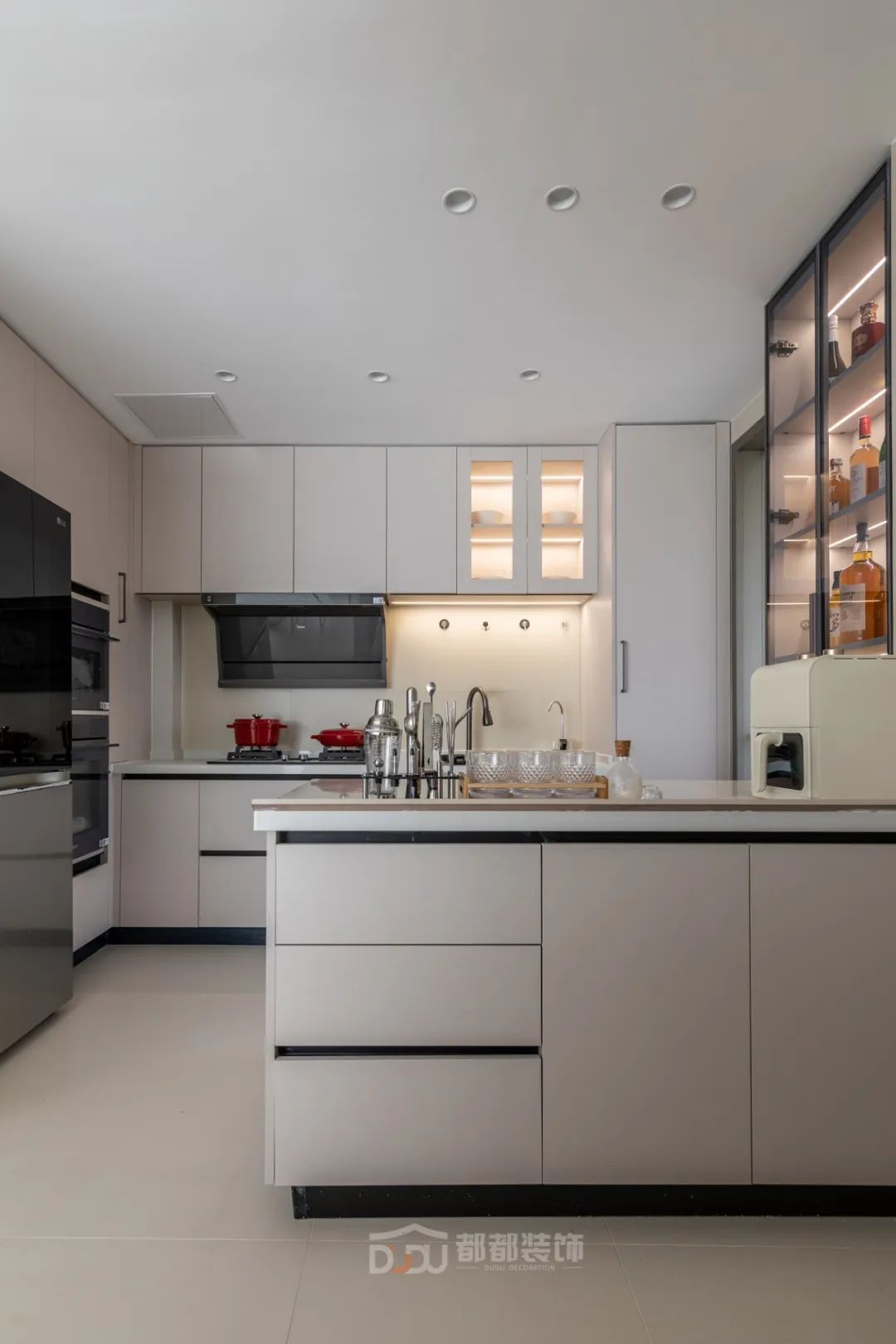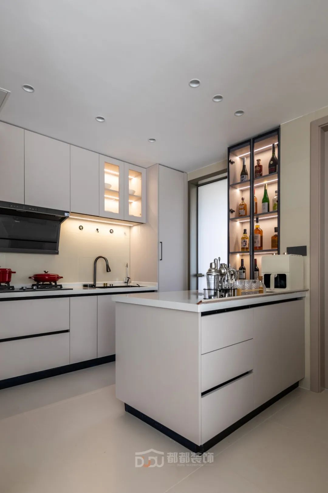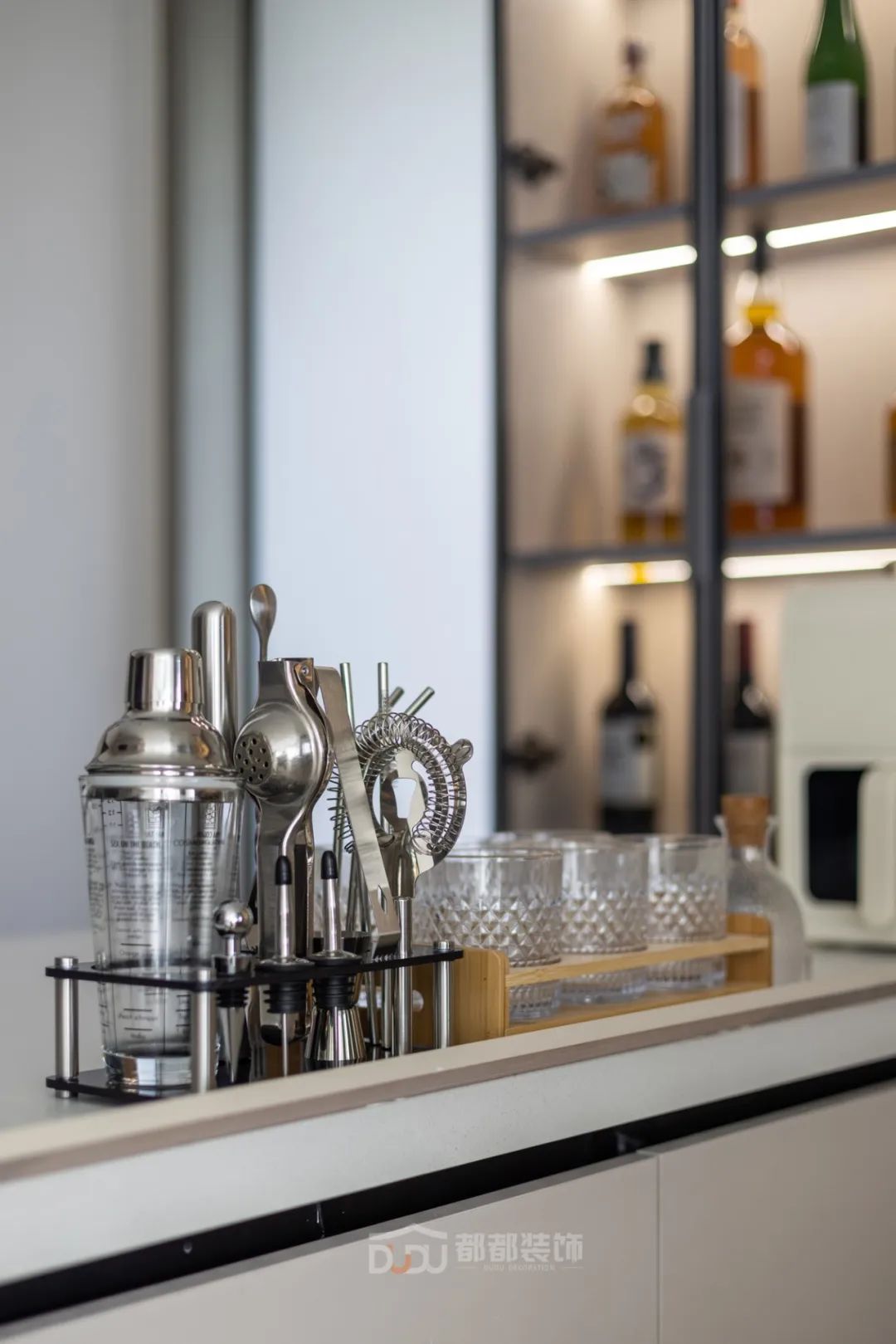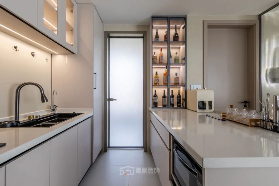 餐厅区域干净利落,墙面运用了一些设计;做线面结合的装饰,用曲线打造空间的延伸感,增加趣味性,让餐厅变得有趣起来。