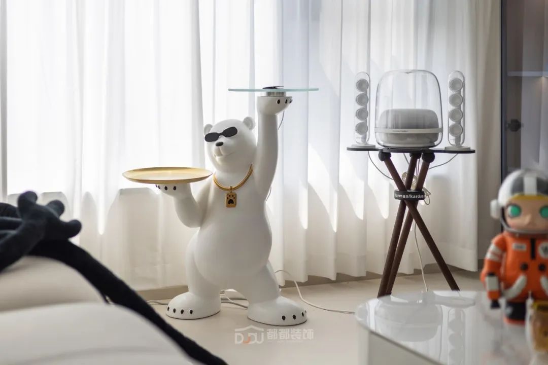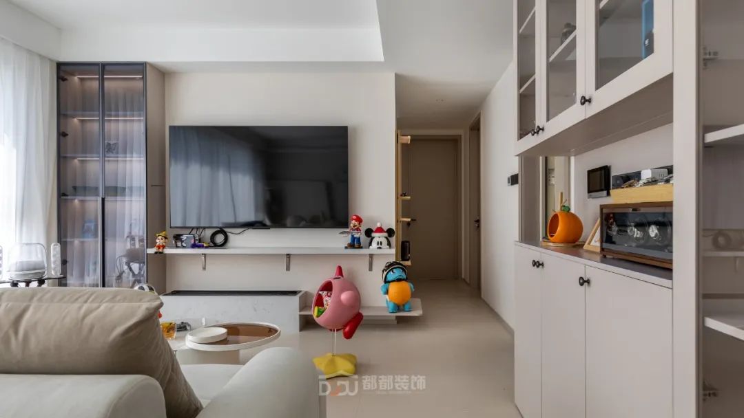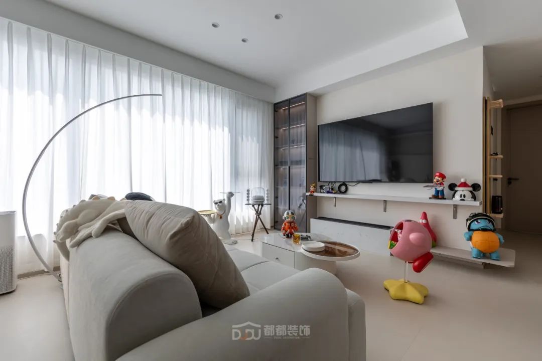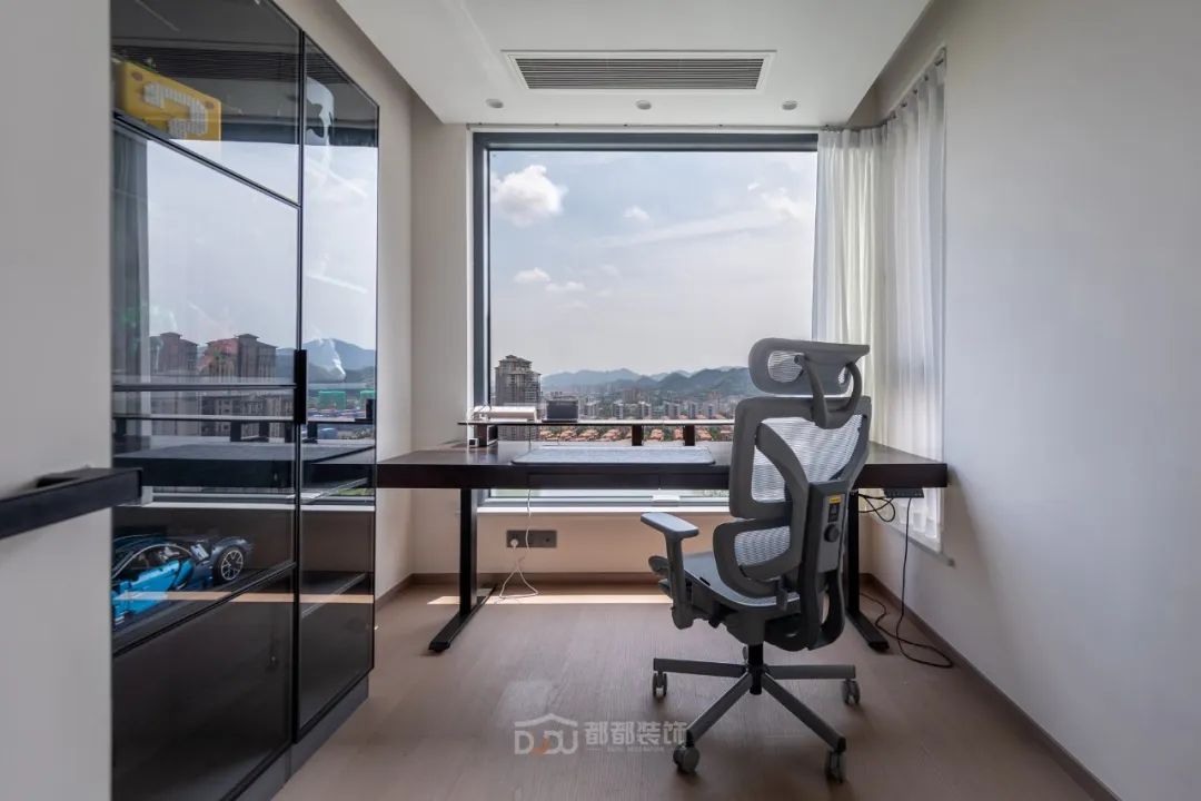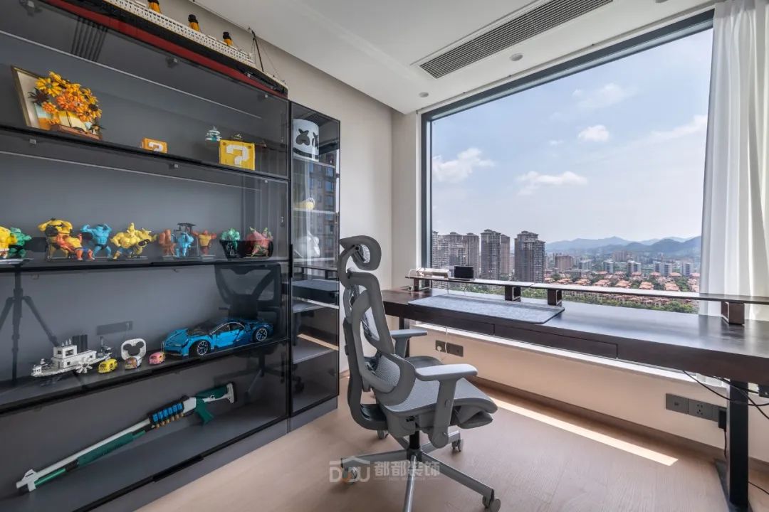 书房光线和视野都非常好,很适合办公和娱乐放松,做了定制展示柜摆放了屋主心爱的手办;智能升降办公桌加人体工学办公椅,无论是在办公或打游戏,都会因舒适的环境而顺利起来。