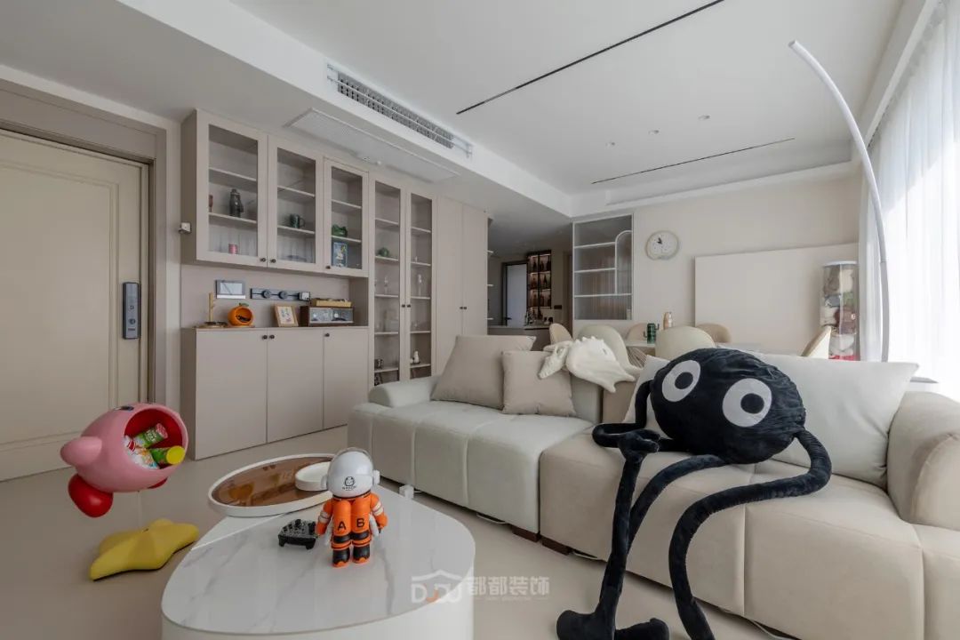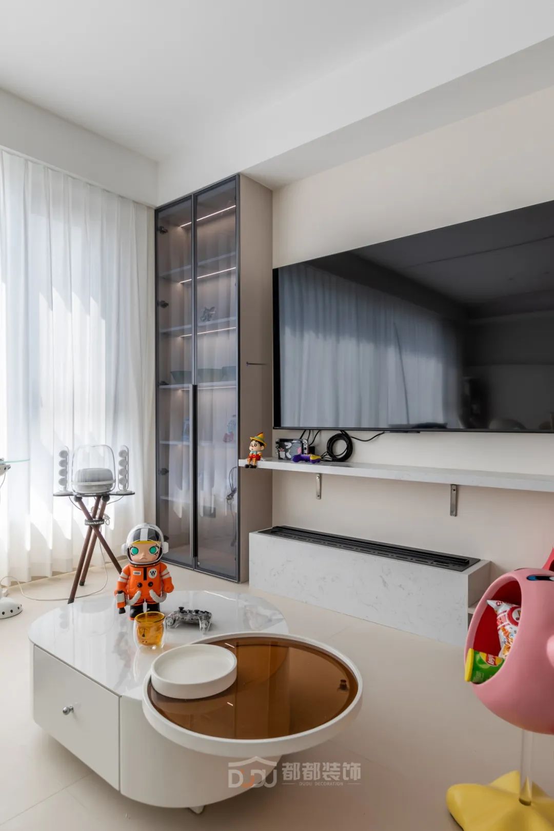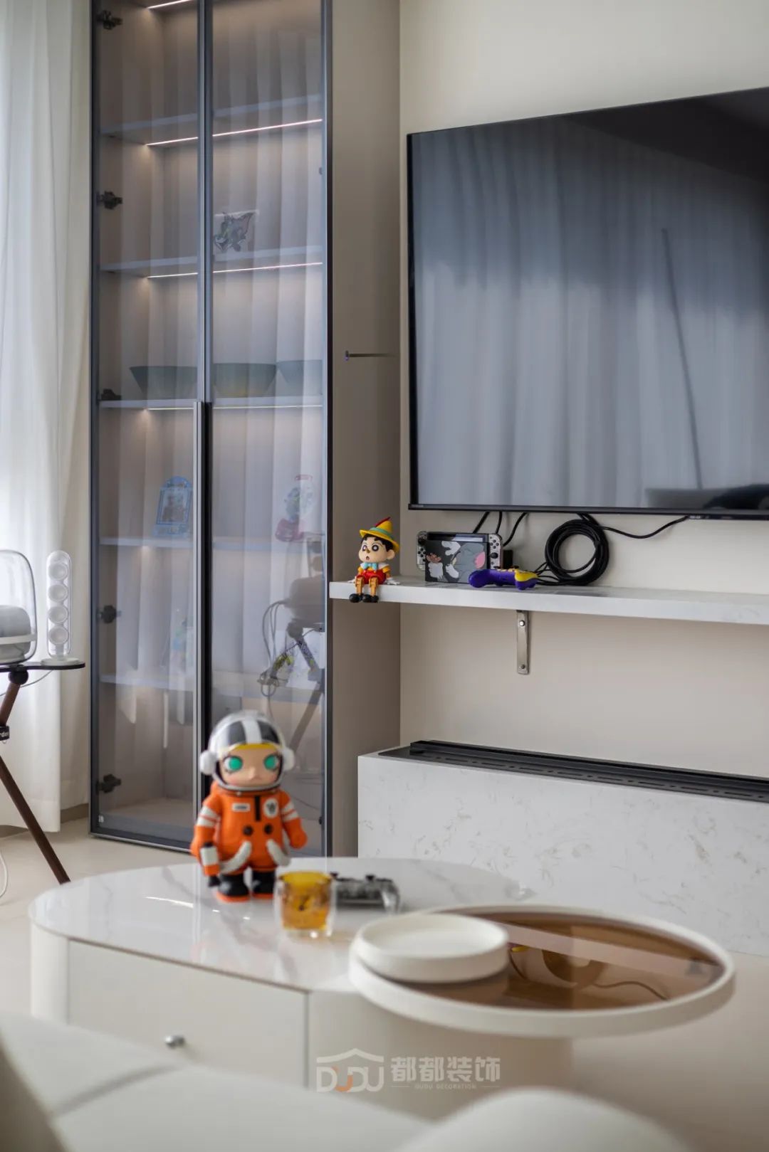 书房光线和视野都非常好,很适合办公和娱乐放松,做了定制展示柜摆放了屋主心爱的手办;智能升降办公桌加人体工学办公椅,无论是在办公或打游戏,都会因舒适的环境而顺利起来。