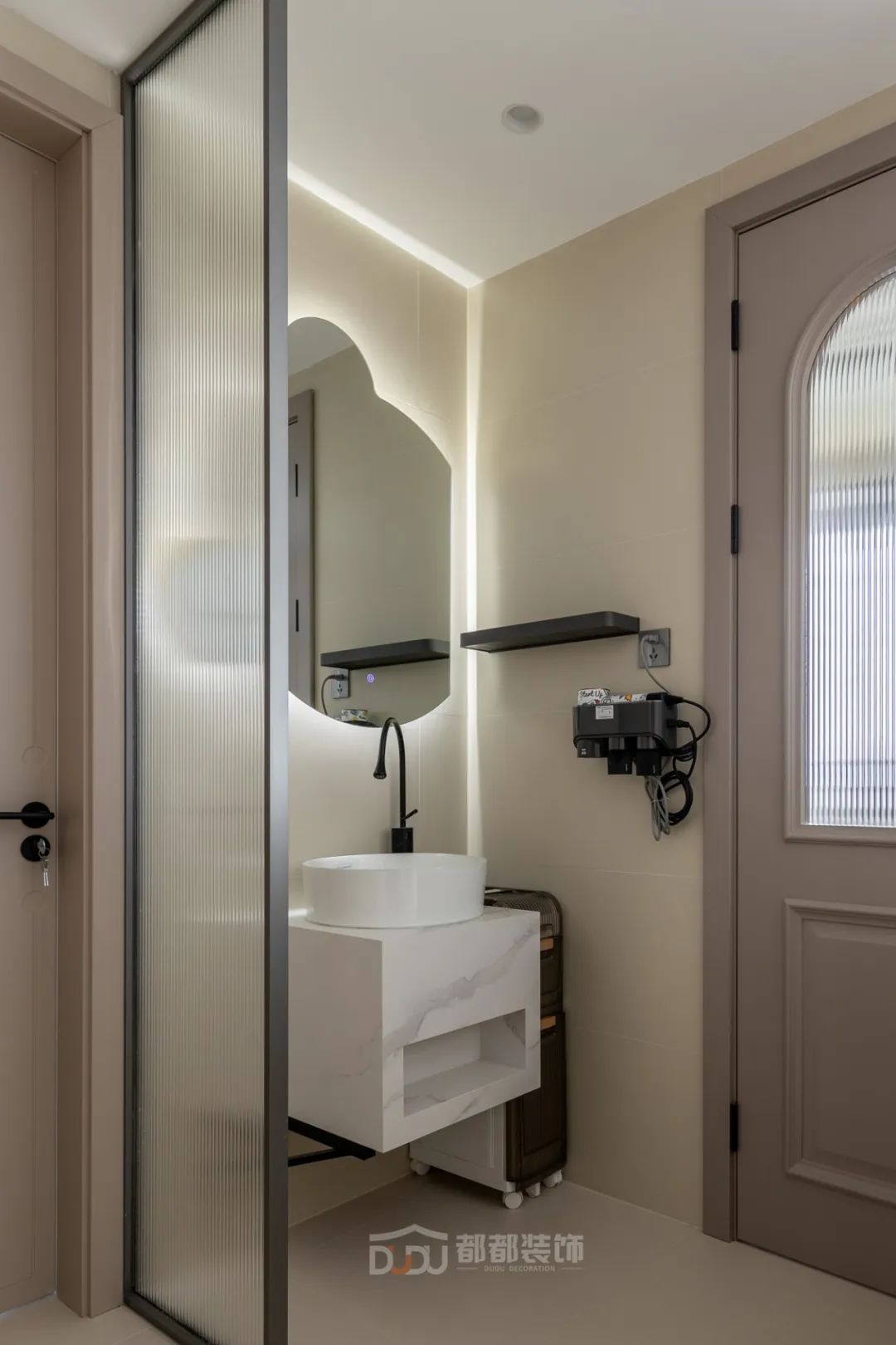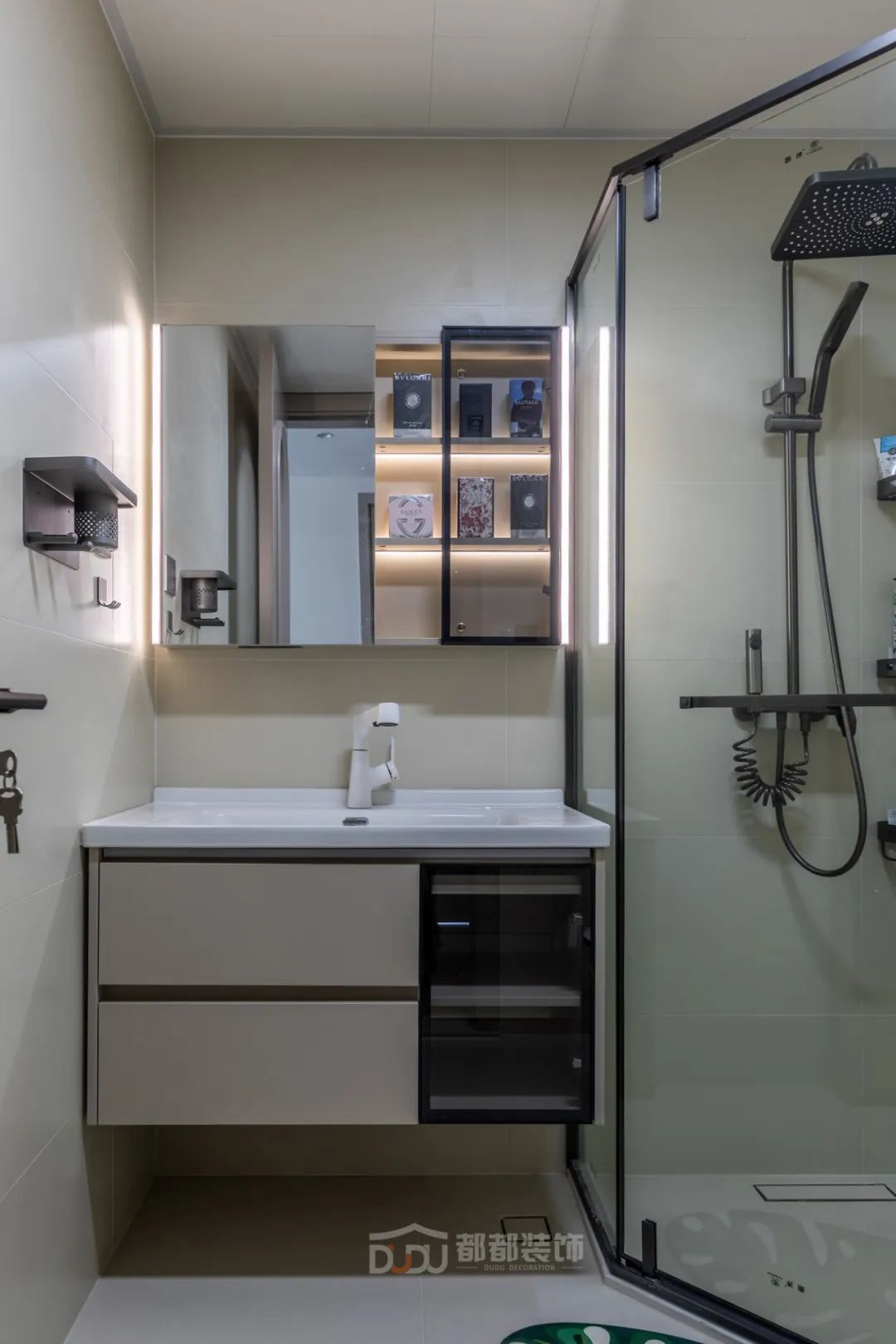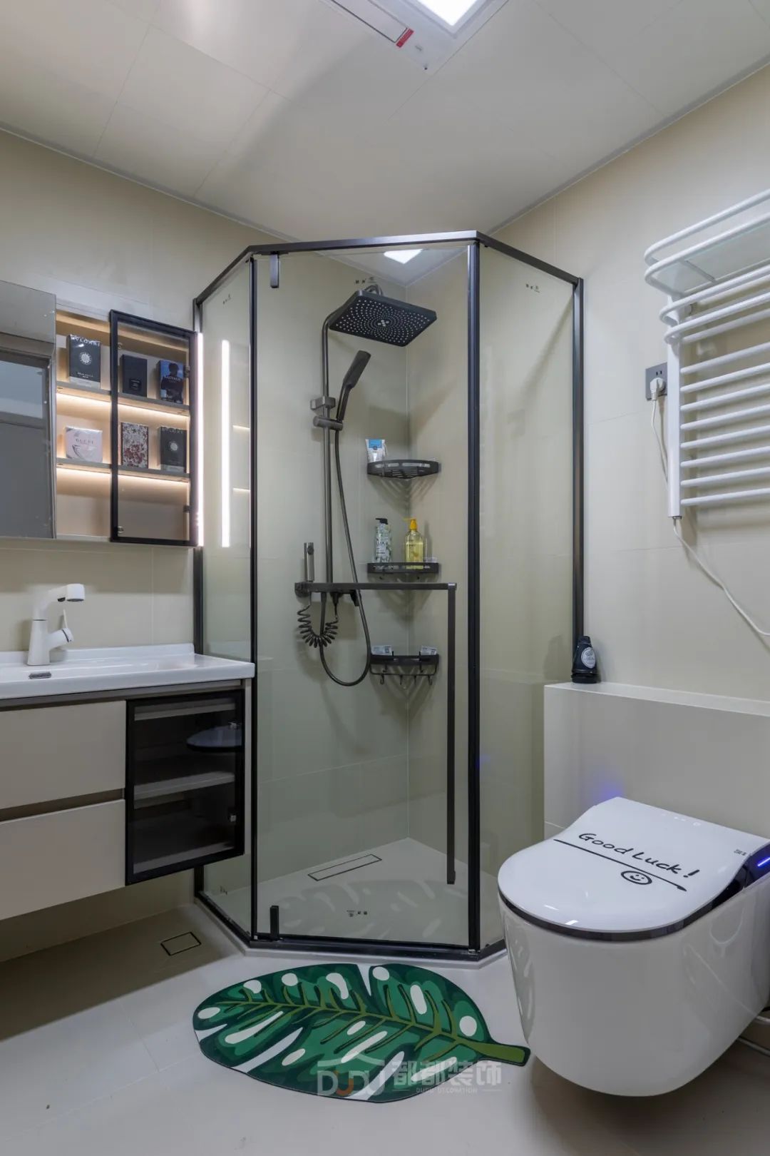 卫生间空间不大,用浴房做干湿分离,悬空式洗漱台、马桶,便于清洁。
