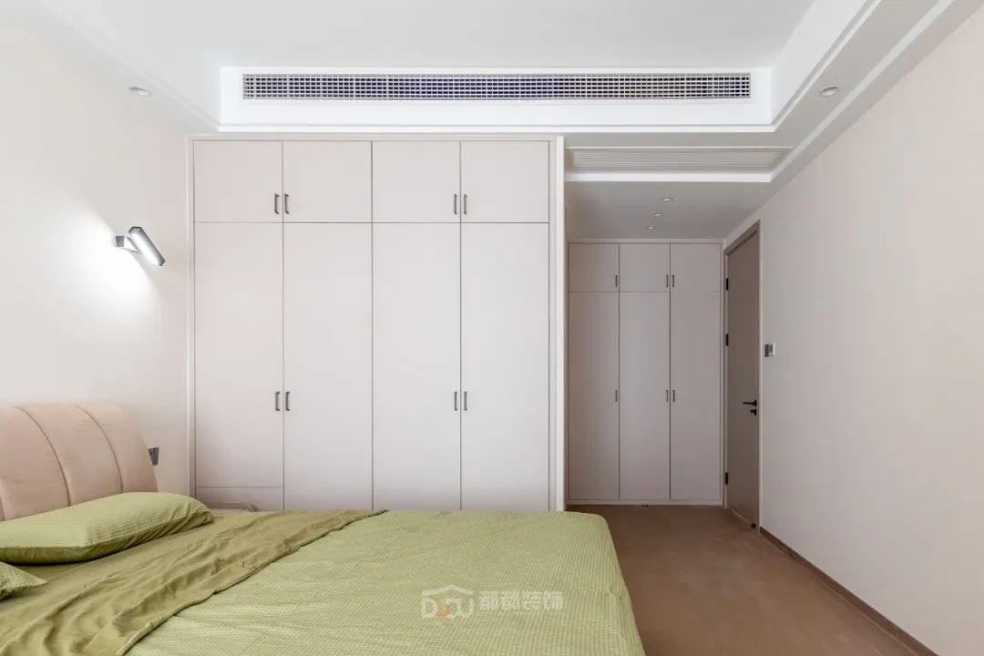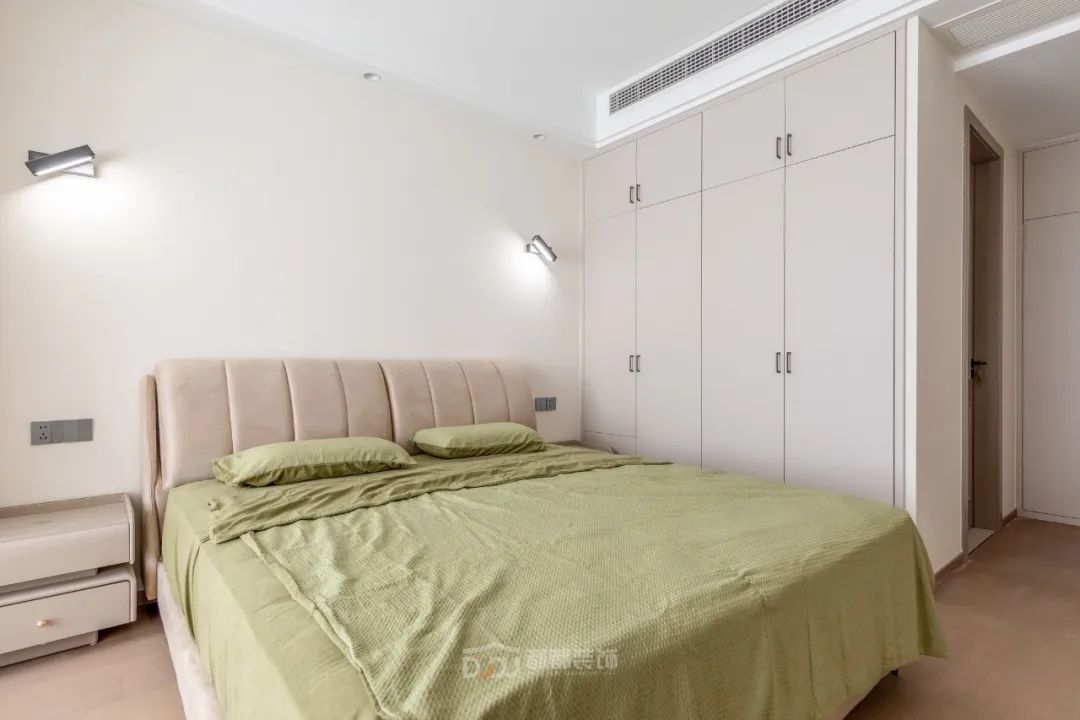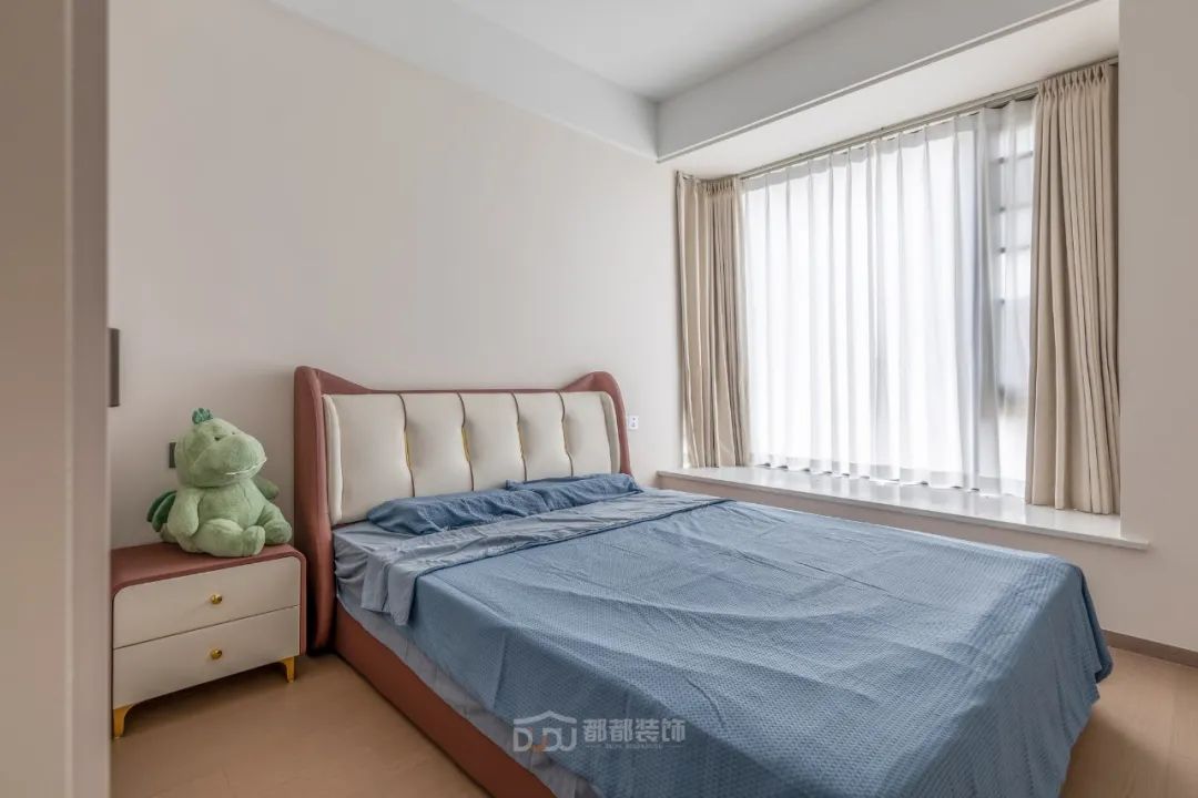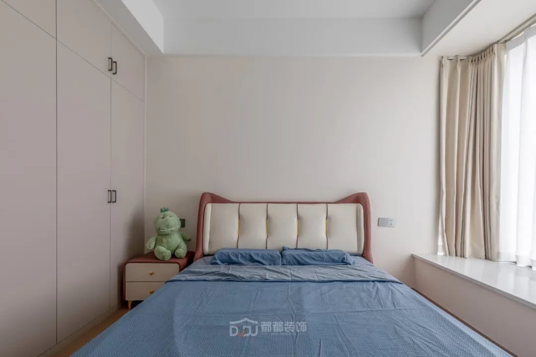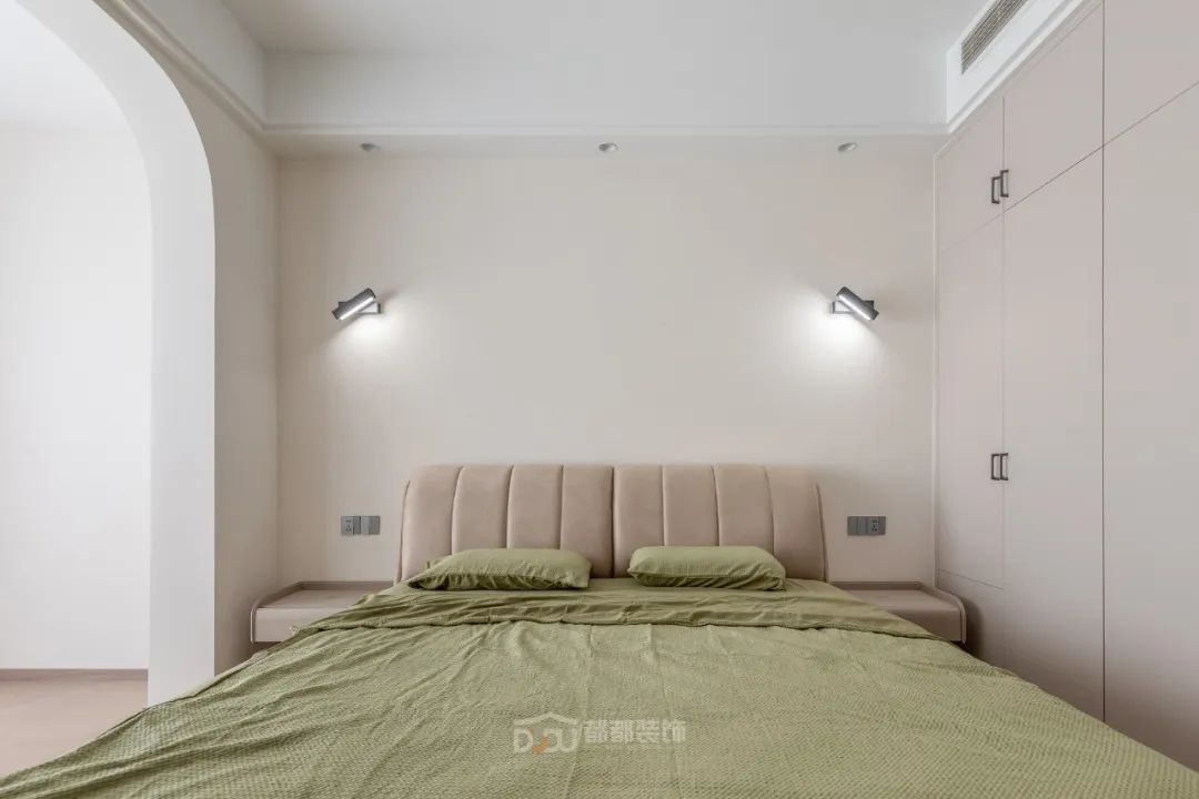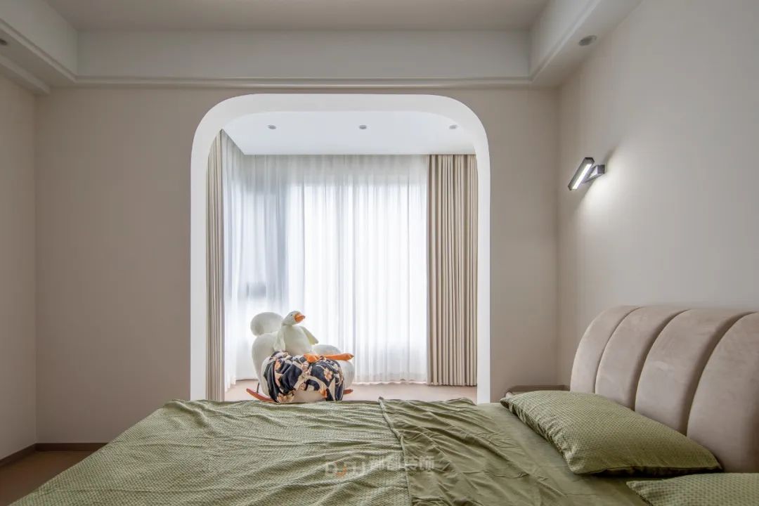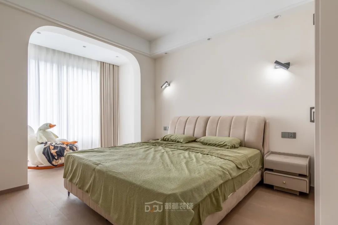 主卧选用了木质地板和与房间主色调契合的浅咖色软包床,整体让人感觉十分温暖舒适;窗台的拱门造型是整个空间变得更加优雅,光线不是很充裕却更加适合房间的氛围,非常适合休息。