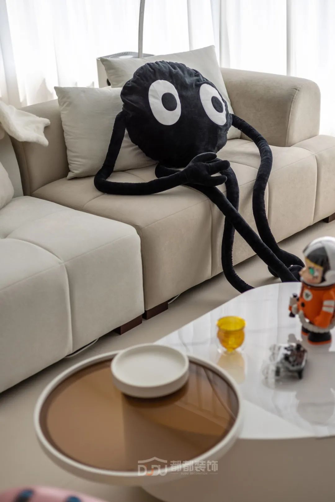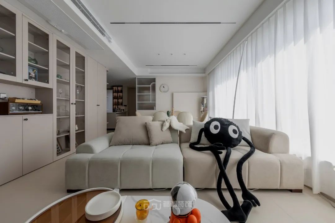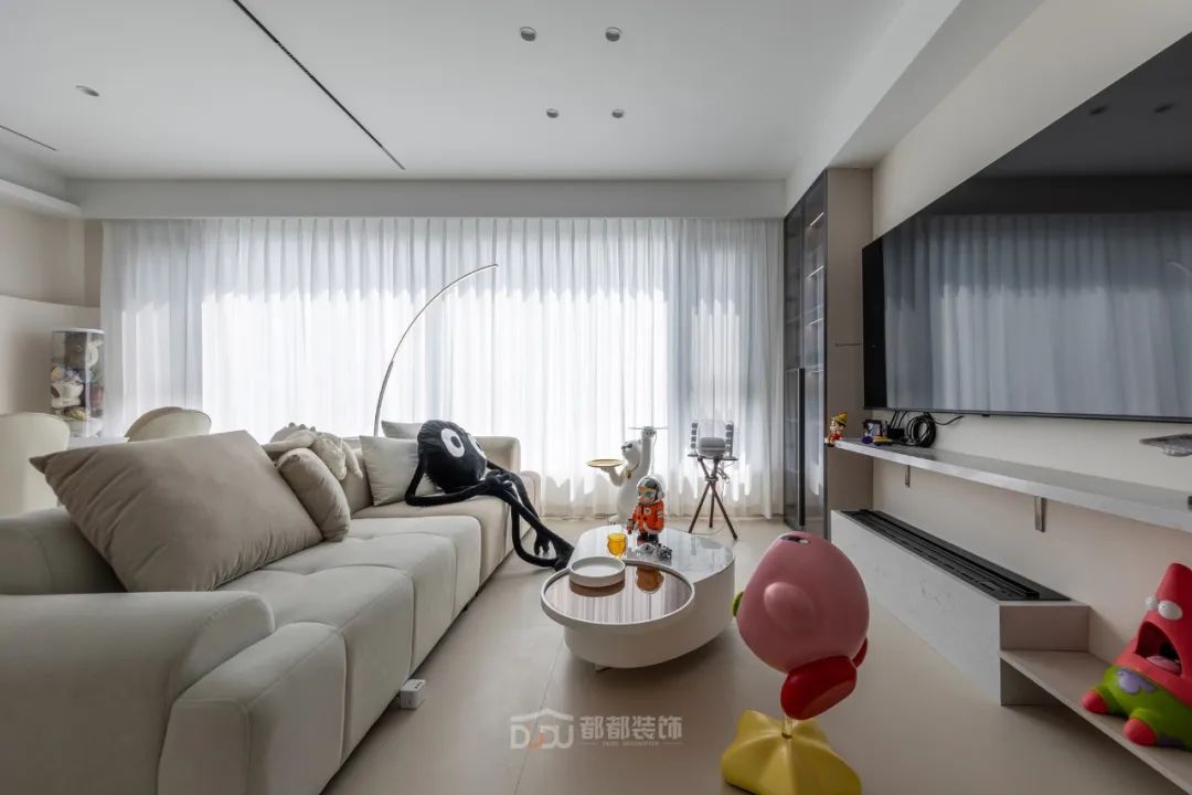 客厅使用浅咖色、米白色等奶油色调来营造轻松舒适的氛围感;奶咖色地砖奠定了整个空间温馨和谐的基调,阳光在白色纱帘后忽隐忽现,整个空间呈现慵懒放松的气氛,可以让人的身心完全解放,这正是家的意义。