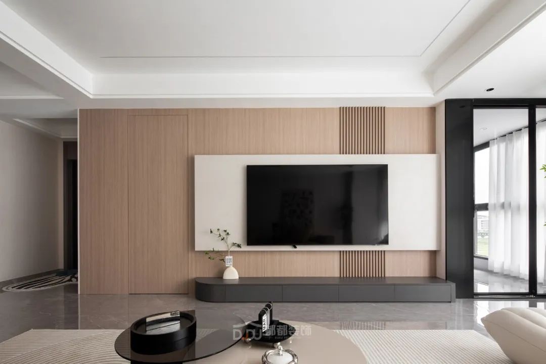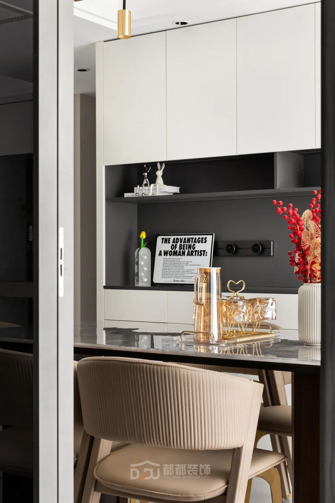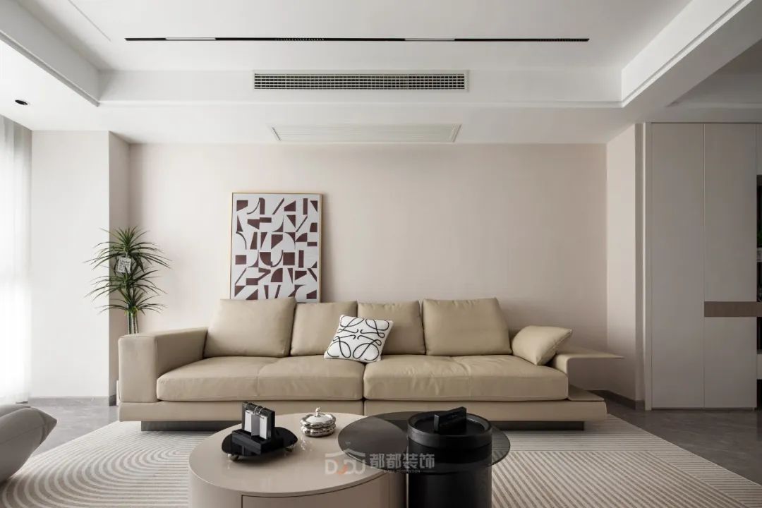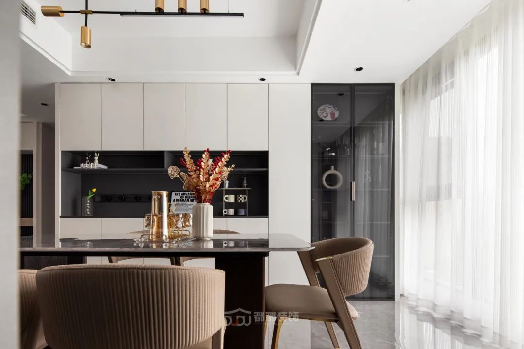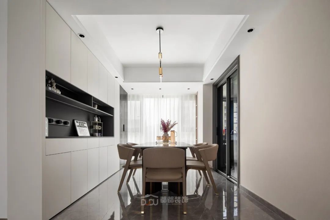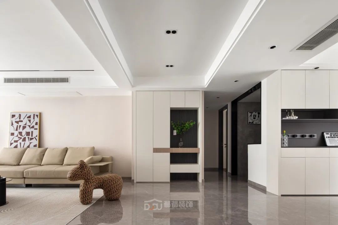 一进门就感受到被温暖包围的惬意感,白色无把手玄关柜,光滑整洁,搭配中空的棕木色开放格和线条感装饰画,为家增加几分优雅的气息,柜体下方悬空,换鞋免去开关柜门,上方台面可放置随手物品或装饰小物。