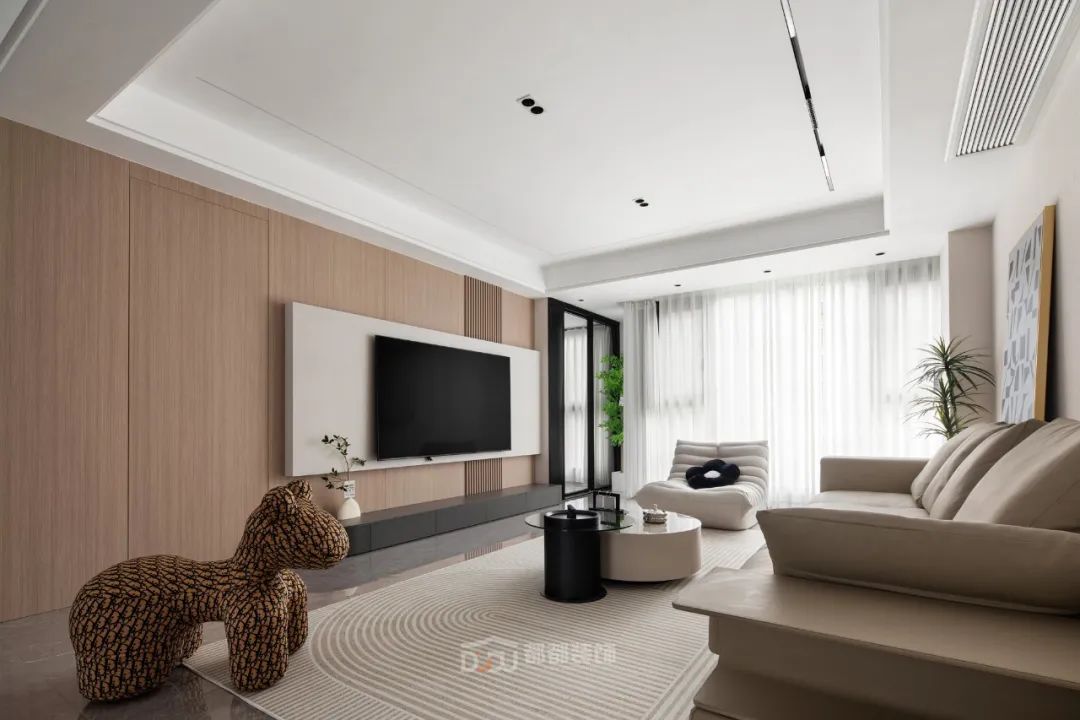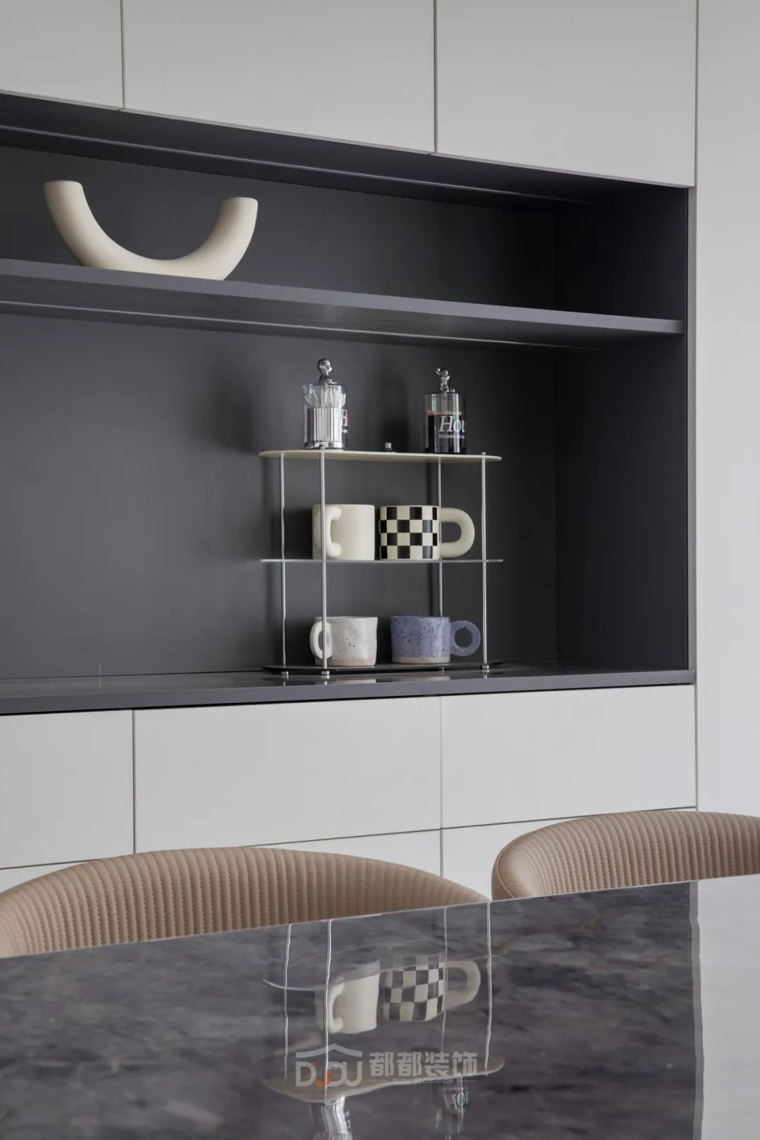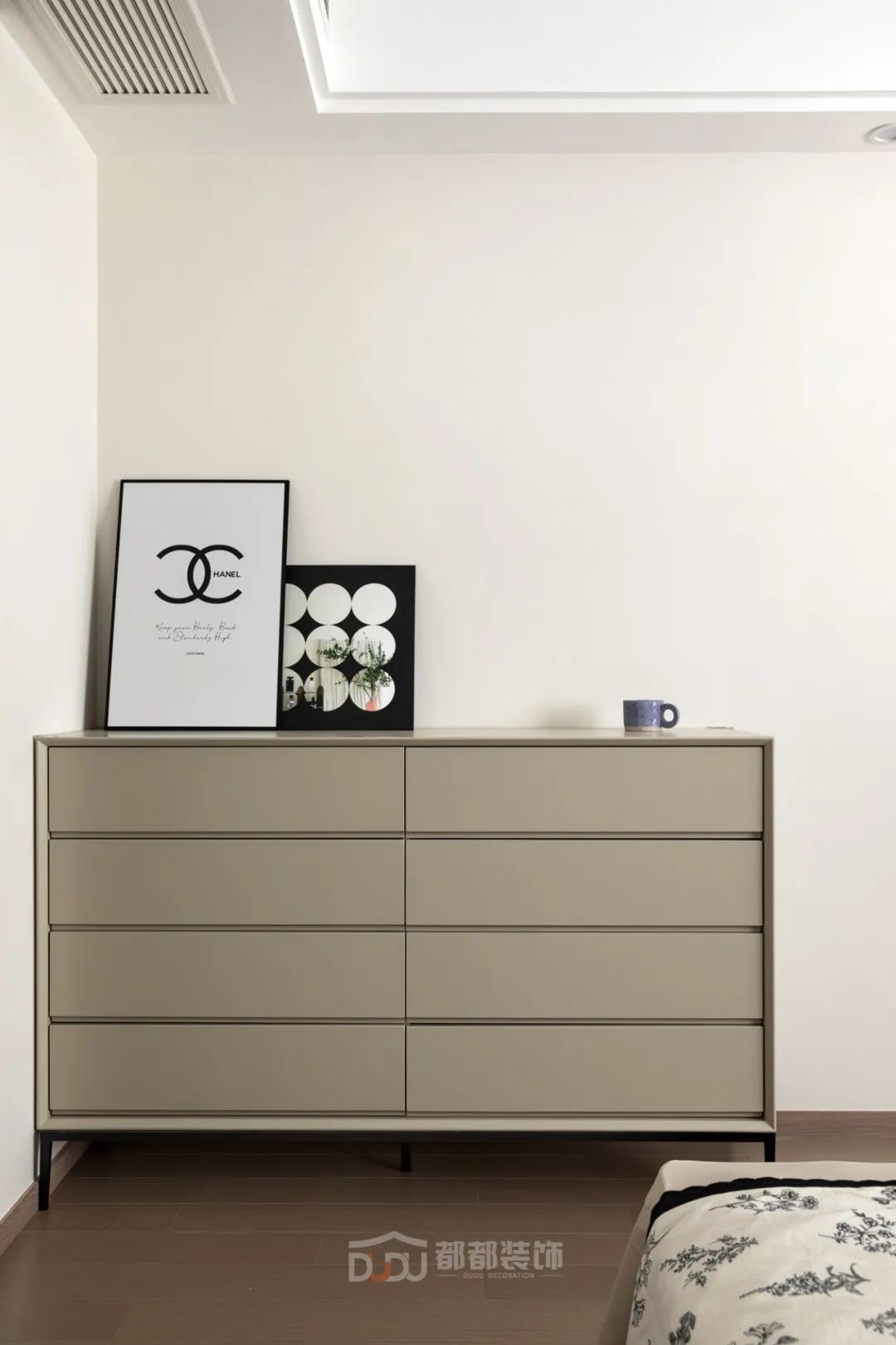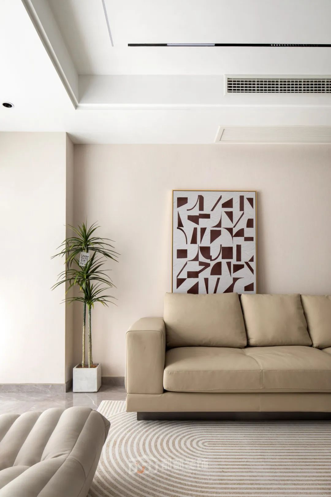 一进门就感受到被温暖包围的惬意感,白色无把手玄关柜,光滑整洁,搭配中空的棕木色开放格和线条感装饰画,为家增加几分优雅的气息,柜体下方悬空,换鞋免去开关柜门,上方台面可放置随手物品或装饰小物。