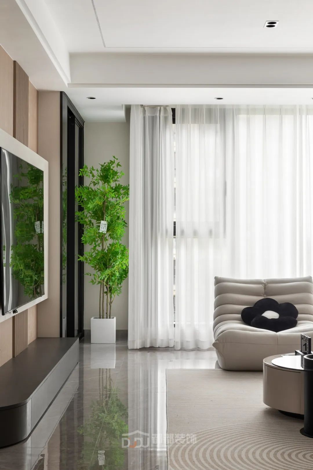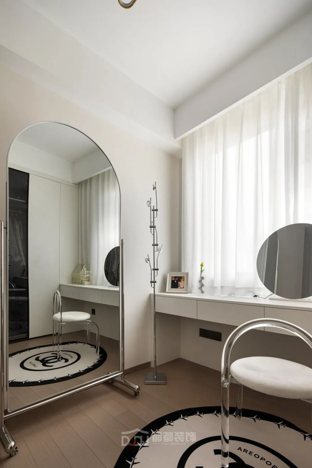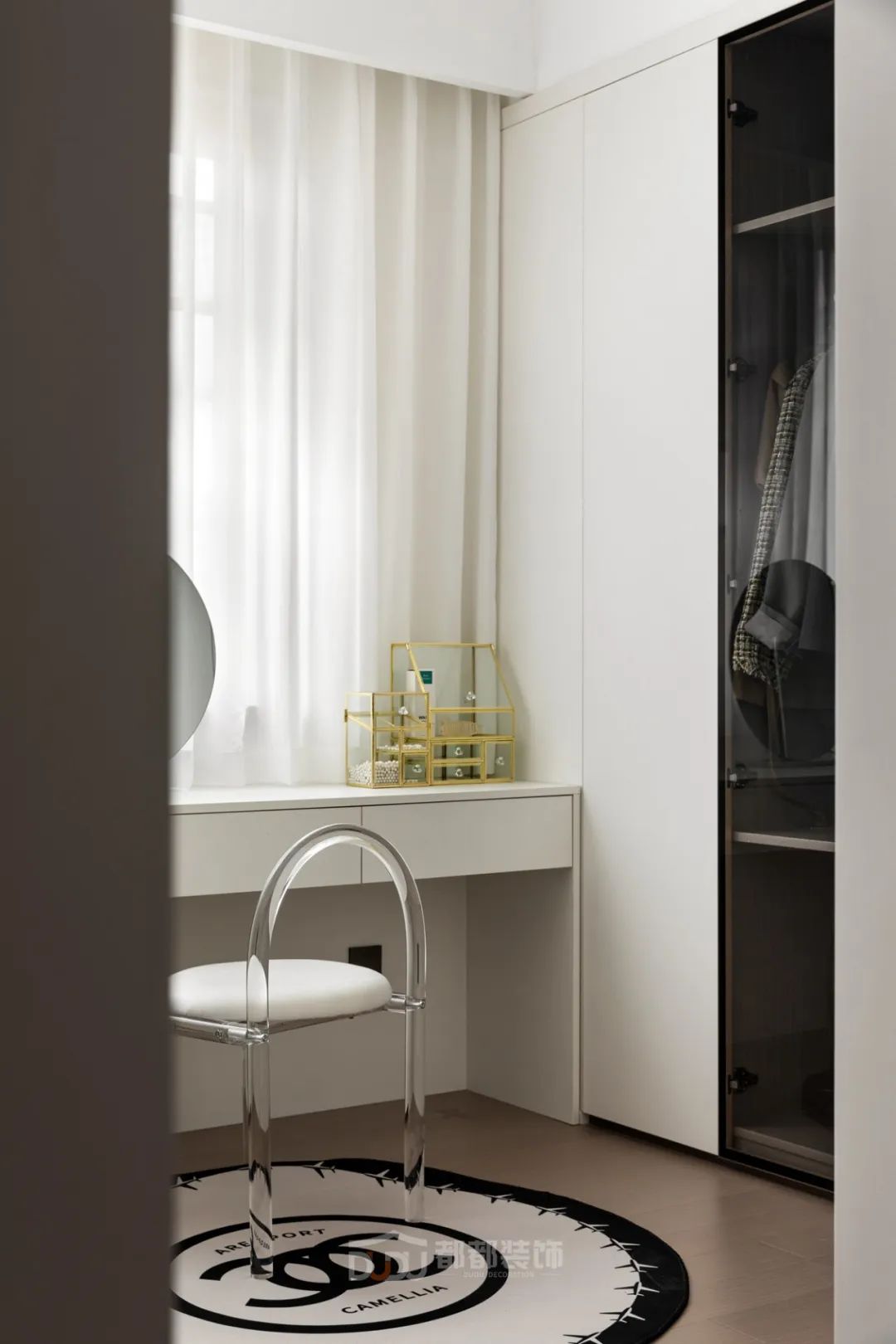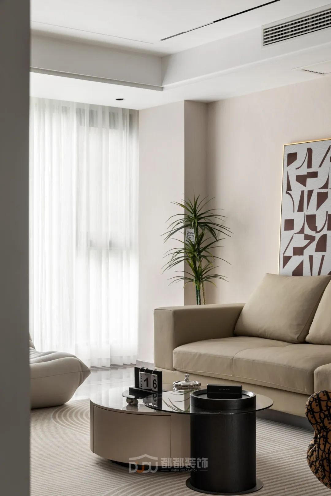 一进门就感受到被温暖包围的惬意感,白色无把手玄关柜,光滑整洁,搭配中空的棕木色开放格和线条感装饰画,为家增加几分优雅的气息,柜体下方悬空,换鞋免去开关柜门,上方台面可放置随手物品或装饰小物。