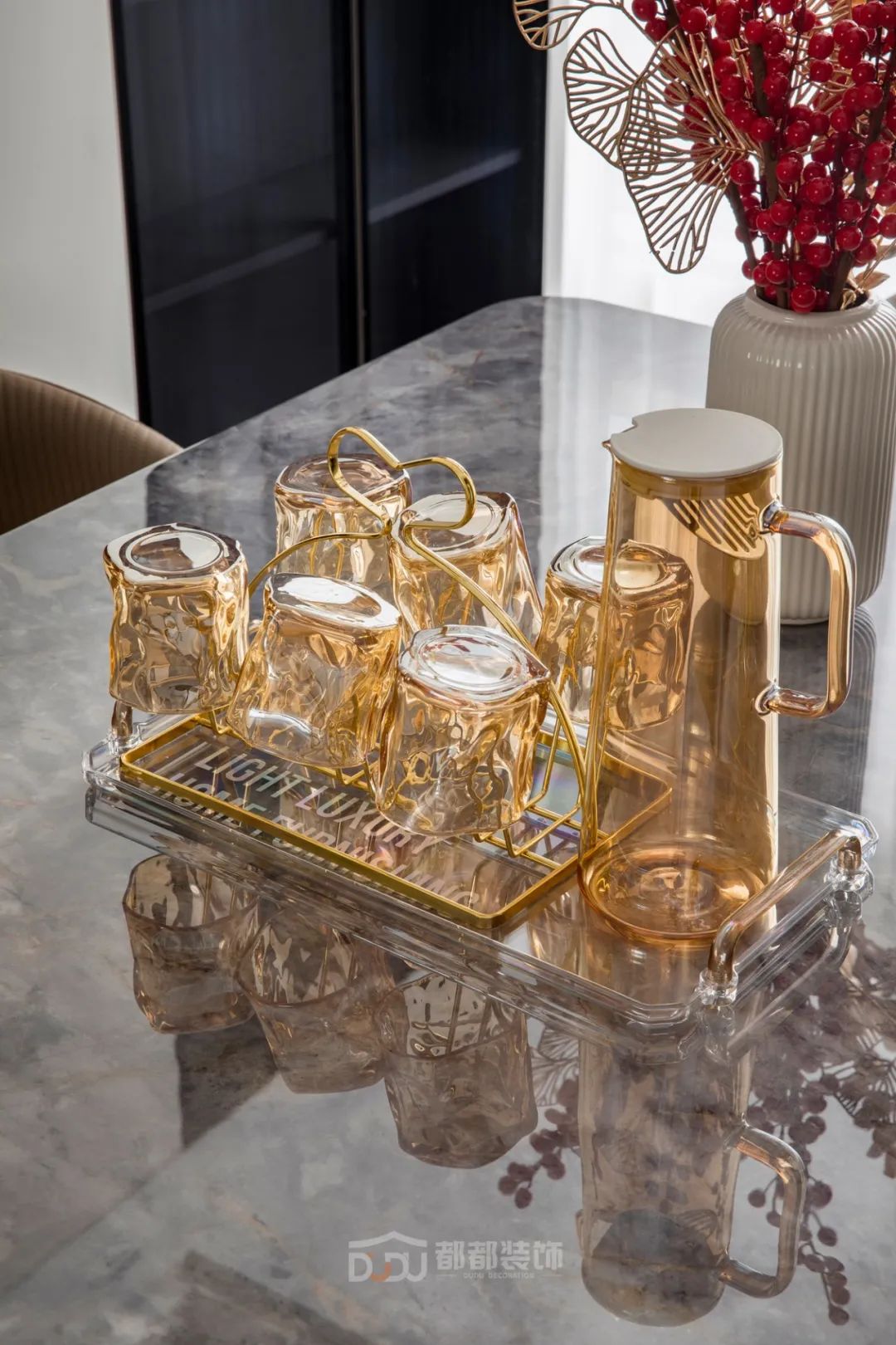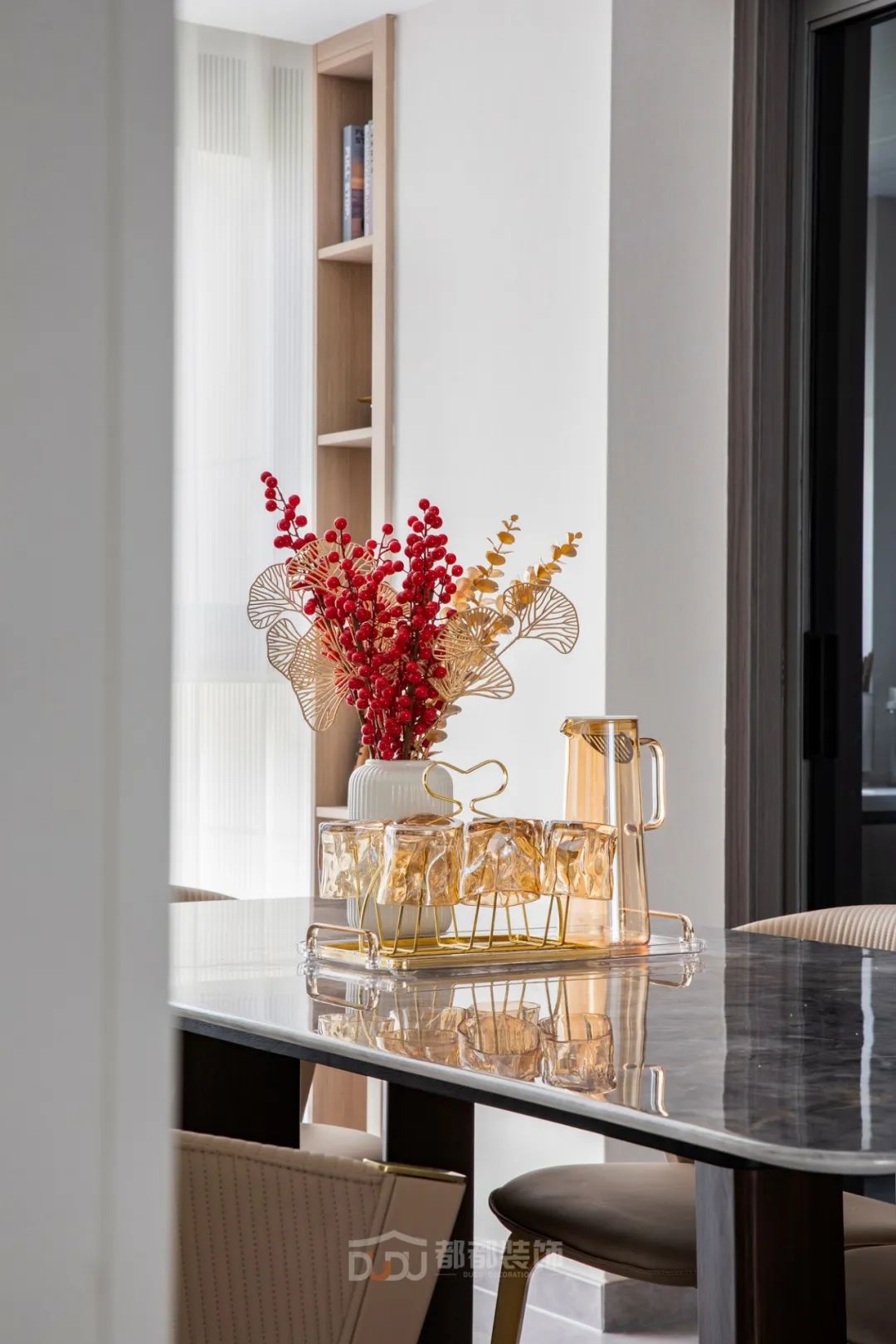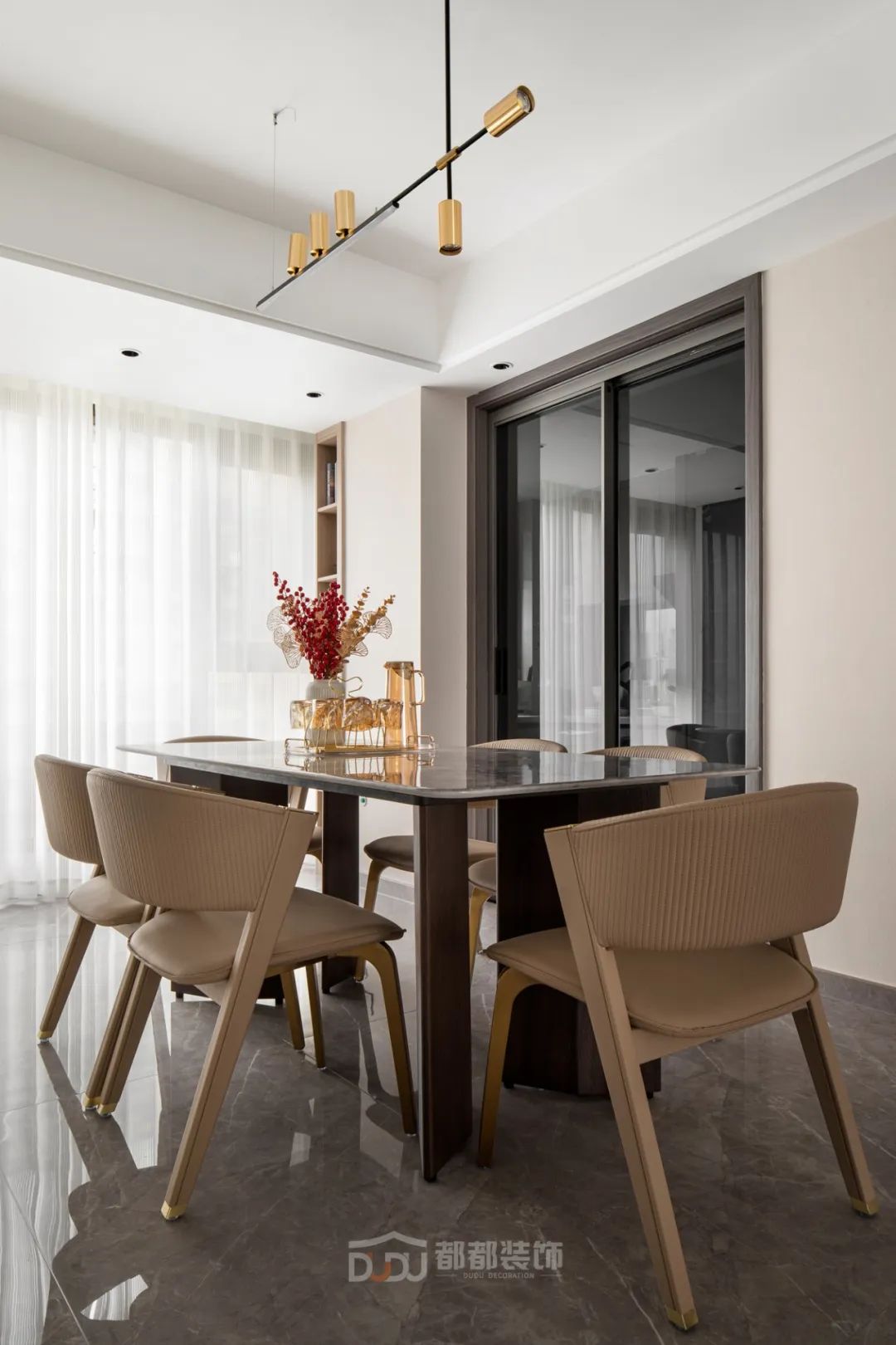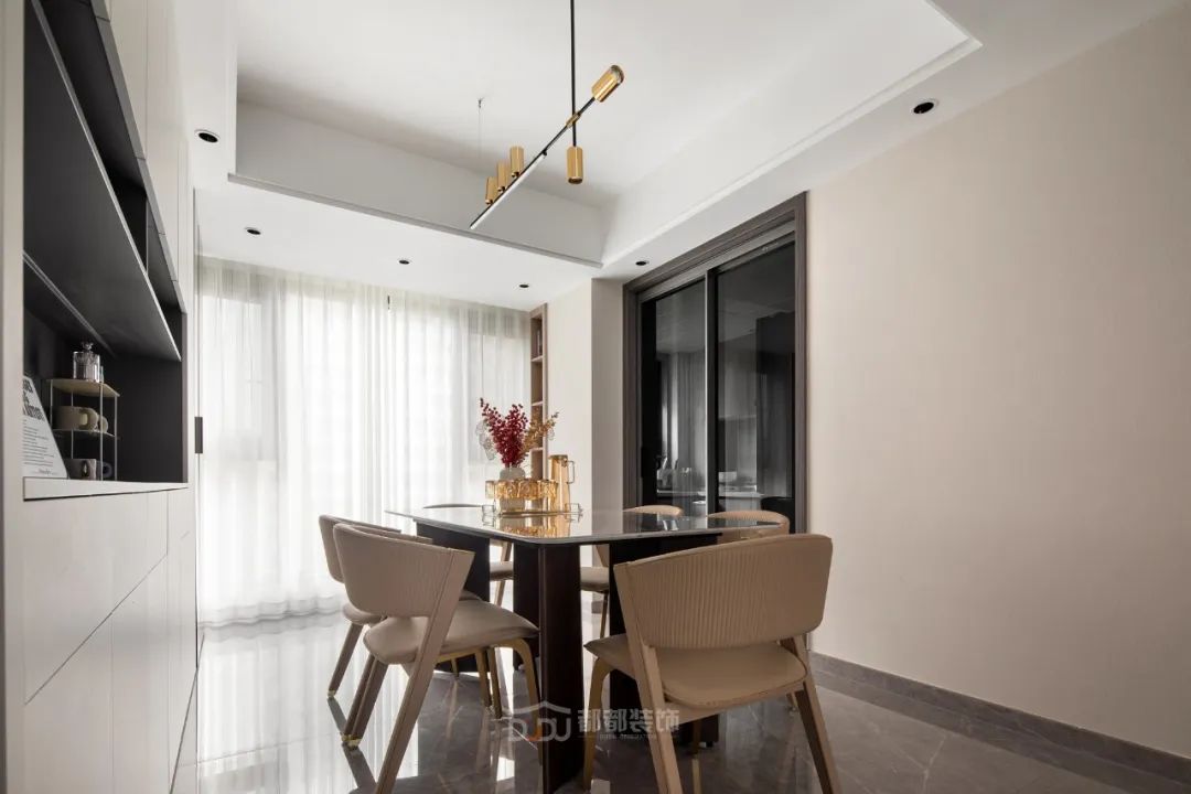改造后的餐厅,从进家开始就能看到这张方形餐桌,它与客厅形成大的LDK一体设计,一张灰色大理石餐桌,加上浅咖色餐椅,配着线性的吊灯,营造出正式的餐厅观感,红彤彤的植物将效果拉满。