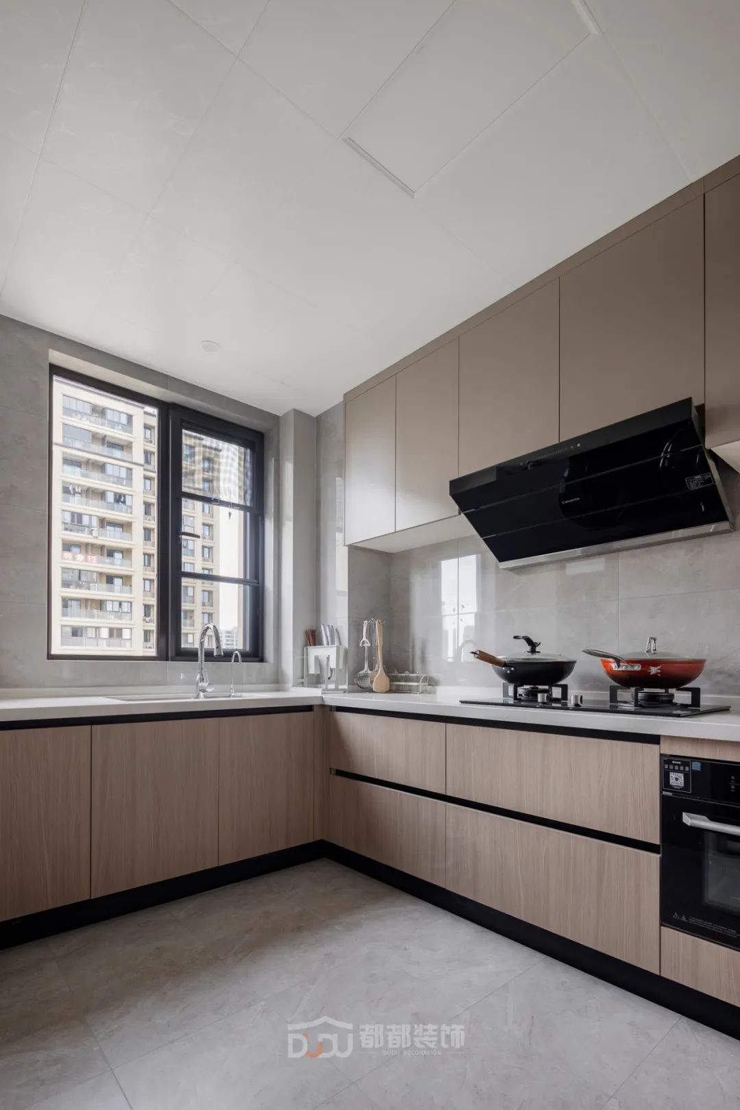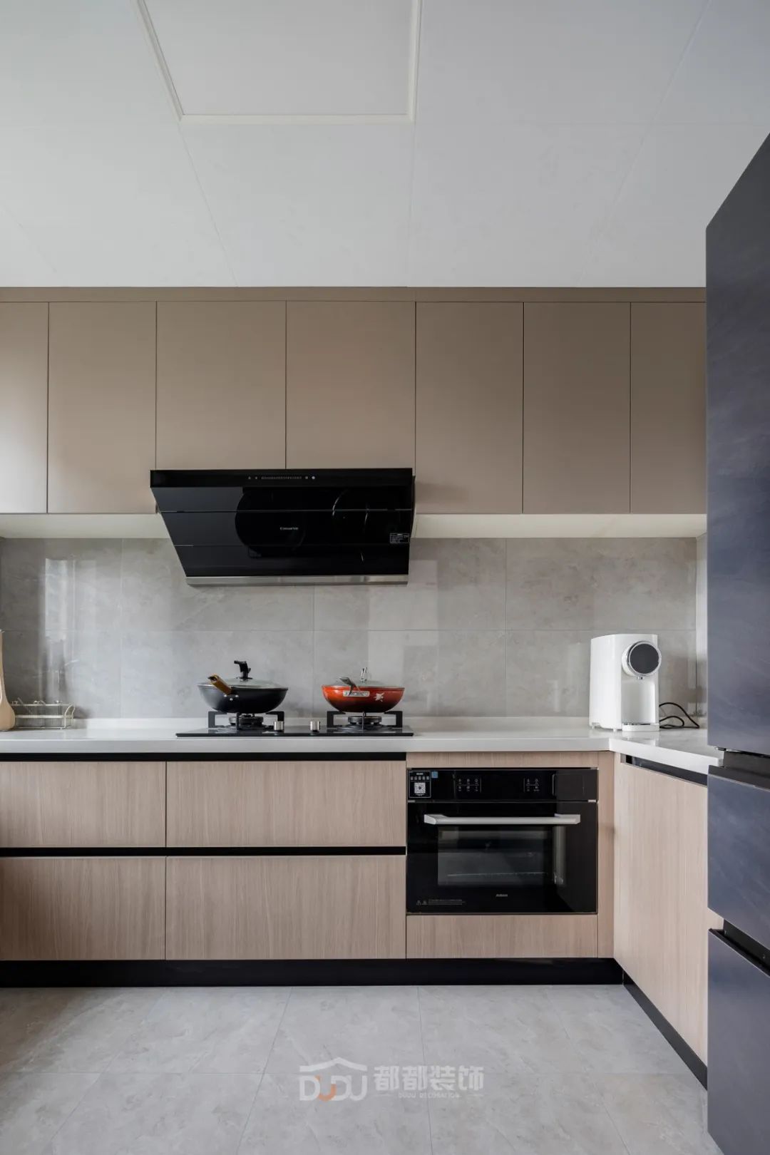 厨房大理石墙面、原木色橱柜组合成空间的体块,有一种低调简约的质感,U型的对称布局增加了操作台的面积,靠墙设计收纳系统,将冰箱嵌入,放眼望去有一种协调的美感,靠近过道区的是洗菜区,台面深度800mm,加宽设计用起来更方便。
