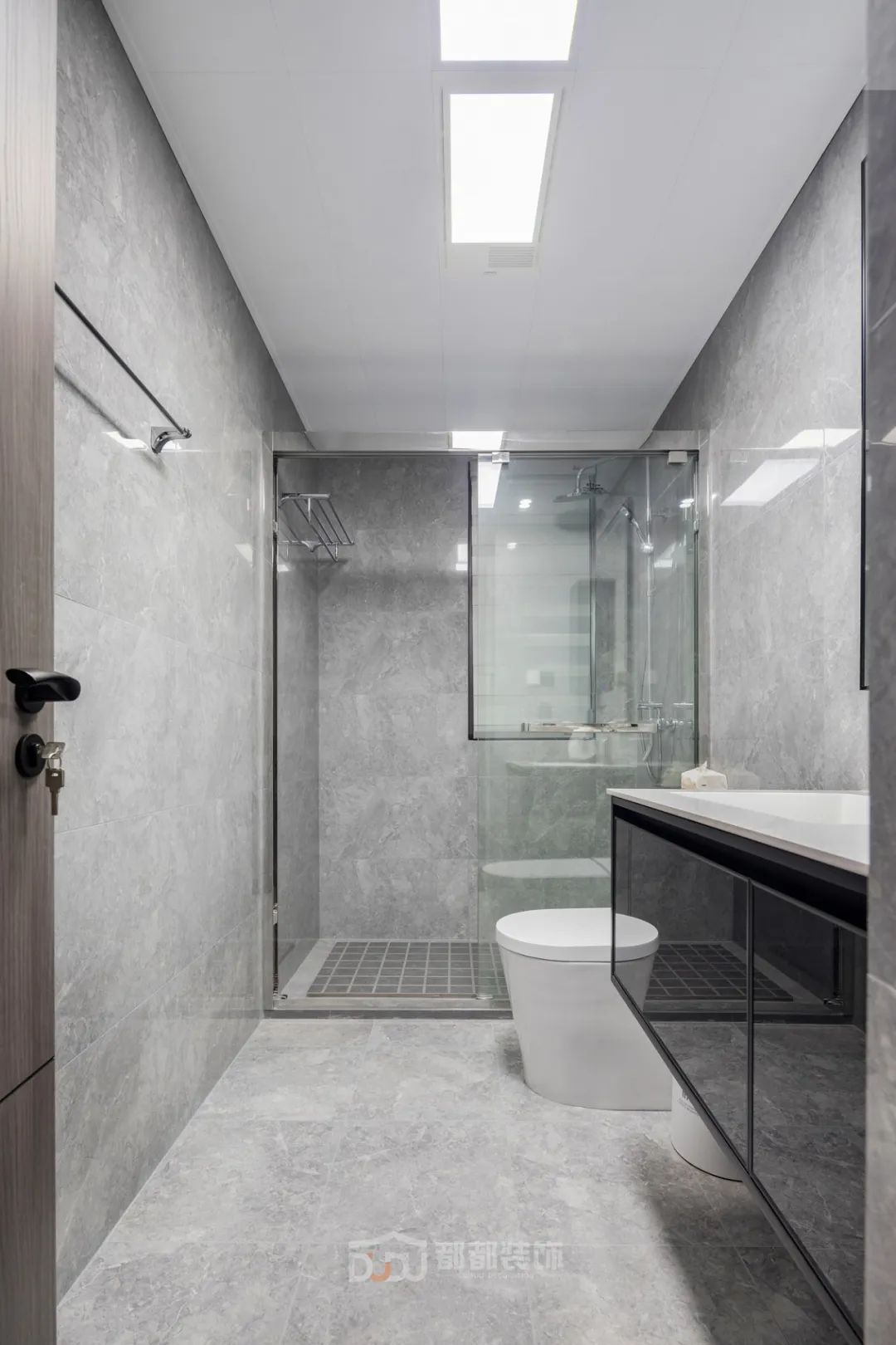 家里的卫生间空间不大,墙面、地面都是采用灰色大瓷砖,耐脏好打理,同时经典耐看,卫生间干湿区做了玻璃隔断,洗漱台柜面积很大,日常生活用品的囤货都可以收纳在里面,美貌与实力并存。