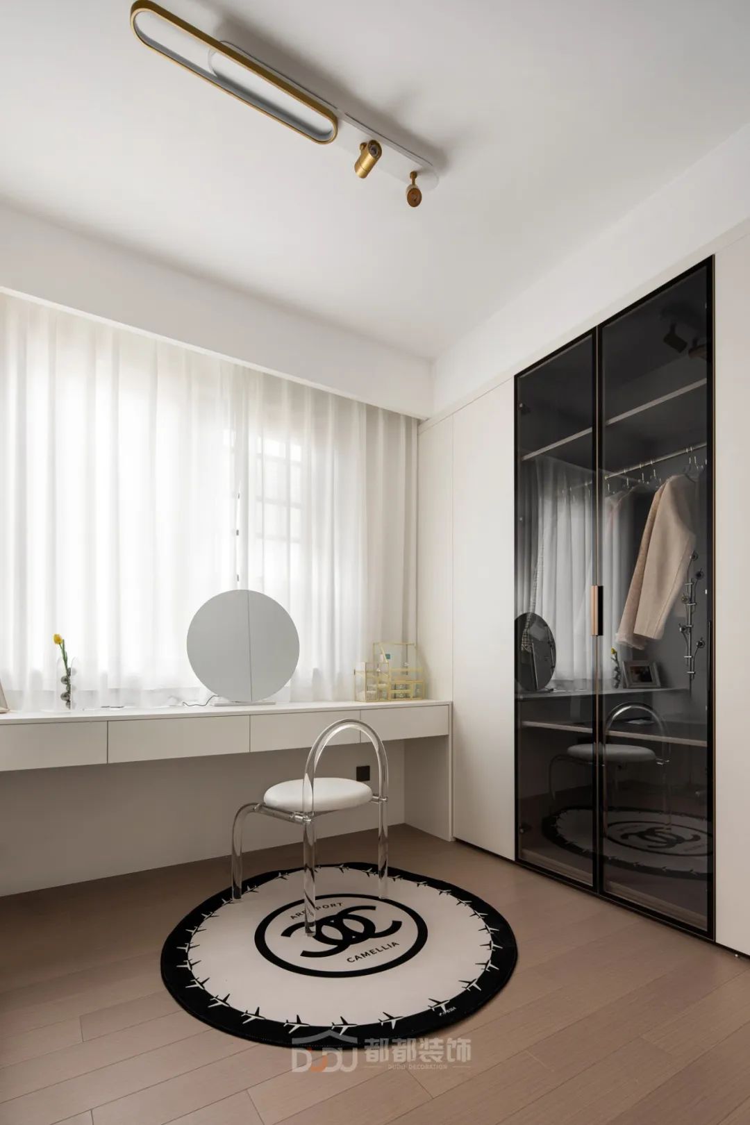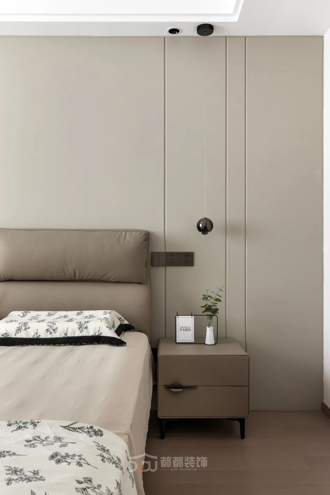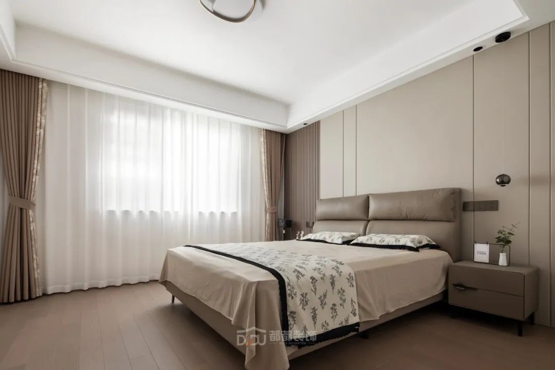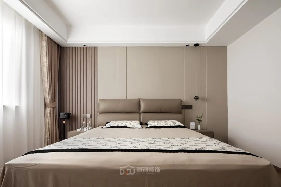 移步至主卧室,清新效果迎面而来,全屋是深浅的摩卡棕色,一盏简约复古的装饰吊灯,围合个性又温馨的睡眠区。