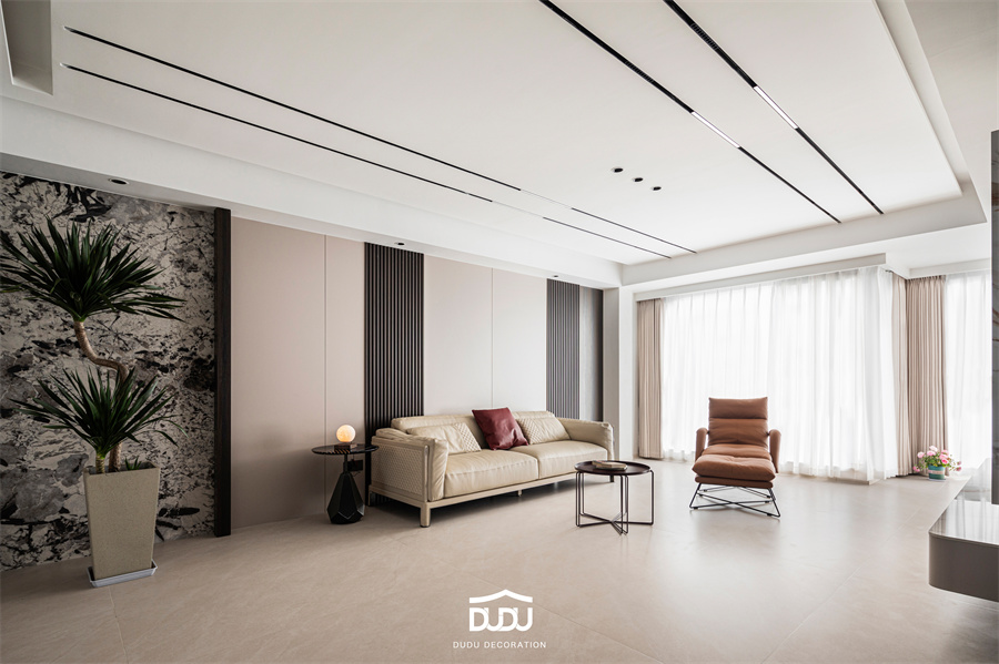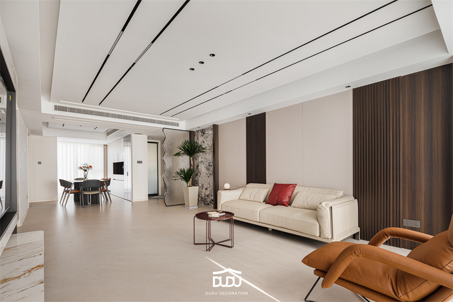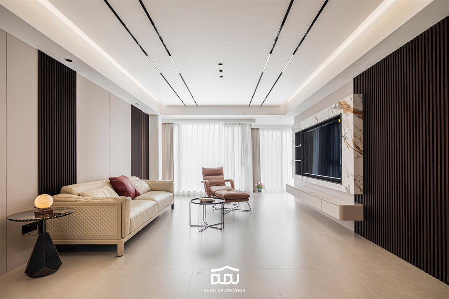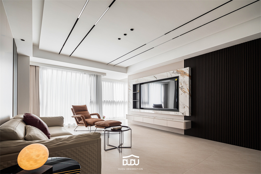 客厅摒弃了传统的主灯设计,整个空间通过巧妙布局的辅助灯光营造出温馨又富有格调的氛围。天花板上,嵌入式筒灯均匀分布,散发出柔和而均匀的光线,照亮整个空间;隐藏在吊顶四周的灯带,发出暖黄色的光晕,为空间勾勒出灵动的轮廓,增添温馨之感。