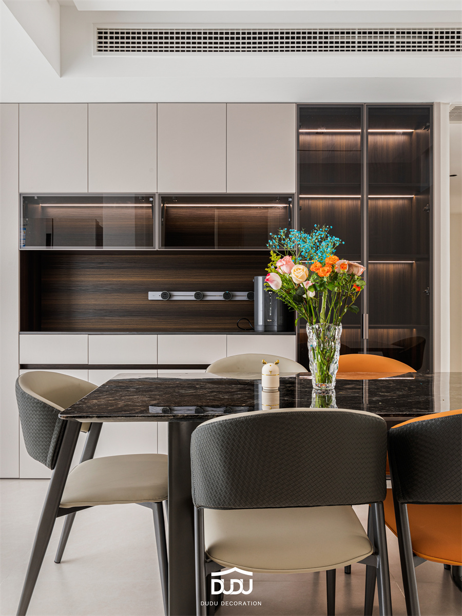 橱柜采用米白色的平板式门板,简洁的线条没有一丝多余的装饰,拉手选用隐藏式设计,不仅使整体外观更加流畅统一,还避免了日常磕碰,同时也完美契合现代风追求简约的理念。