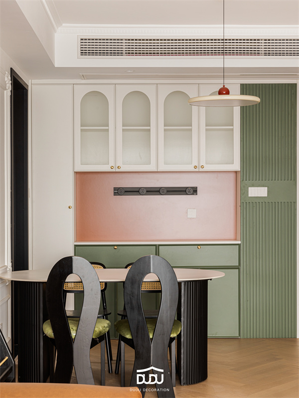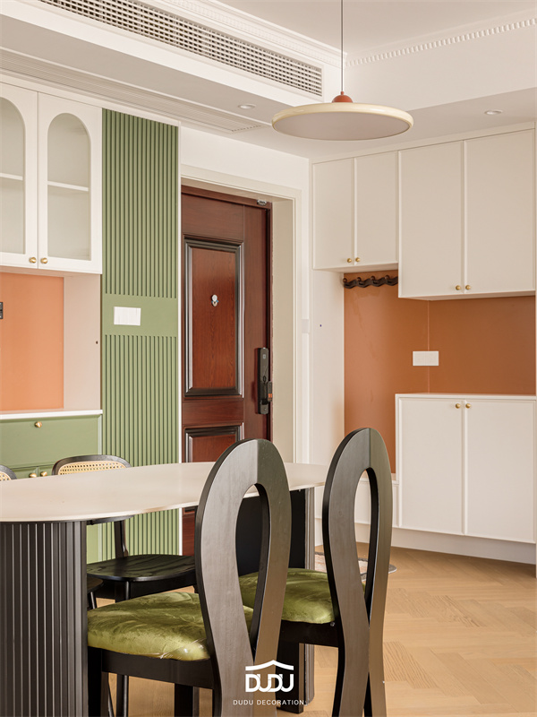 餐厅鱼骨拼的木地板,因为有颜色渐变所以更显高级感,黑色原木餐椅则是给空间增加了朴素气息;橙红+墨绿餐边柜,整体设计色调温暖活泼,舒适感由然而生。