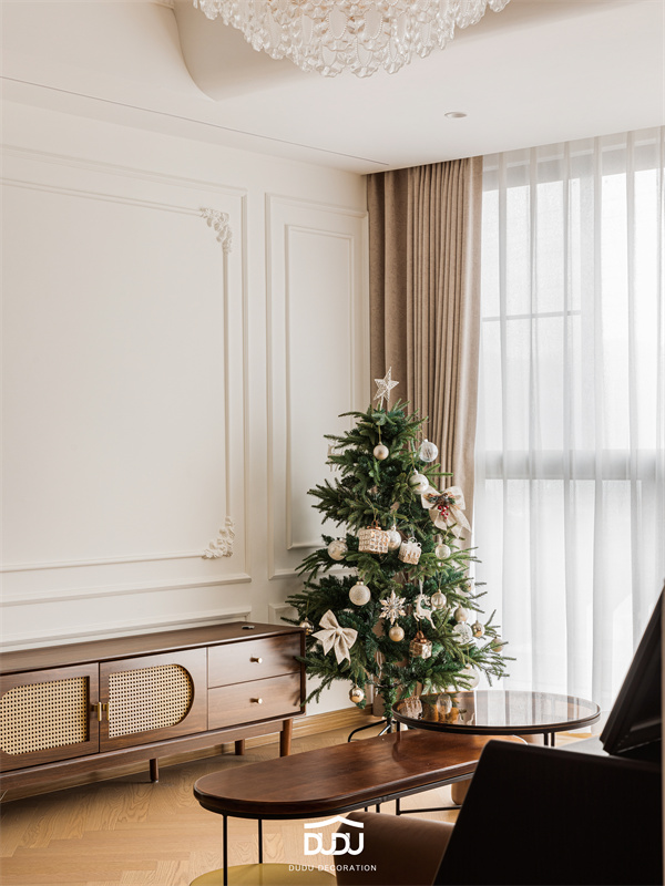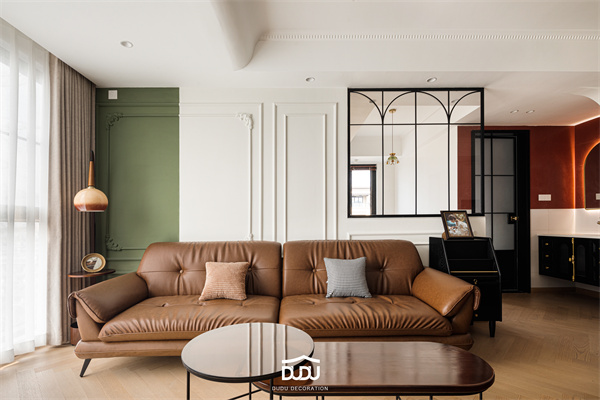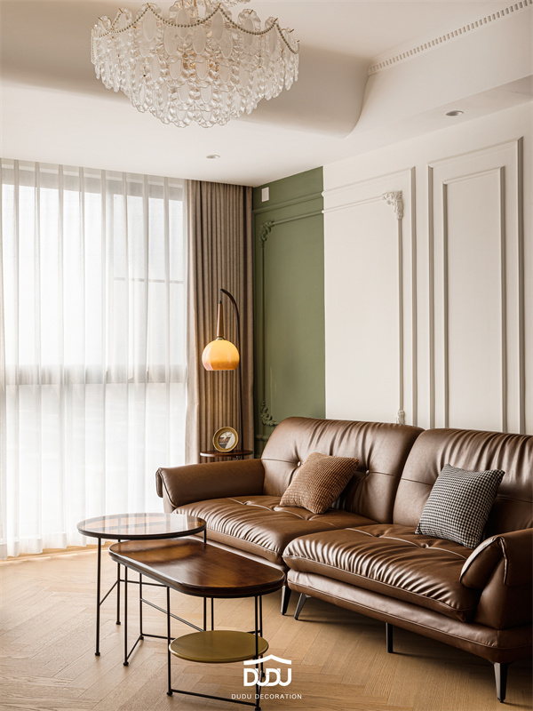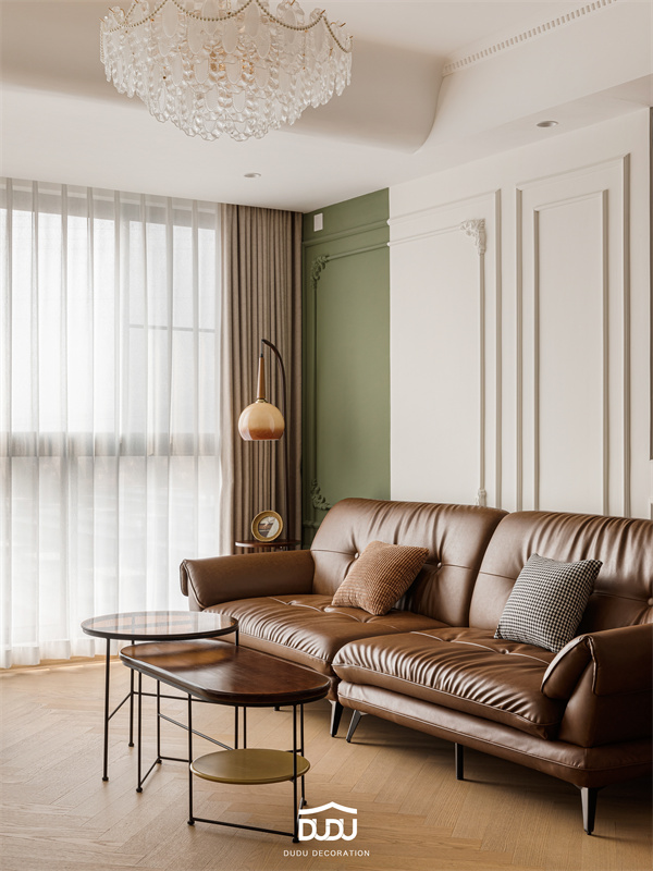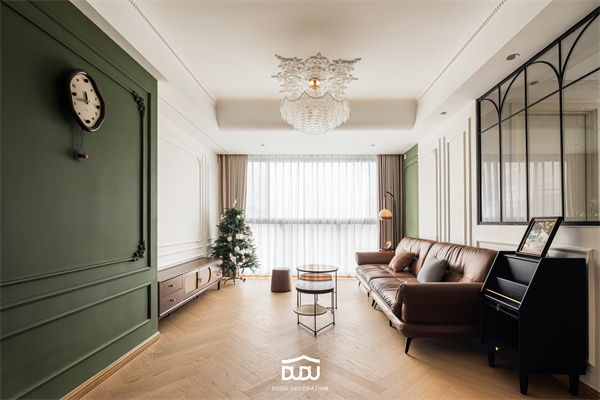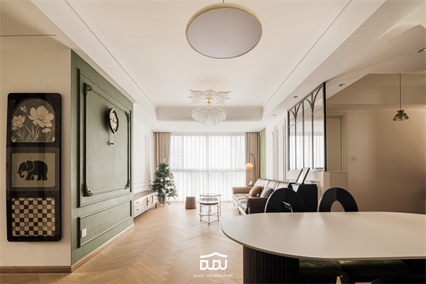 客厅以奶油色为基底,利用pu线条、角花和复古灯饰等法式元素,为空间奠定了雅而不缀的视觉感受。同时利用复古绿+棕色系元素打破精装房的单一乏味,给家注入独特精致的味道。