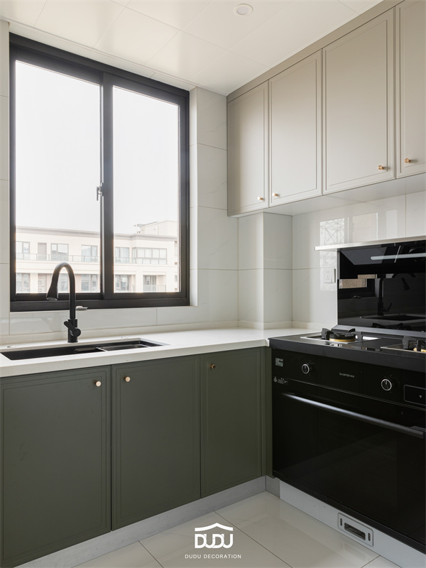 黑白调的厨房空间开阔大气,U型操作台面布局动线流畅,深绿色柜门+圆形黄铜色把手,实用的同时更具有空间艺术感,玻璃门窗的加入可以让厨房通透。