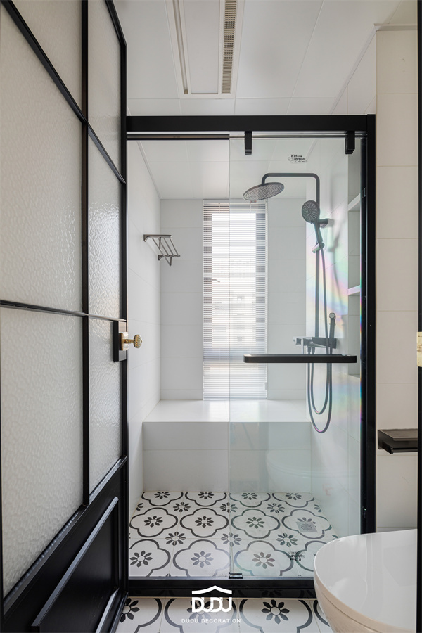 干区镜子后的壁灯散发着柔和的光芒,为这里增添了一份复古氛围,亮红色背景和黄铜元素的精致点缀,则在低调中尽显奢华与美学的融合。湿区采用了复古精致的小花砖,令原本单调的空间变得丰富而有立体感,更有生活乐趣。
