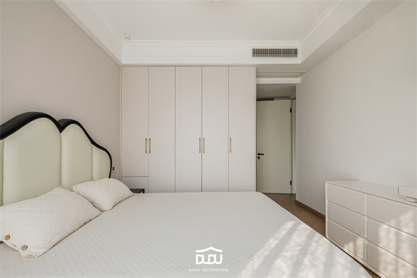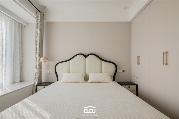 次卧整体采用奶杏色结合纯洁的白色,给予空间干净明朗的通透感;从软包床到法式花苞吊灯,精致有味的轻法式元素,为睡眠空间带来了浓郁的艺术雅韵。