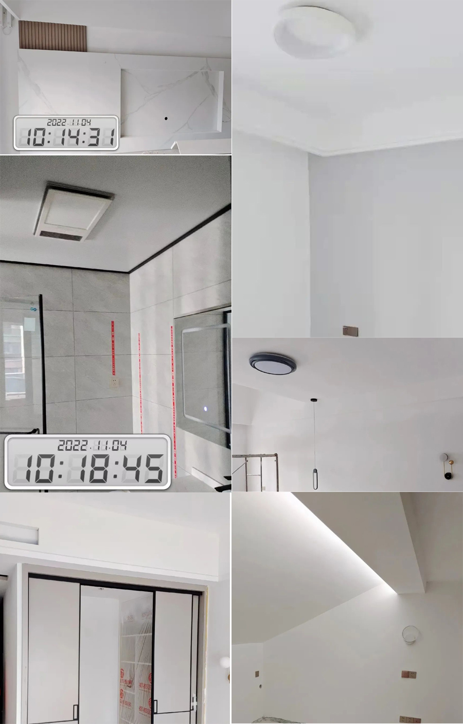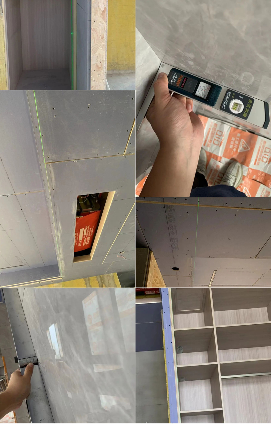 施工前先彩绘放样,放养式根据图纸吊顶尺寸墙面弹好水平四线:吊顶完成面线、开关完成面线、地面完成线、门头线。
