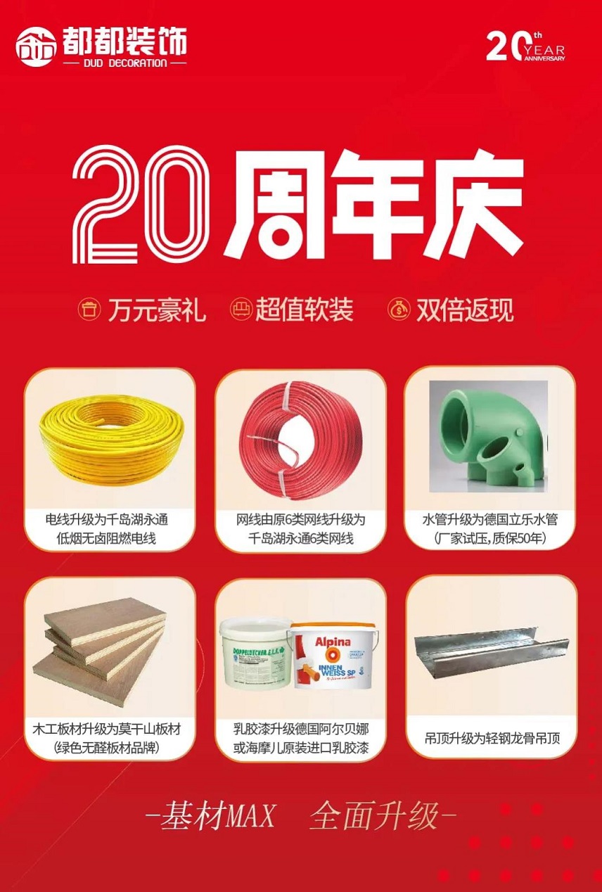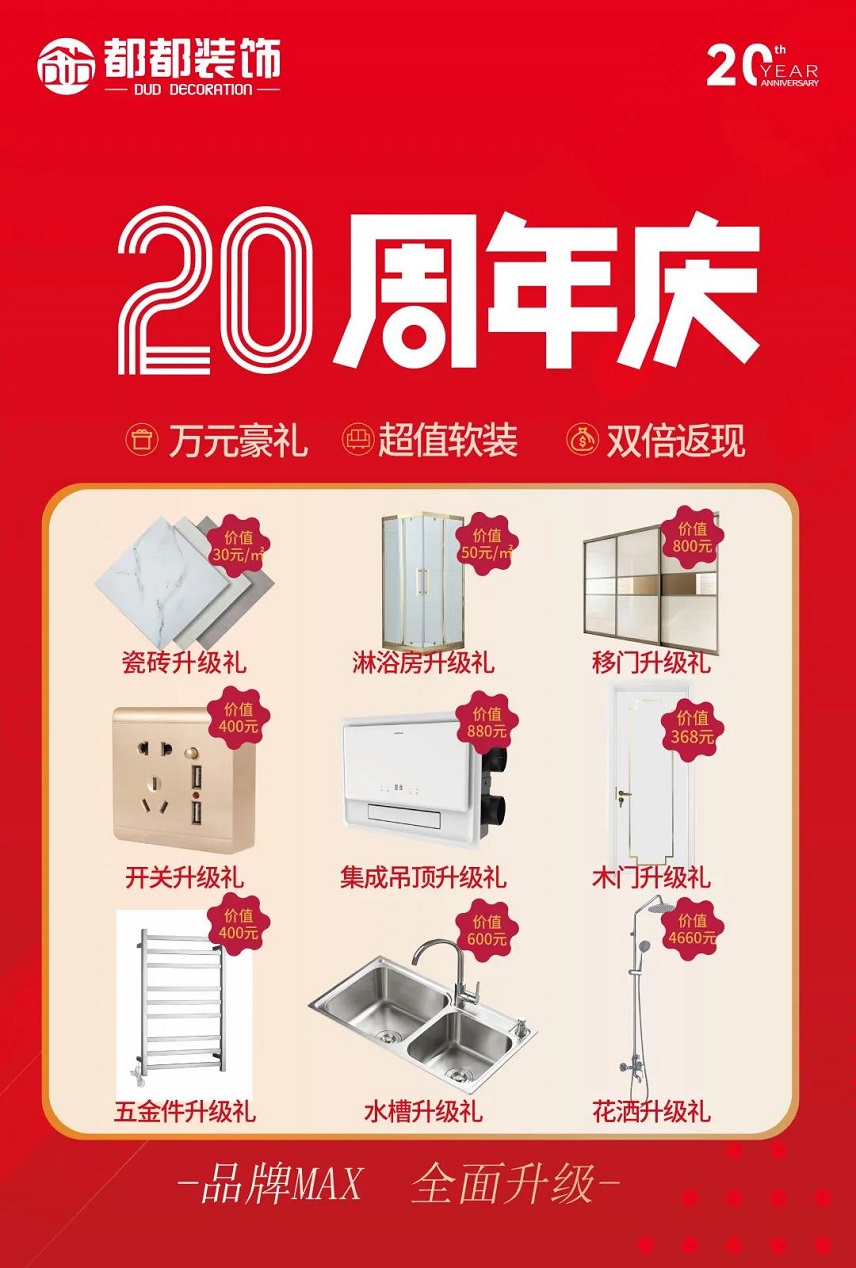 都都装饰二十个春秋的栉风沐雨,历久弥新。从平平无闻到家喻户晓,业主的每一次选择和认可,都是我们的勋章,这些年来,我们服务了40000+客户,好评率高达98.6%这些年来,我们不断创新工艺,死磕细节,从聆听尊重业主的每一个小想法,到精工制作成一套套爱意满满、梦想中的家。这些年来,凡能工巧匠者,最大的欣慰都是客户住进新家后欣喜又满意的神情。为回馈新老客户,本次周年庆的优惠豪礼小编双手奉上!